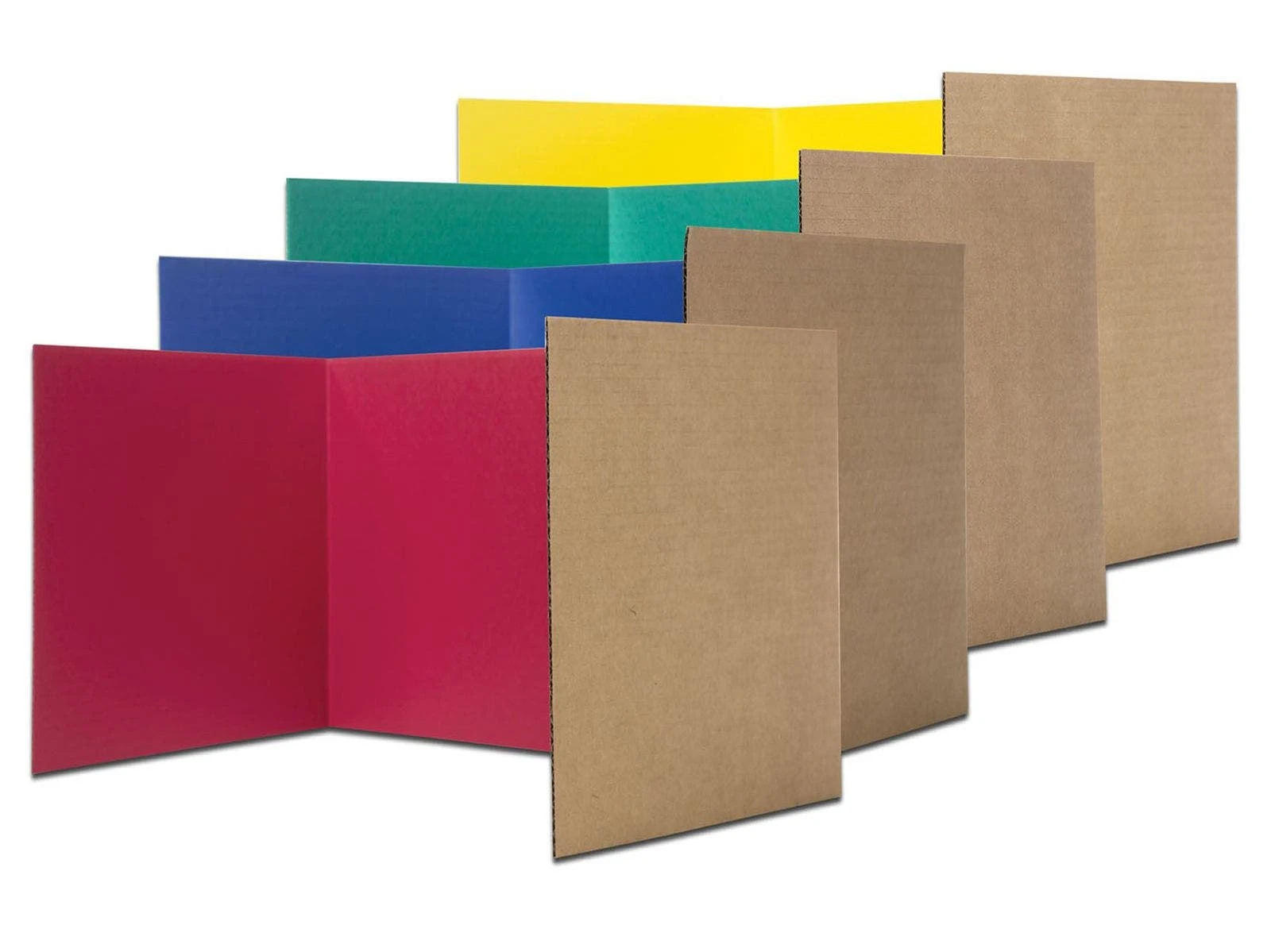 Trifold design provides ample protection and allows guards to fold in, then flat for storage. Four colors brighten the room and make it easy to organize groups. Side panels measure 12-3/4”W, center panel is 22-1/2”W, and overall width is 48”W. Overall height is 18”H. Set includes 24 (6 ea red, blue, green, yellow).
