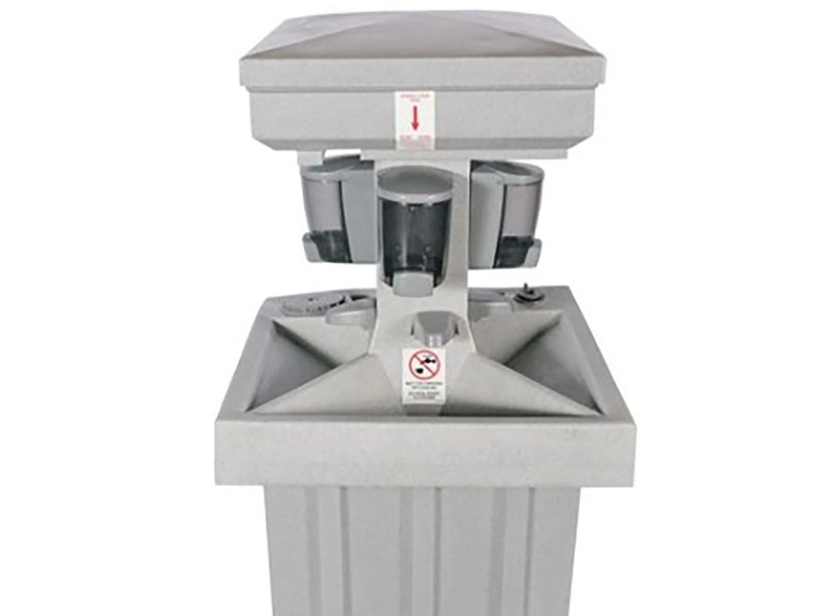 Four-station design keeps traffic flowing. This sink provides 325 uses on a single fill so itβs great for large-group settings. It also fits in compact areas, including restrooms, tight entrances, and hallways. Includes a foot pump, soap dispenser, and paper towel roll.