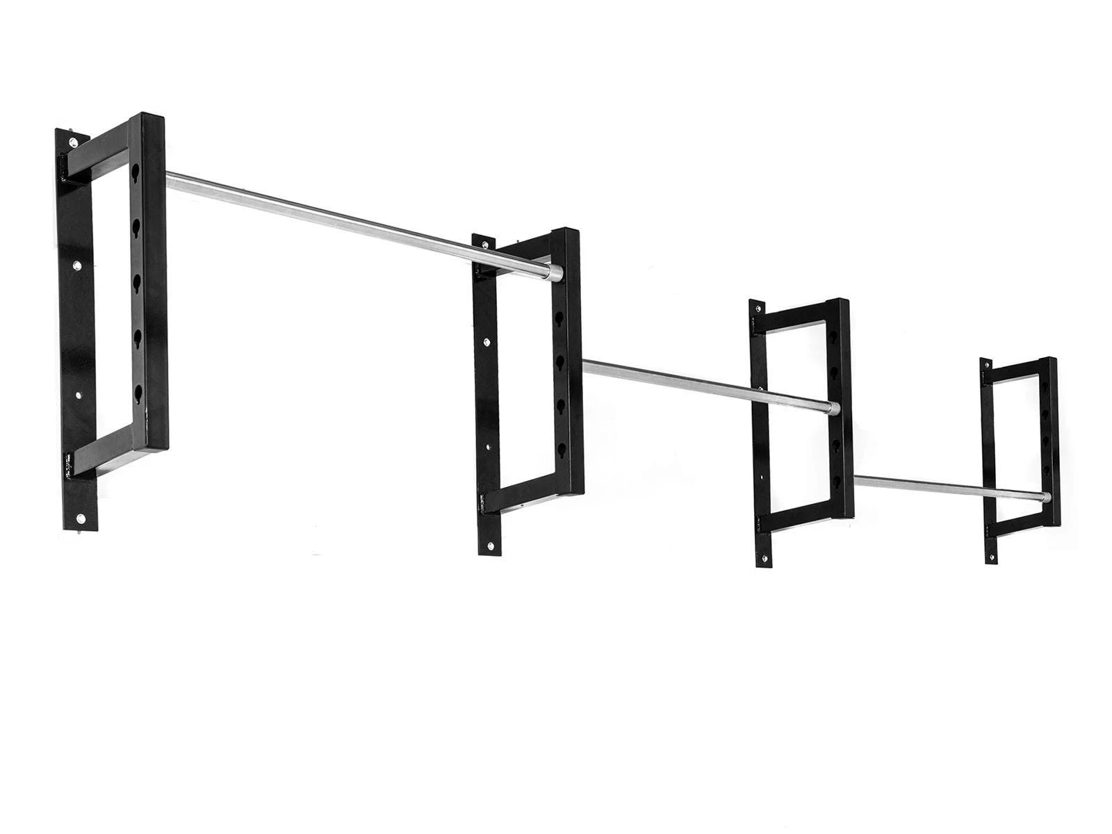 Each bar adjusts among four height presets in 4” increments (16” total adjustability). That allows coaches and instructors to set up a train of bars at different heights to accommodate groups of mixed ages and abilities. Durable 14-gauge, 2” x 2” steel construction is perfect for institutional use.