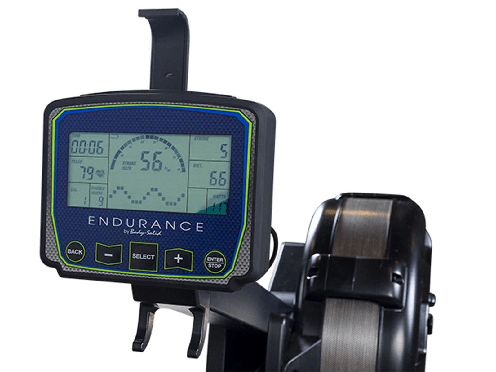 An LCD console includes 8 preset programs and displays time, heart rate, calories, paddle width, stroke rate, distance cycle, and watts generated. After class, the rower breaks down for convenient storage. 95″L x 24″W x 40″H; 81 lb.