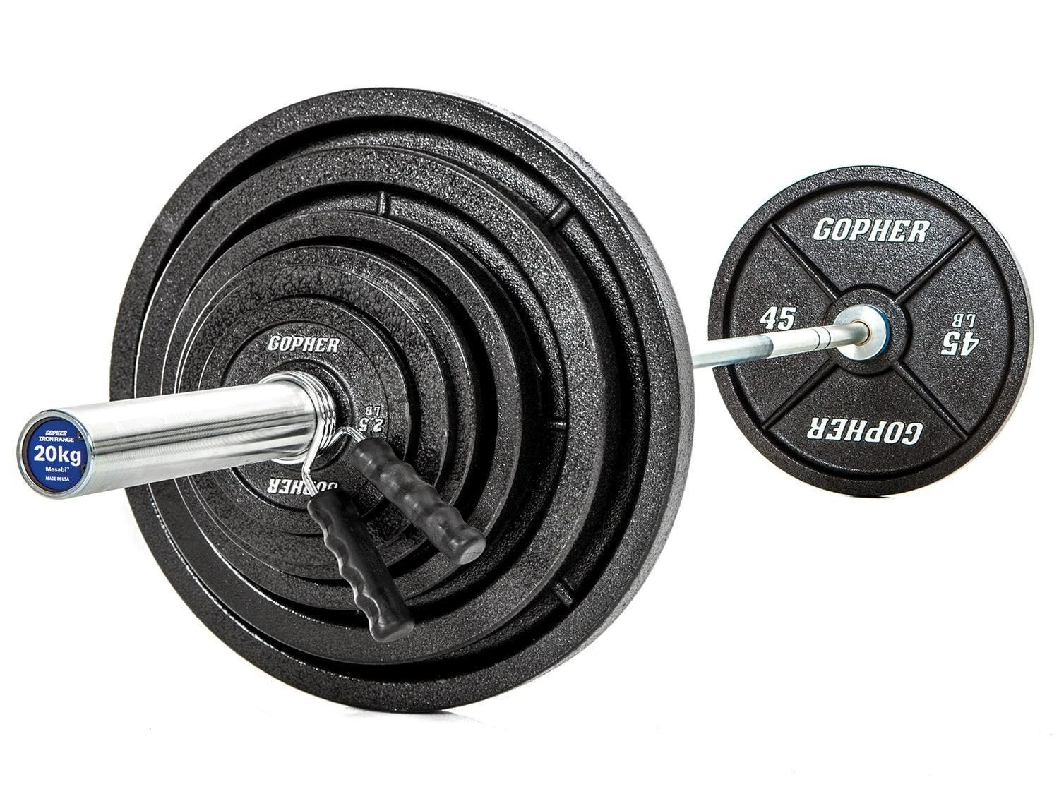 Set includes 7’L chrome-plated 45 lb steel bar (500 lb capacity), 1 pair spring collars, and 300 lb in plates (4 ea 5 lb, 2 ea 2.5 lb, 10-45 lb).