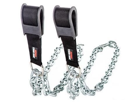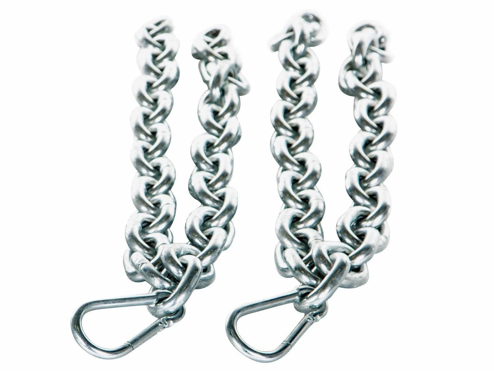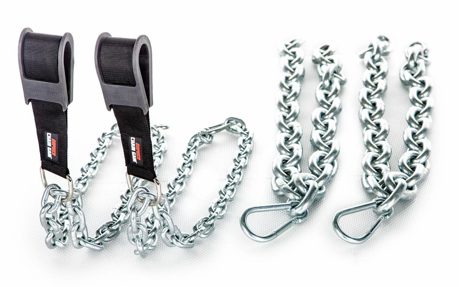 Heavy-duty nylon straps are threaded through the rubber collars. Double stitched straps are ready to handle any load. One 4’L 3/8” chain (5 lb) hangs from a D-ring attached to each strap. Add more, heavier chains to adjust the difficulty level for each user or activity. Each chain collar has a capacity of 400 lb. A pair of 5’L, 5/8″ chains (20 lb Ea) sold separately.