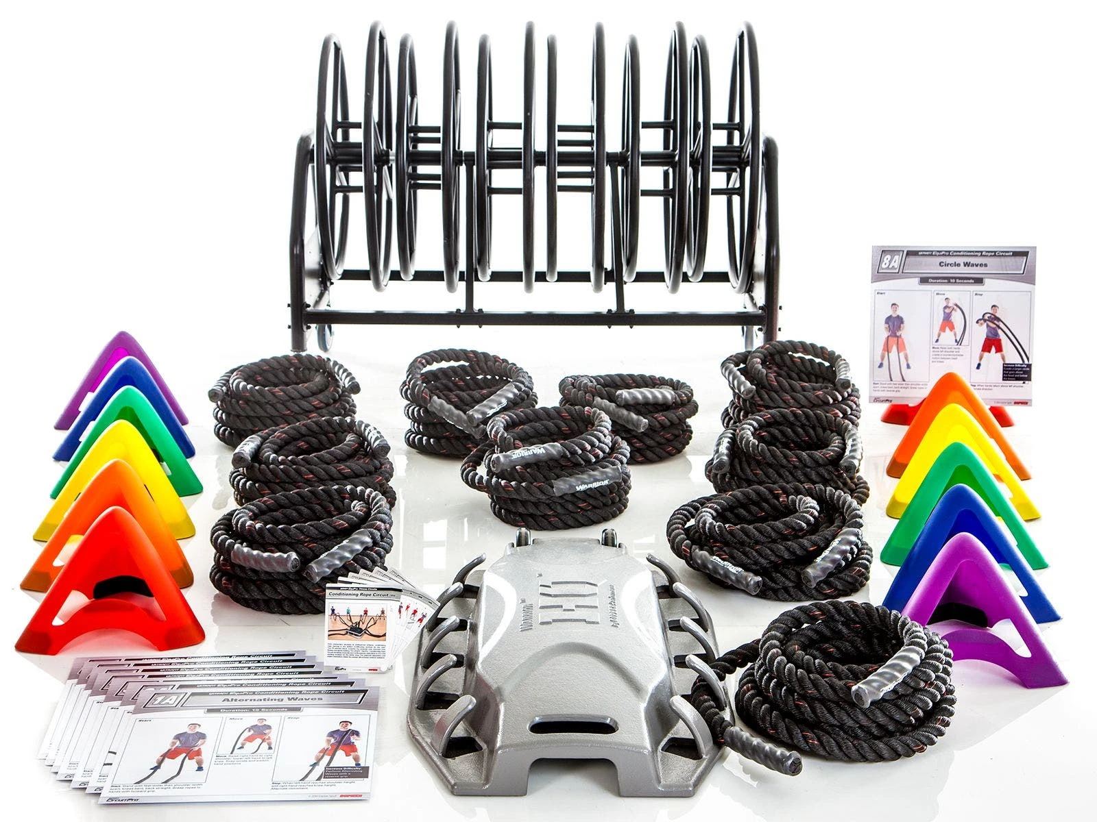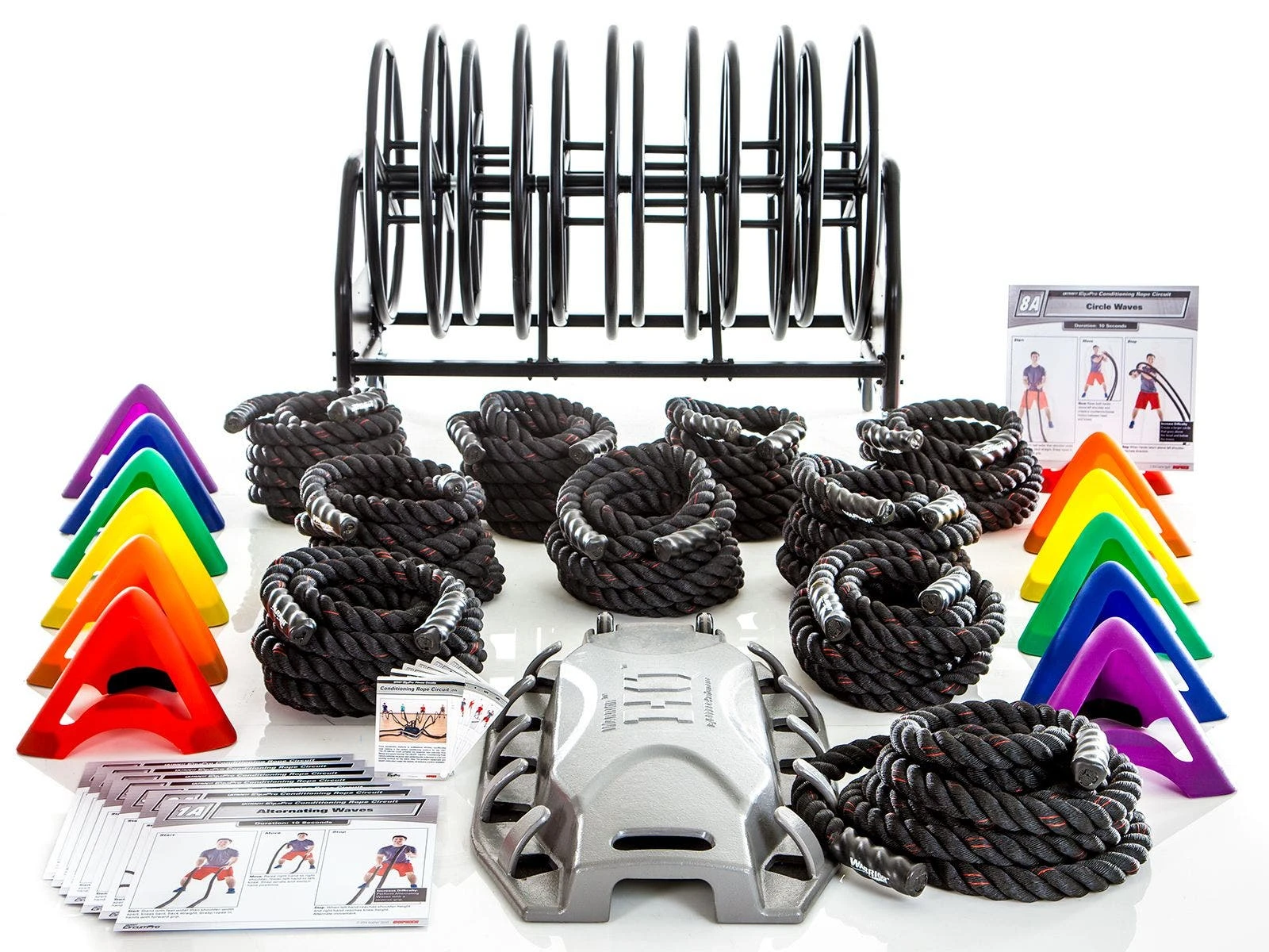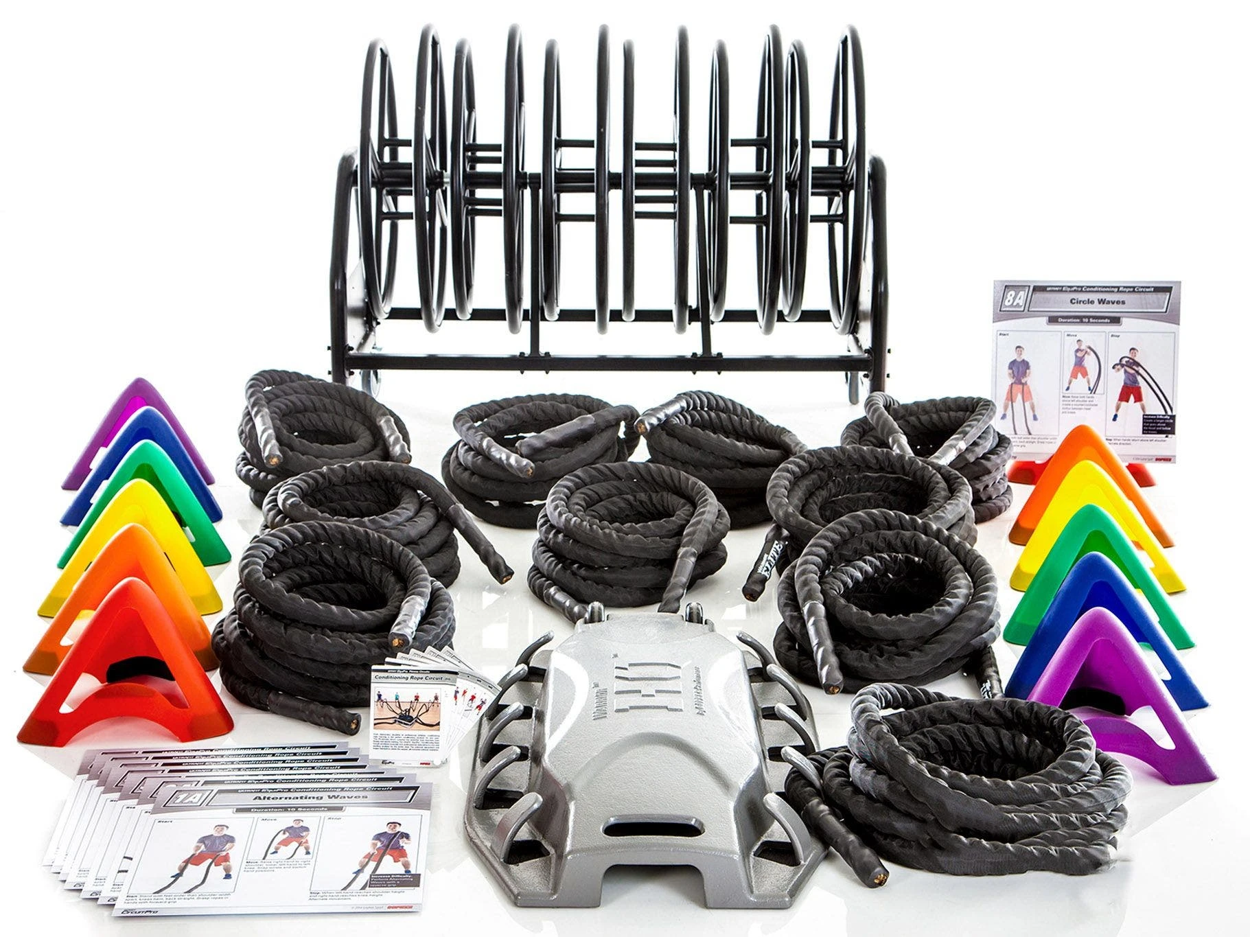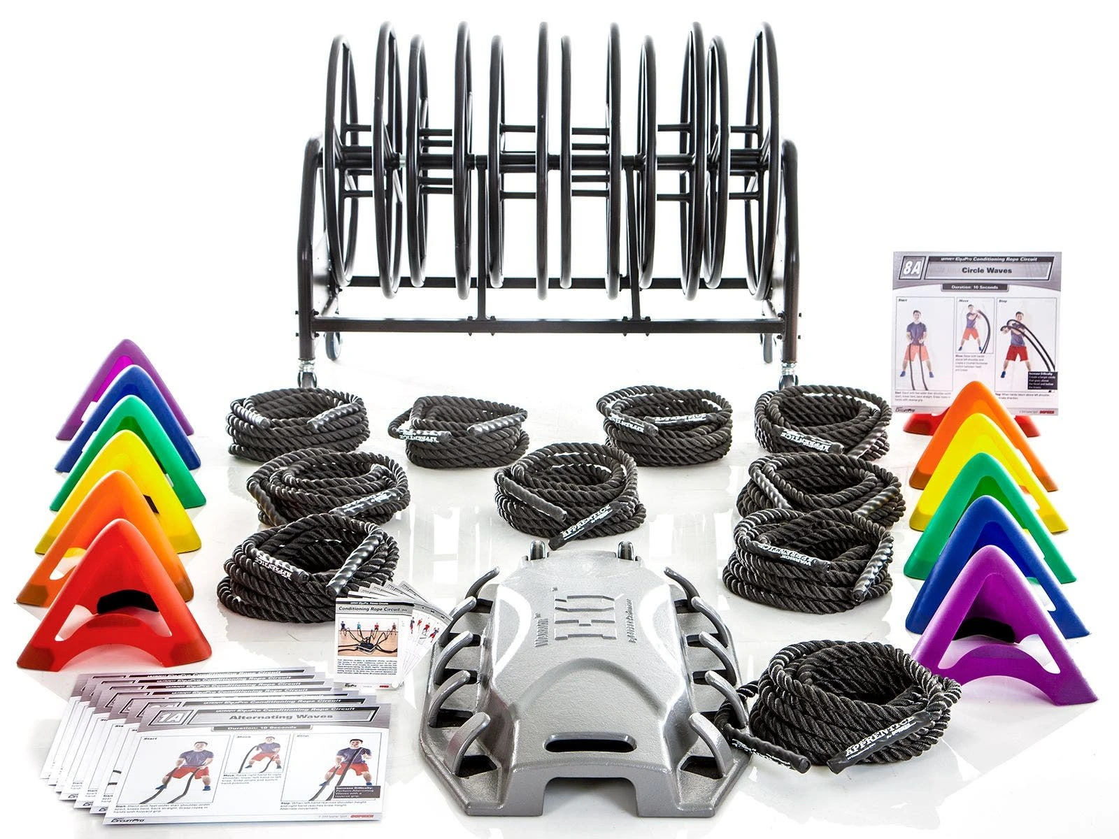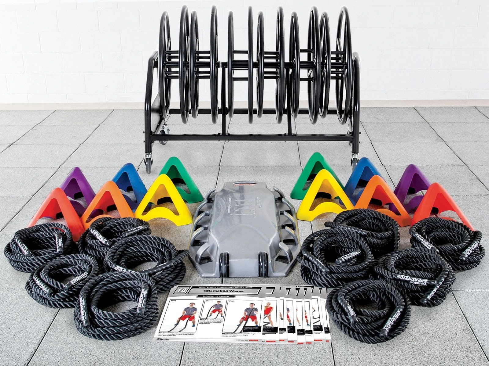 Swing into action with one of our battle rope packs that set up quickly and contain everything you need for conditioning rope exercises. After class, everything packs away on a convenient cart for safe and effective storage.