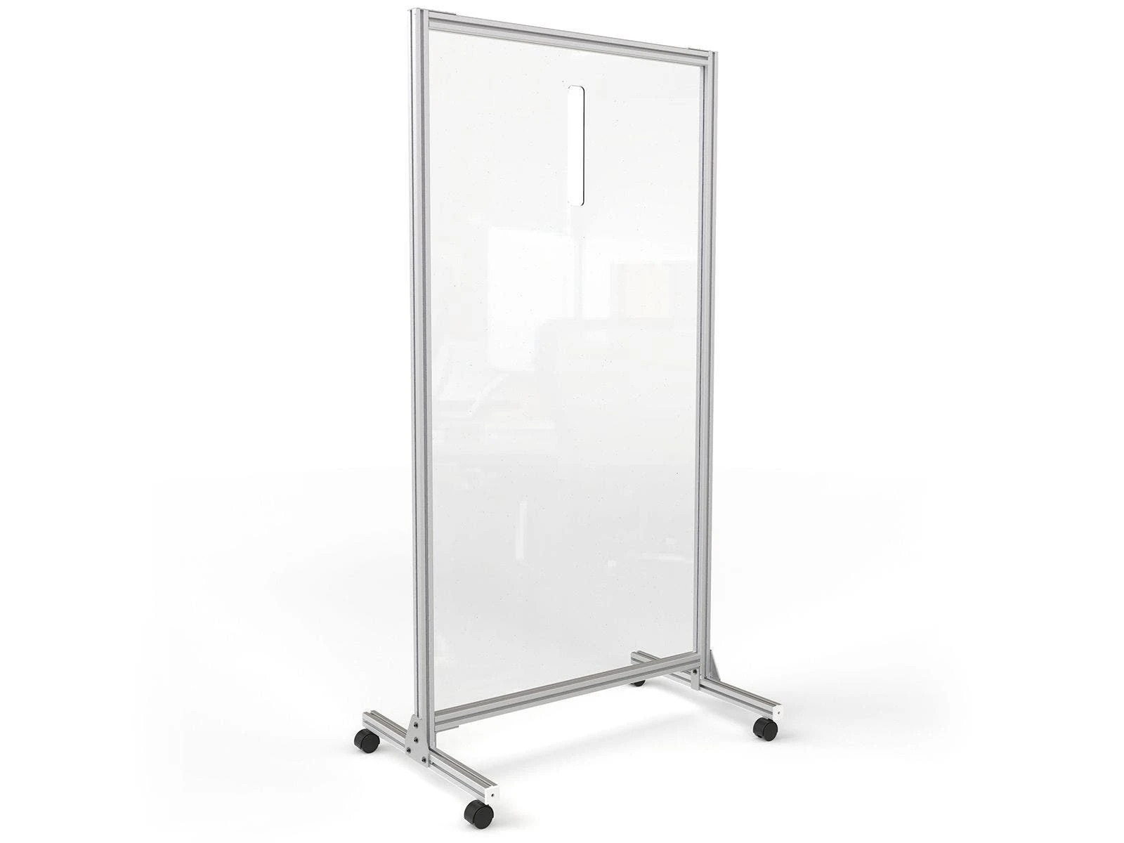 A 2″W x 12″H cutout in the divider allows users to take temperatures of those entering a building or room while encouraging safety. Clear plastic construction allows people on both sides to see each other. An aluminum frame and base keep the narrow divider standing tall. Includes four casters (2 locking) for easy relocation. Simple assembly. 38″W x 74″H; 41 lb