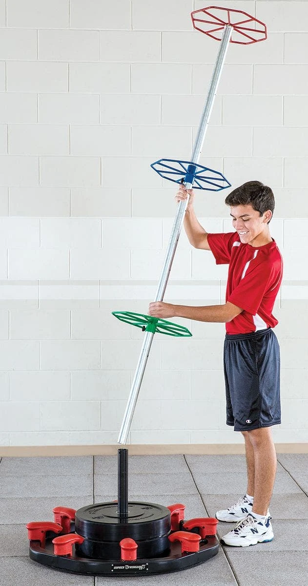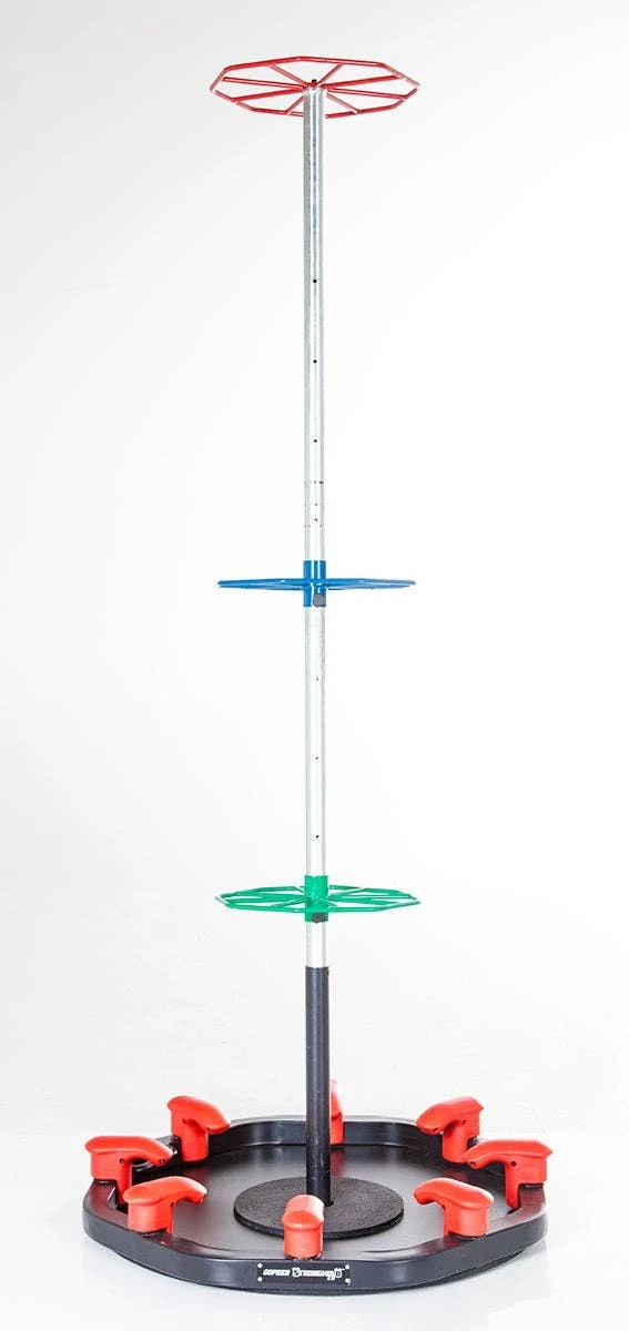 The all-steel CommandPost Resistance Tubing Station towers 84”H and features 3 tube-attachment rings for 360-degree training access. Its mid and low adjustment rings slide to 11 height settings, accommodating users of all sizes and allowing for a wide variety of movements for the best resistance tube workout. The 1-1/2″ dia CommandPost is designed for use with the Warrior Stronghold 2.0 Anchor Station (34″ disa; 70 lb). At least four 45 lb weight plates (not included) are recommended for station stabilization.