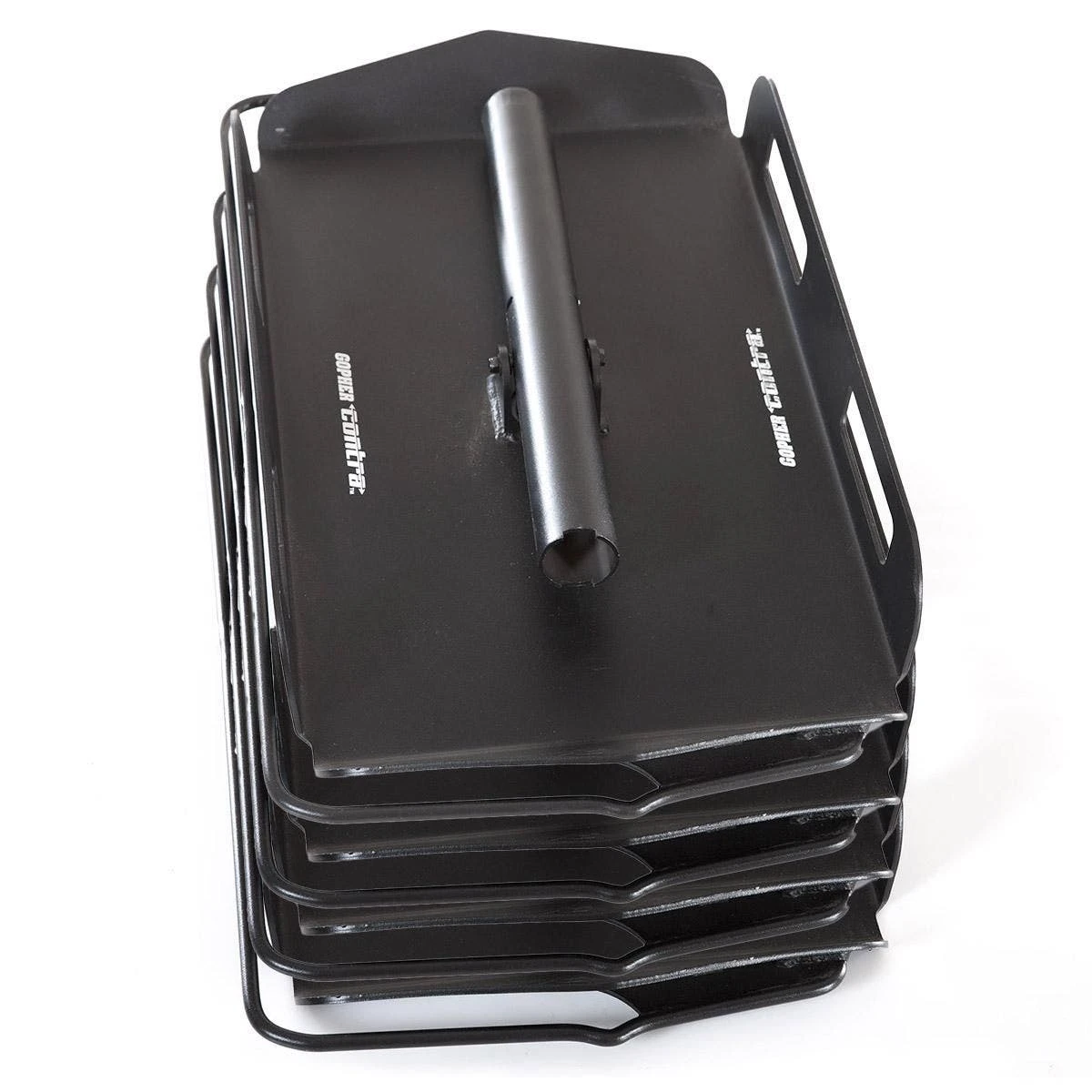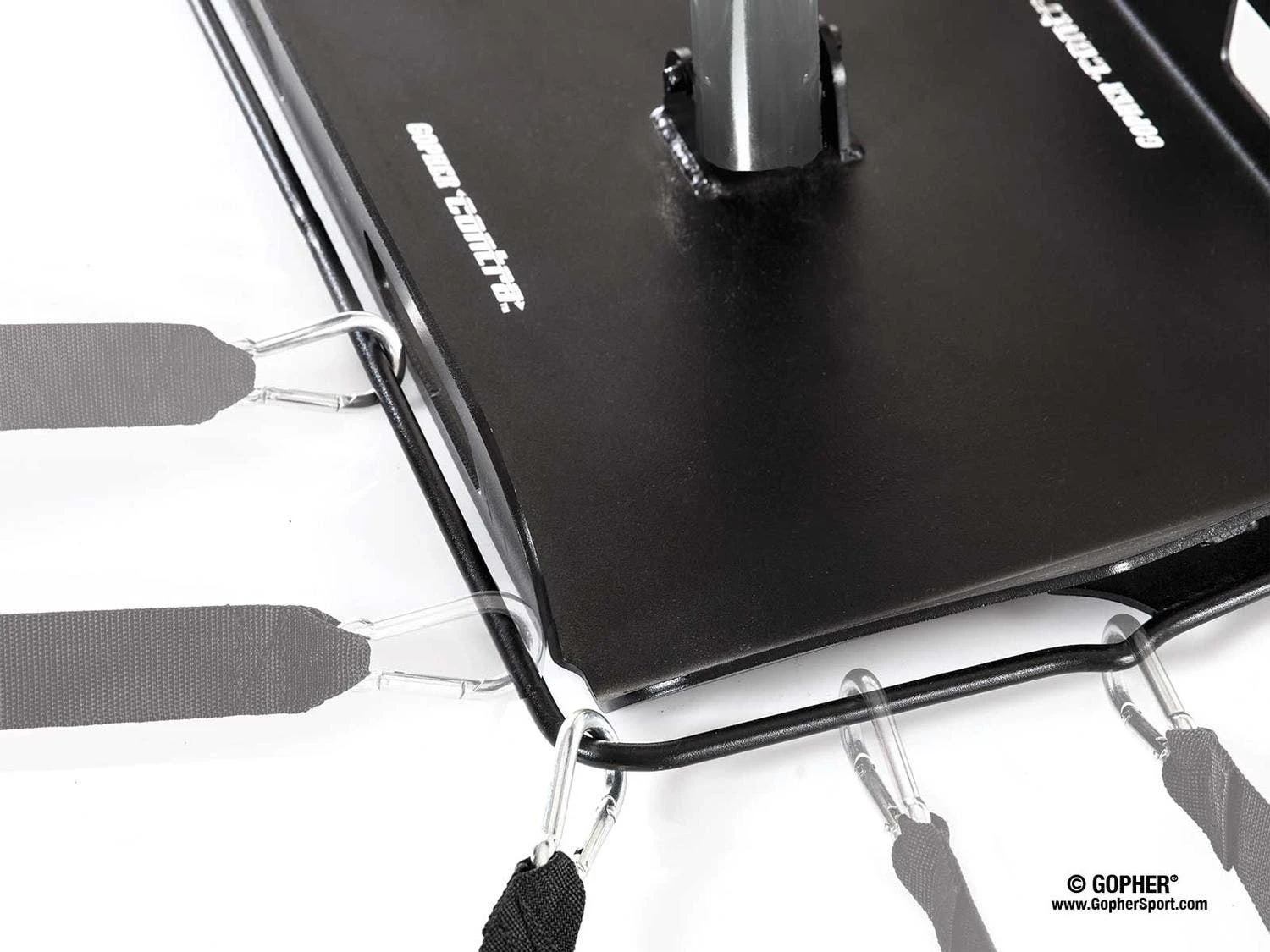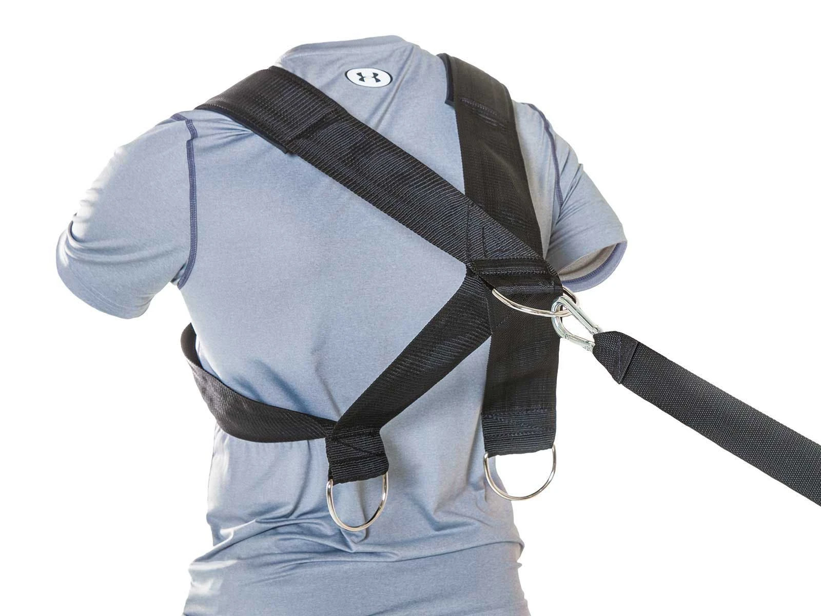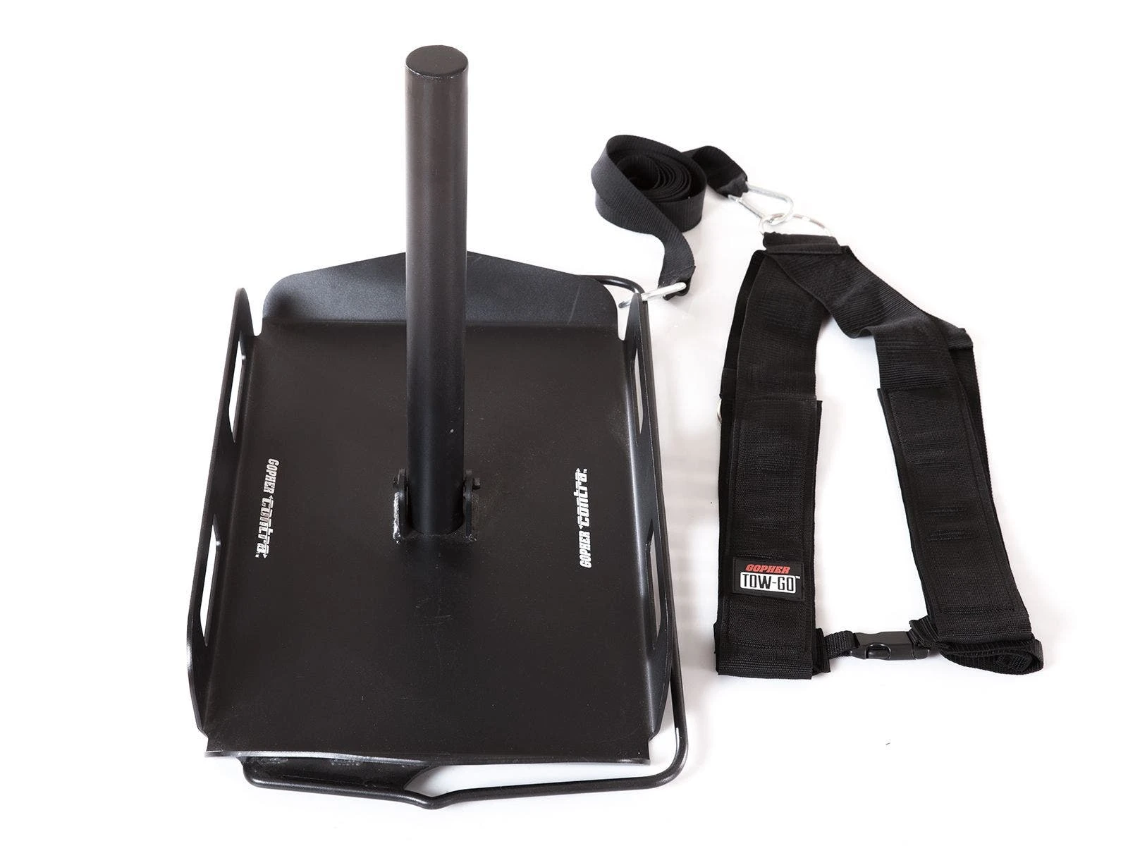 A steel rod runs around the dual direction drag sled, allowing the leash’s carabiner to slide from one end to the other for a quick change of direction and uninterrupted training! A chromed center post (18″H) holds 225 lb in Olympic plates and collapses for compact and stackable storage. Durable 8-gauge steel frame takes heavy use and abuse. Tow-Go Harness and Leash are made of 3″ durable nylon webbing. Harness has padded shoulder straps and 3 D-rings. Leash is 10’L. Set includes Sled and Harness with Leash. Sled is 15″W x 27-1/4″L; 26 lb.