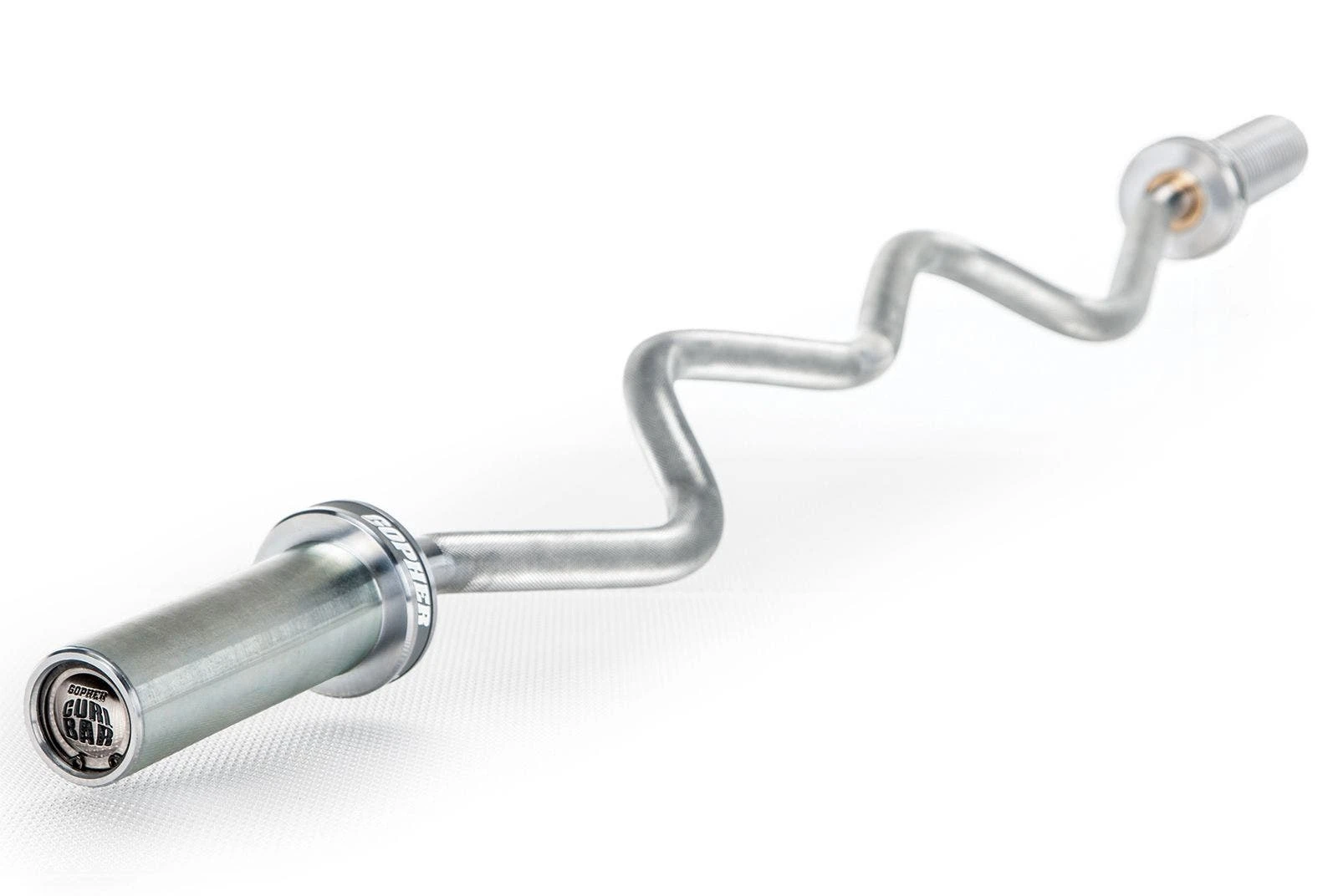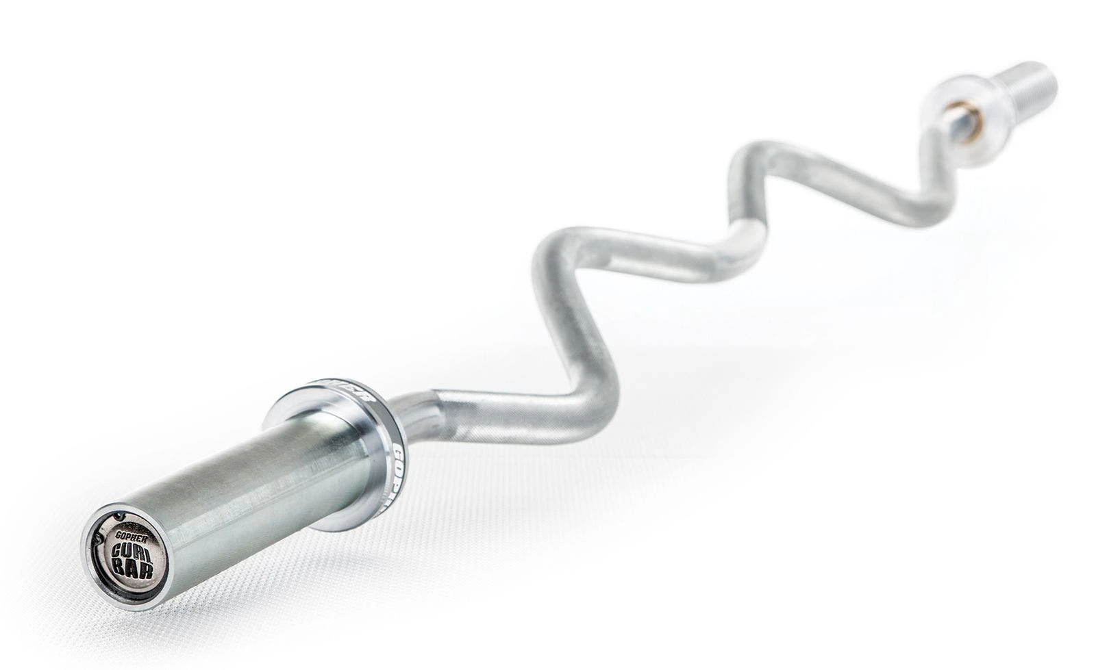 48″L Curl Bar. Introductory curl bar measures 25 mm dia for a comfortable grip. Gopher’s Just Rightâ„¢ Knurling provides stability and lends confidence to lifters. Bright zinc coating showcases outstanding finish and durability. Snap-ring construction firmly fixes sleeves to the bar shaft so they won’t loosen over time. Bronze bushings allow for optimal sleeve rotation and eliminate unwanted momentum changes. Bar weighs 20 lb.