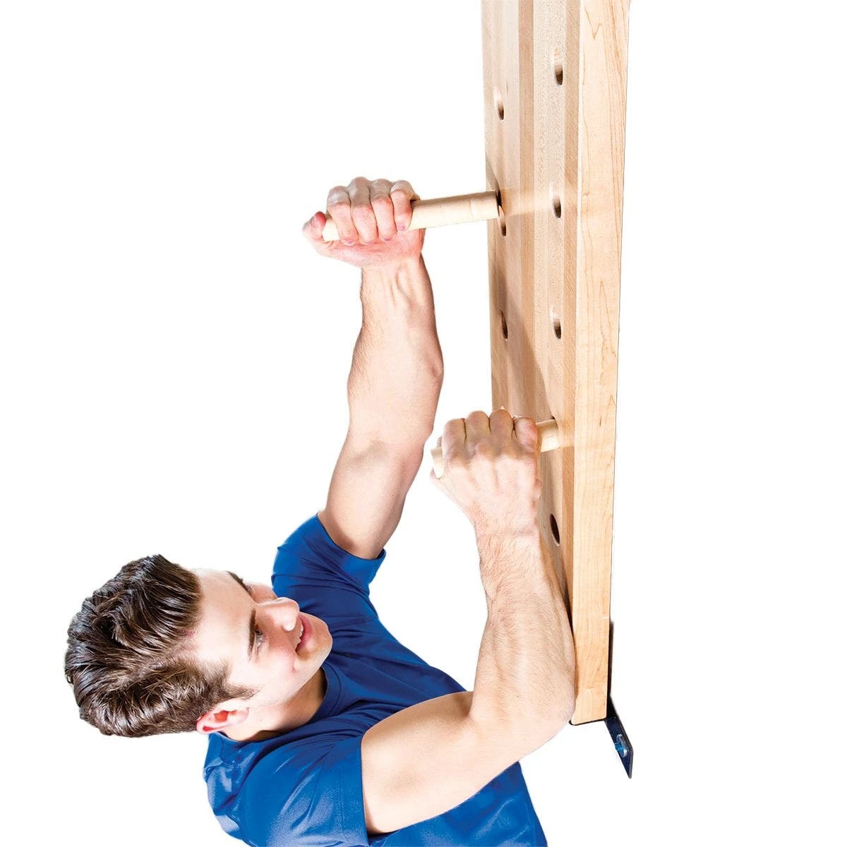 Users grip two 1″ dia pegs and insert them into the holes on the board, attempting to climb to the top and ascend back down. With no preset points of contact, this dynamic climbing system gives students more freedom of movement to develop upper-body muscles that standard pull-ups or rock climbing can’t provide. Mount vertically or horizontally to vary the challenge!