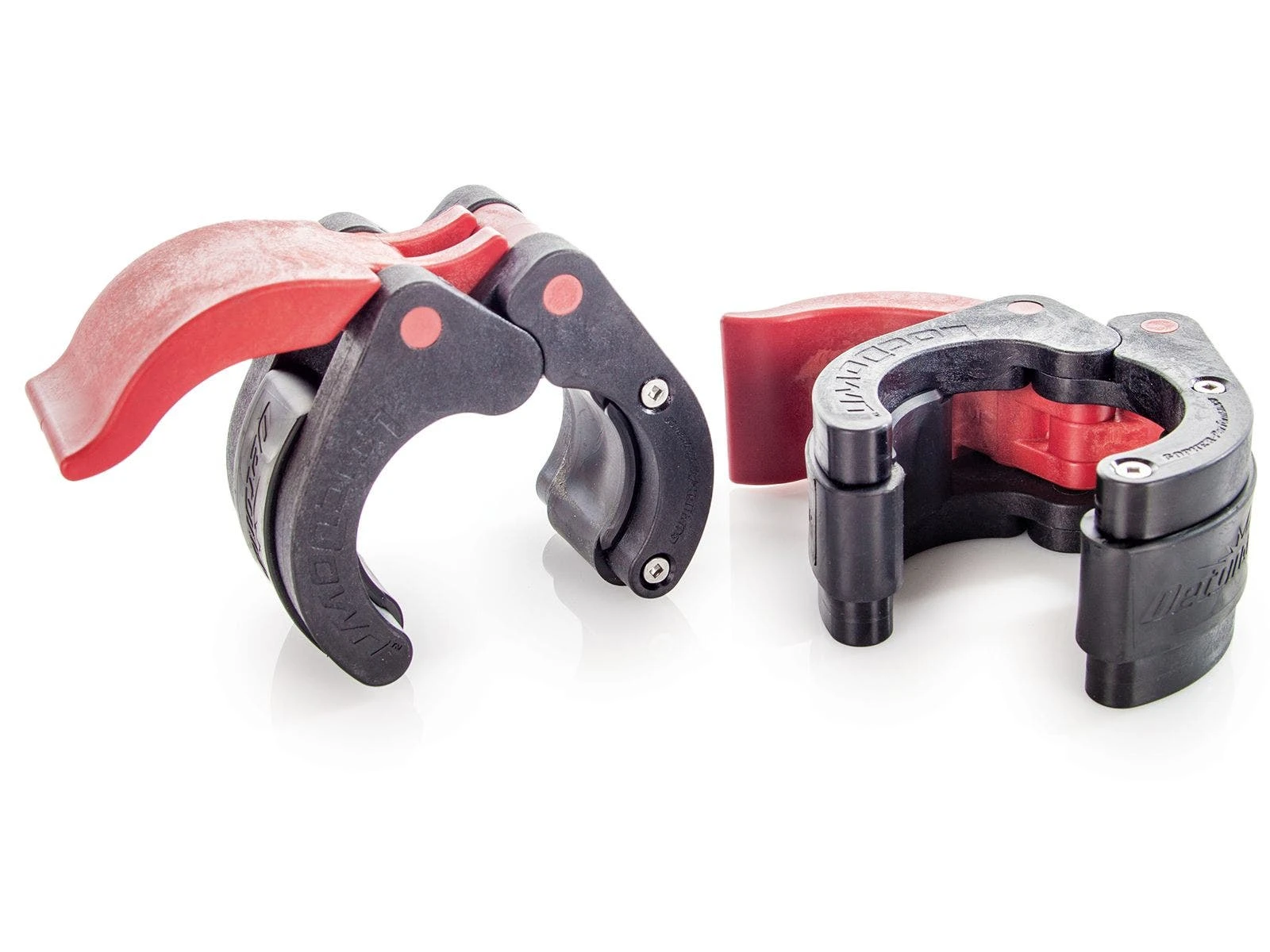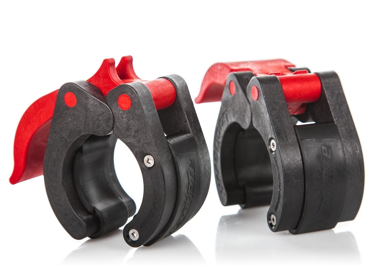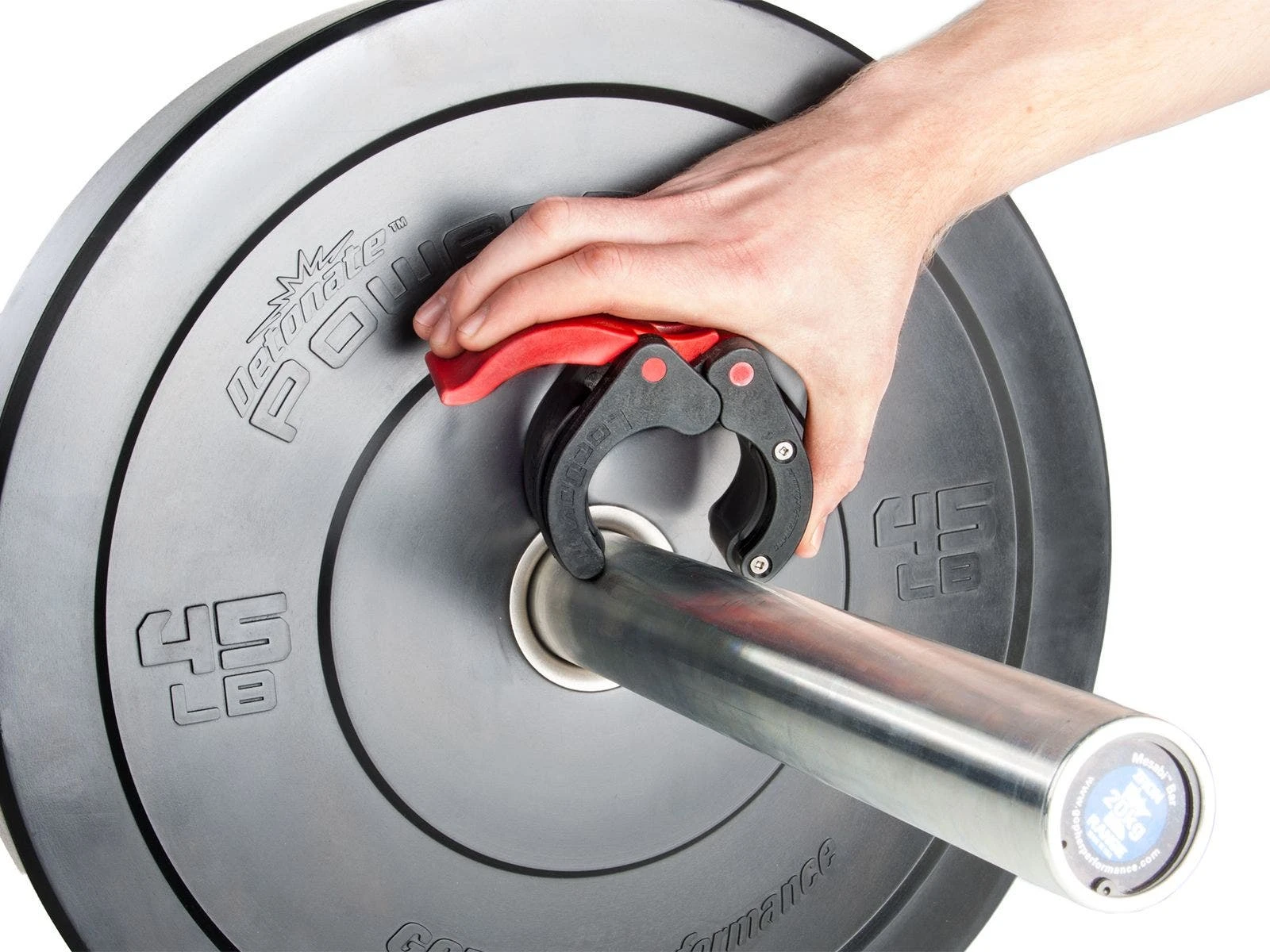 Secure and remove these collars with one hand! Their unique design allows them to sit on the bar and be locked down by pressing down the long red lever. Simply lift the lever up again to unlock the collar for easy removal.