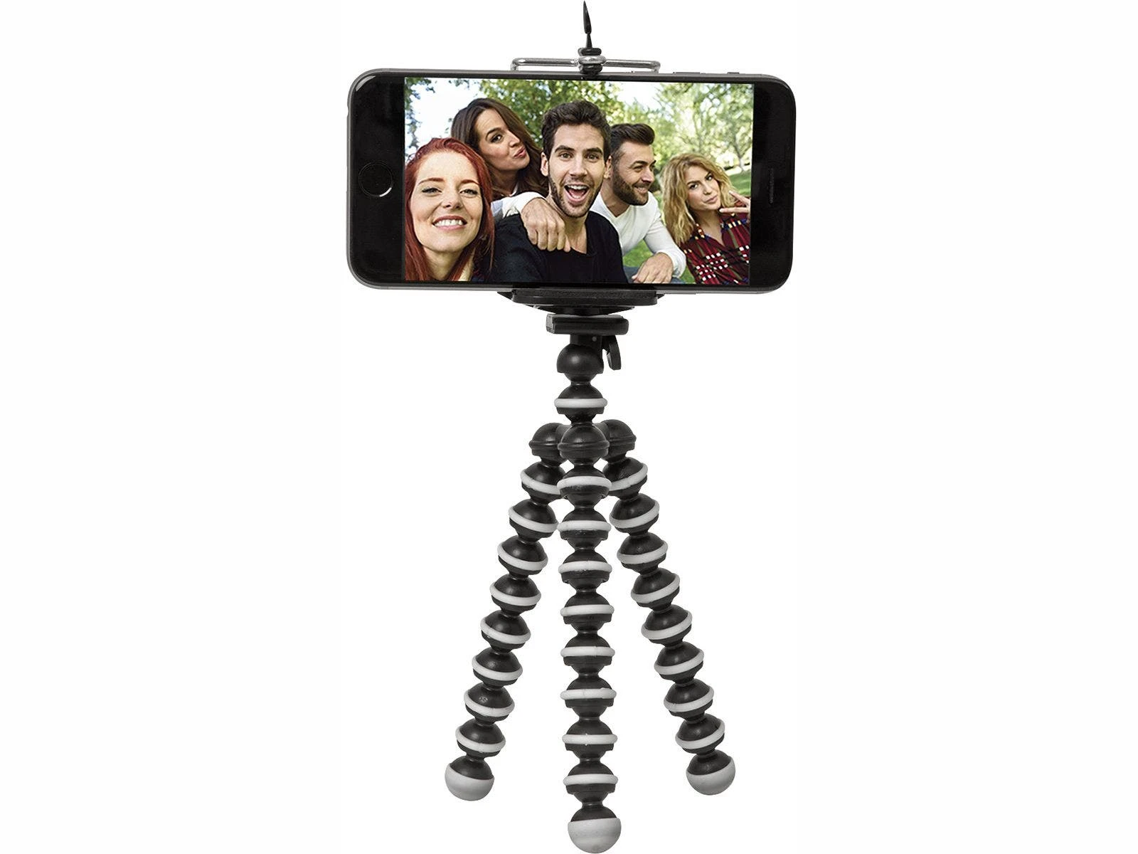 Flexible tripod is ideal for helping teachers and students to record or stream live video without holding on their phones. It is also a great option for taking group photos. It features a 180° rotating head to adjust the angle. Tripod comes with a Bluetooth-enabled remote that is compatible with iOS and Android devices. Attach the remote to a key chain for safe keeping.