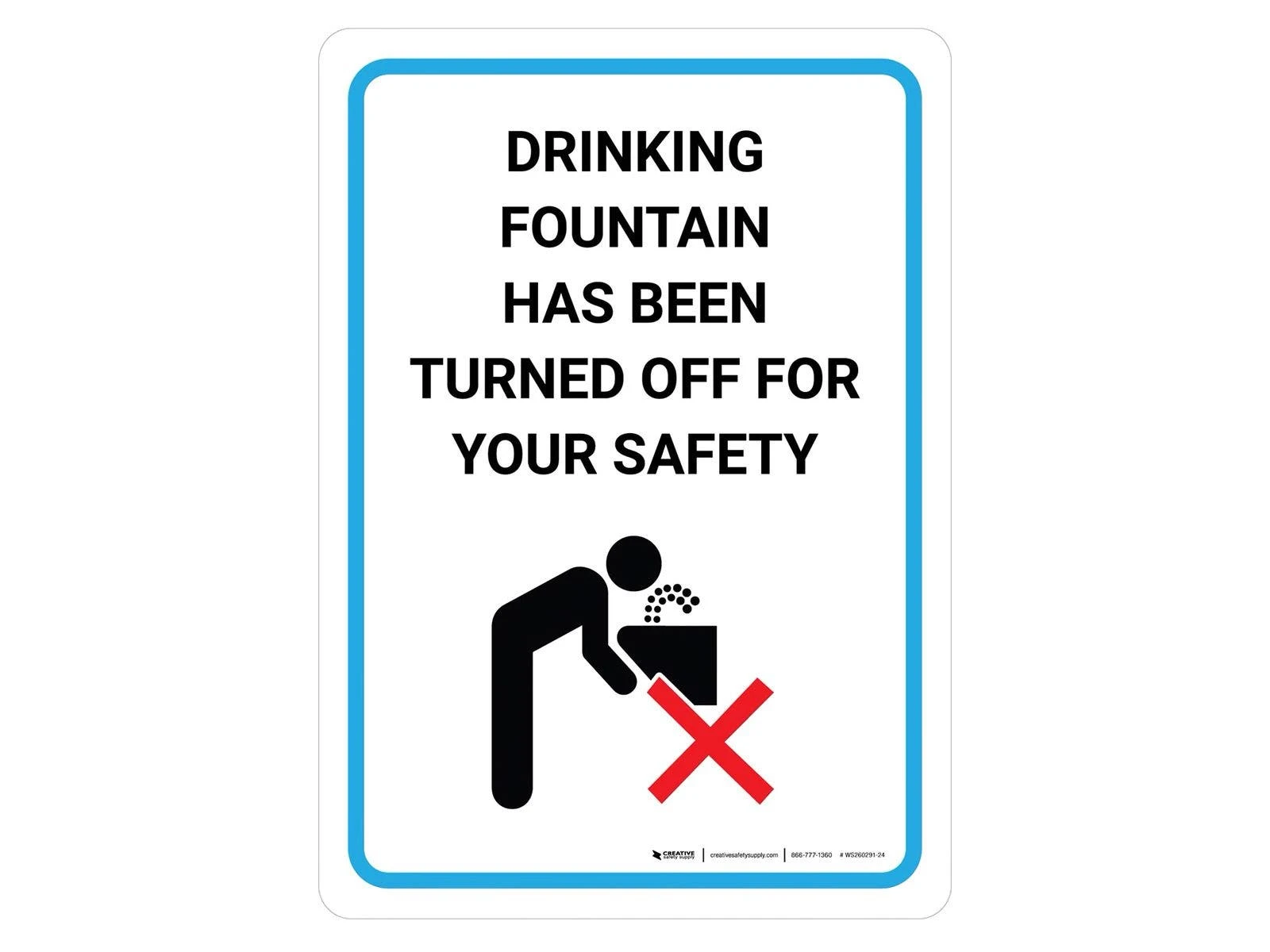 Post this wall graphic sign near drinking fountains to indicate it’s turned off due to COVID-19 safe social distancing or to prevent the spread of germs. It’s available as a peel-and-stick wall decal or a durable PVC sign. Each is 7″W x 10″H.