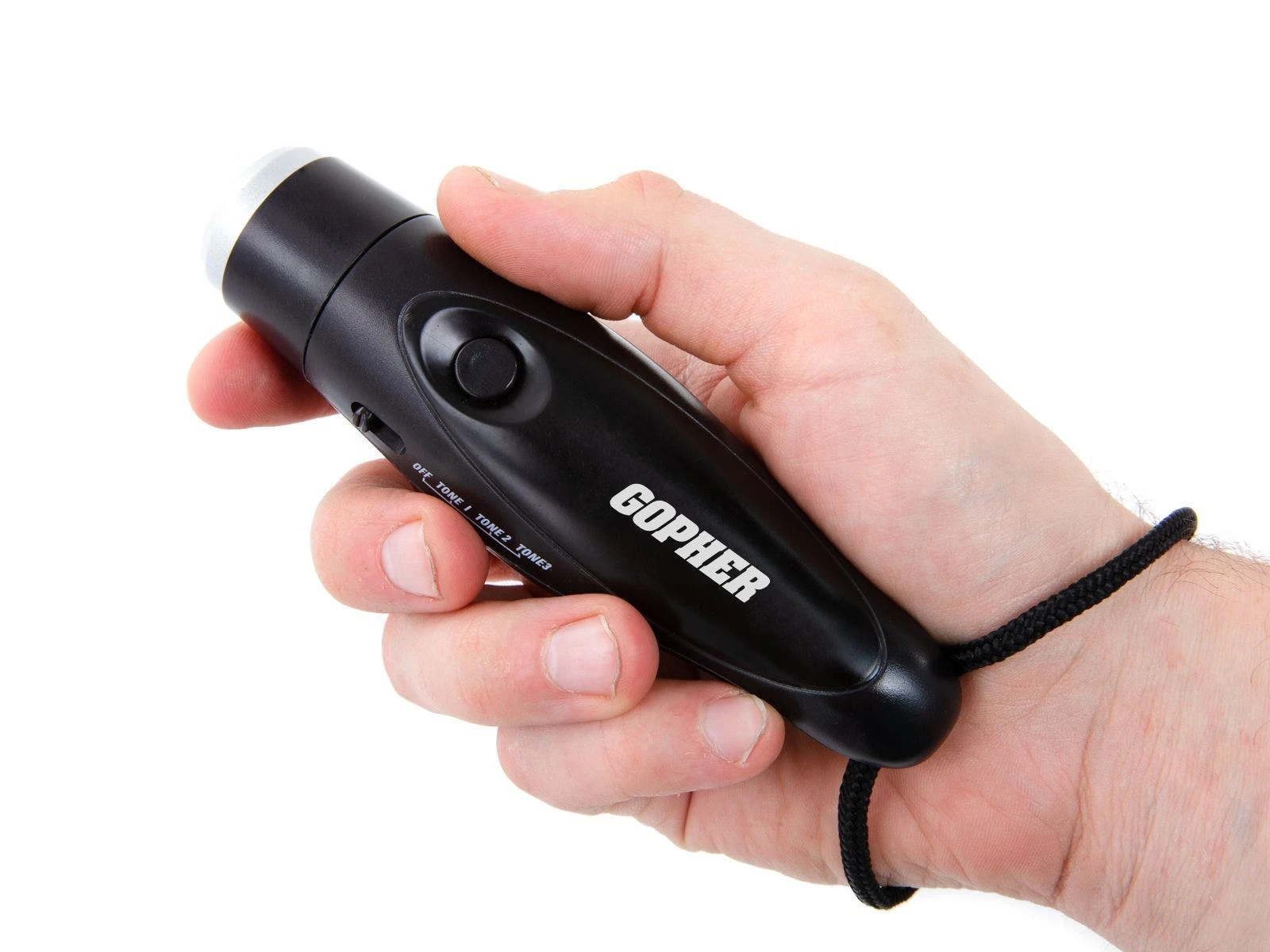 - Gopher Three-Tone Whistle. Grab attention using a handheld electronic whistle with 3 tone settings. It operates at 125 dB range. Simple switch lets user change between the tone settings and turn the whistle on/off. Includes a wrist/neck strap for easy handling.