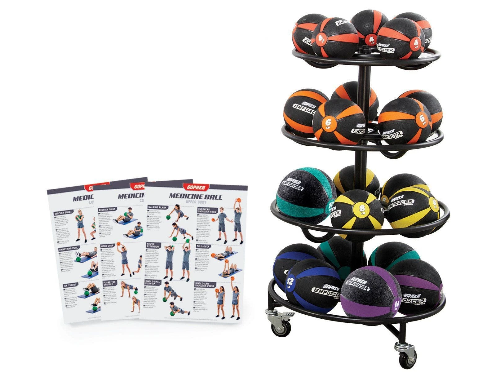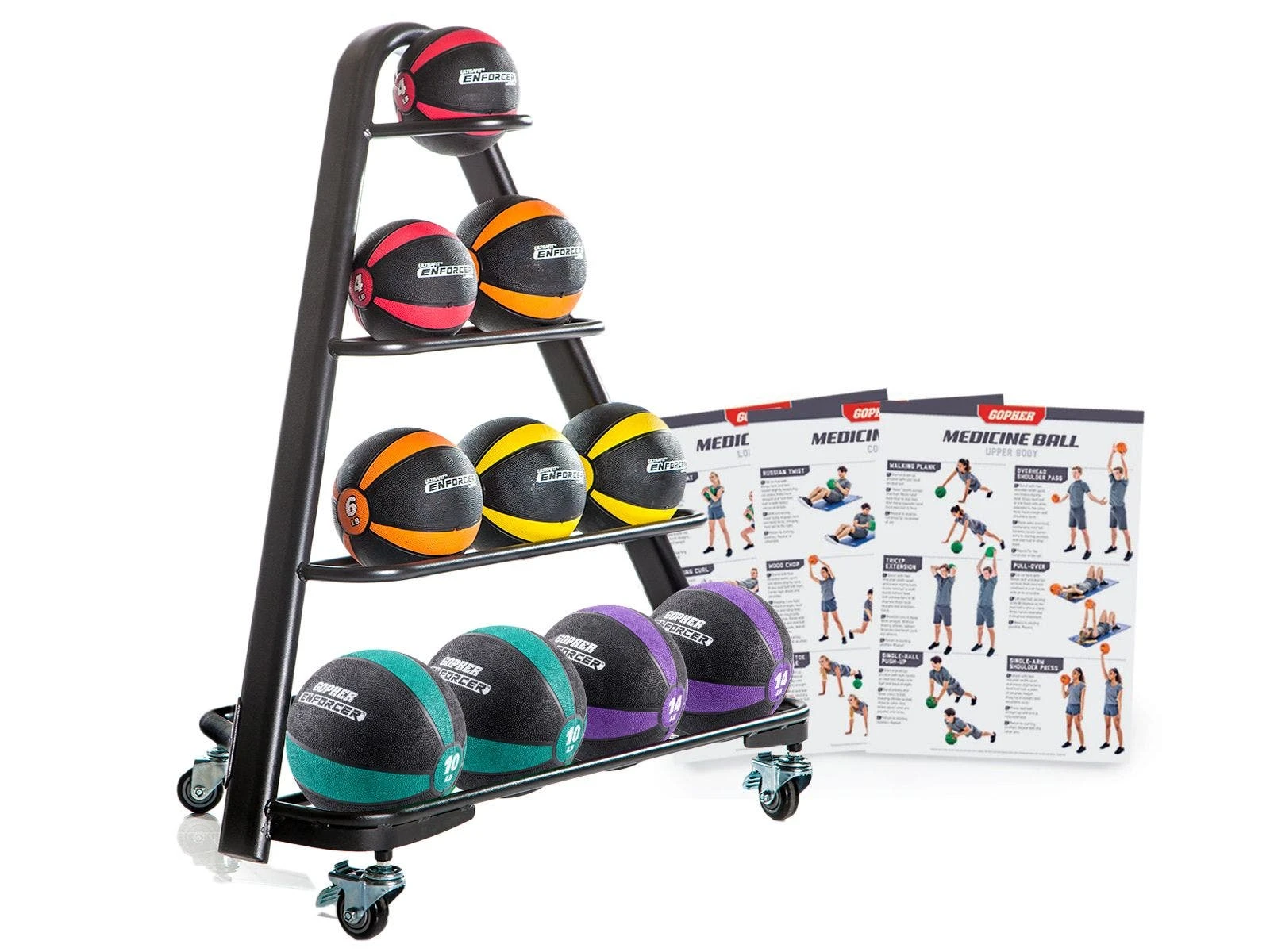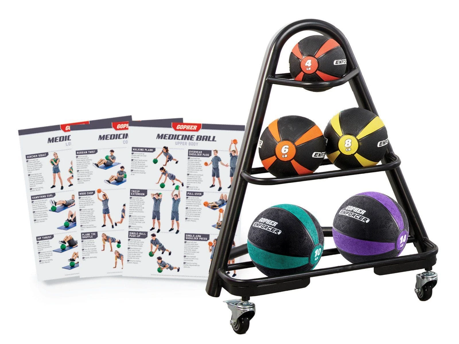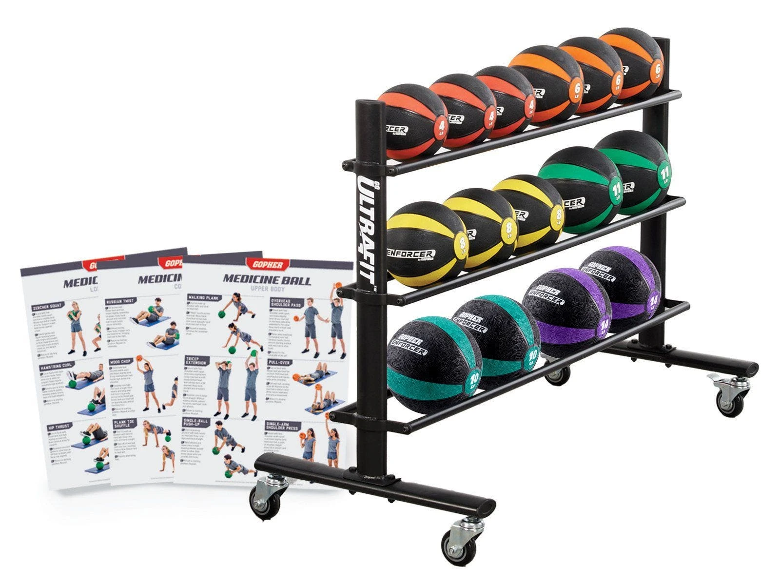 - 22-Balls Set. Includes 5 ea 4-8 lb; 3 ea 10 lb; 2 ea 12, 14 lb balls, 1 UltraFit 4-Tier Rack, and 3 laminated UltraFit Training Charts.