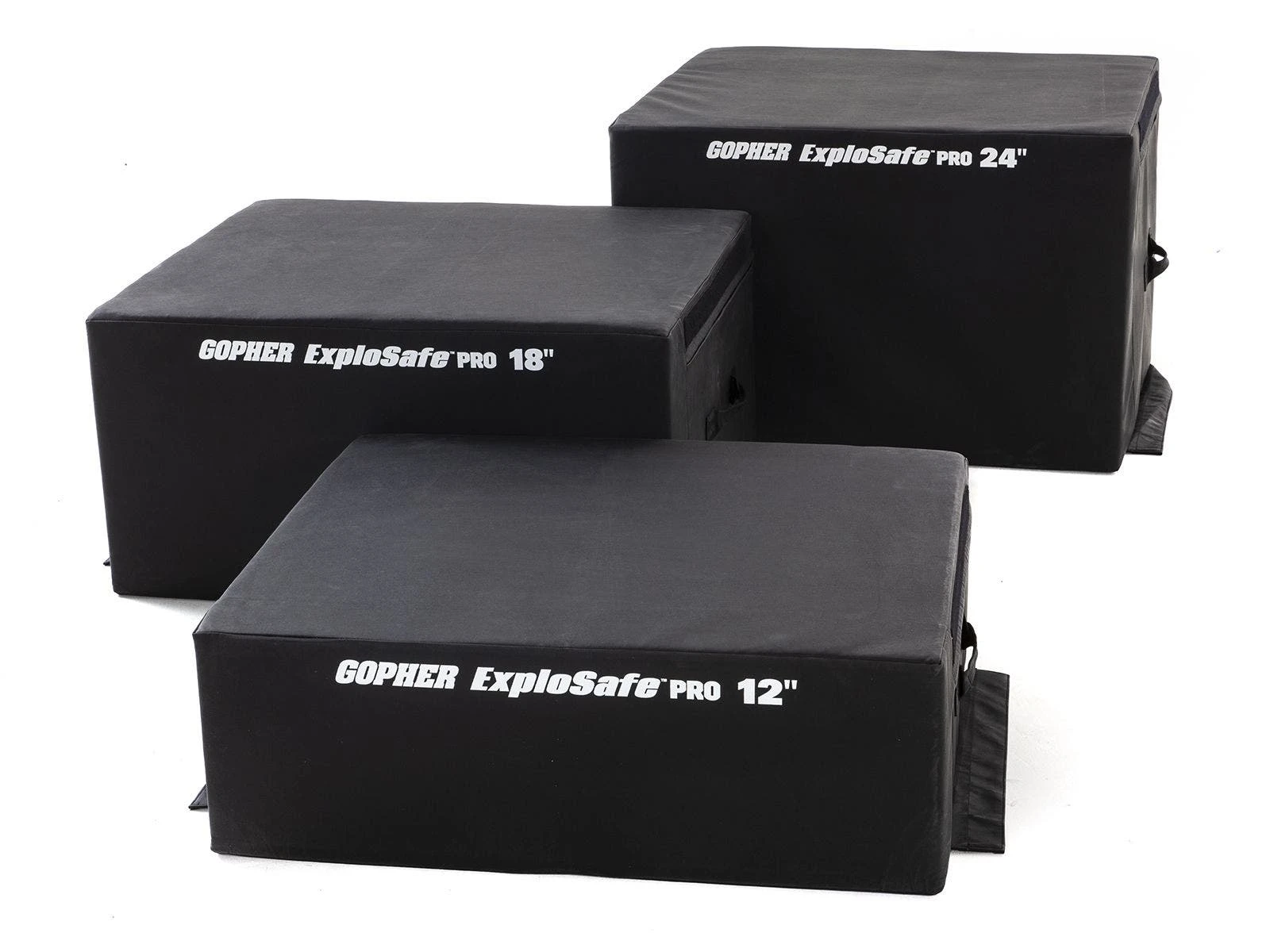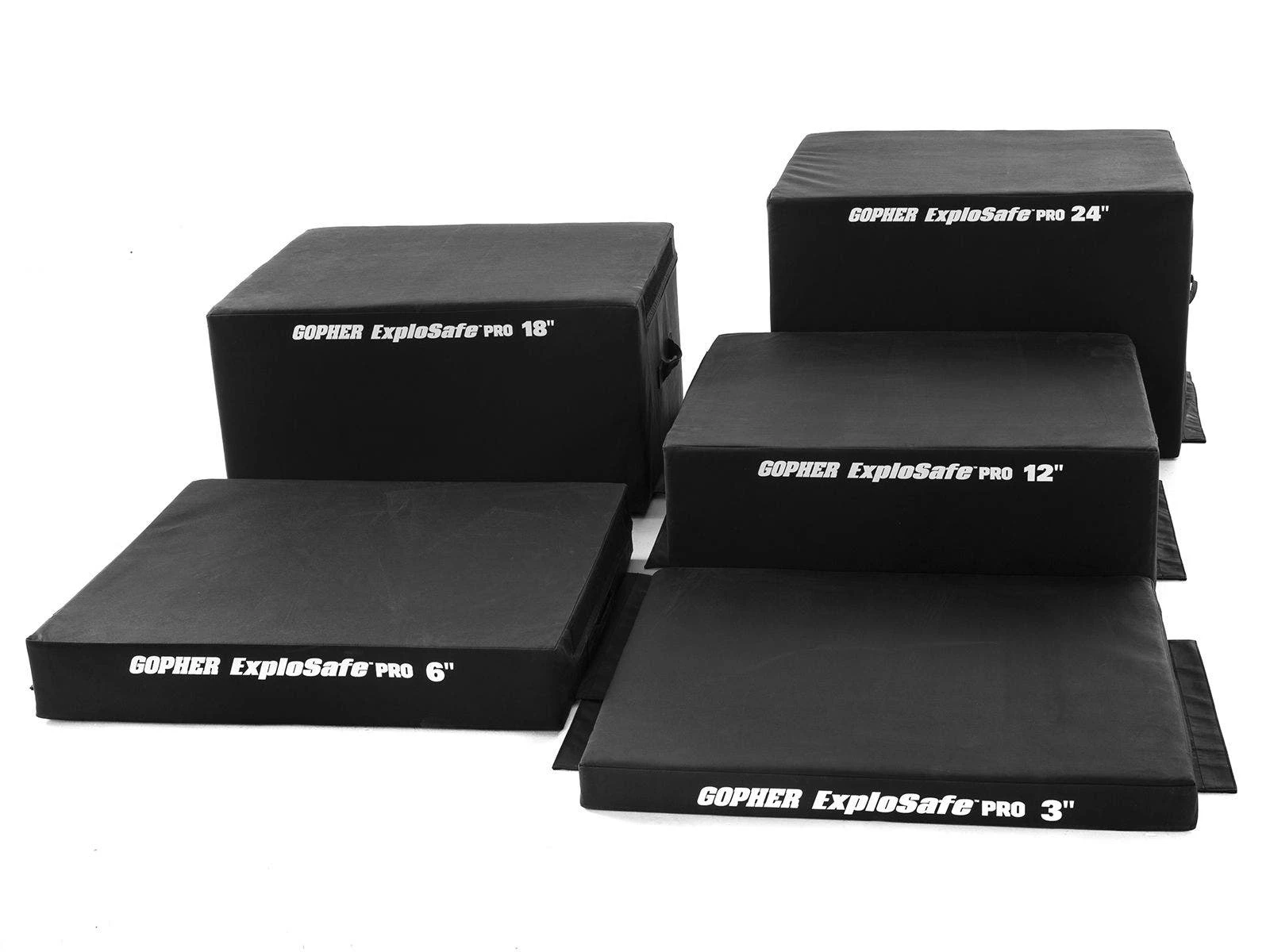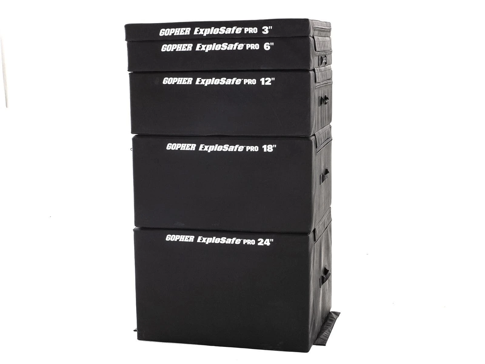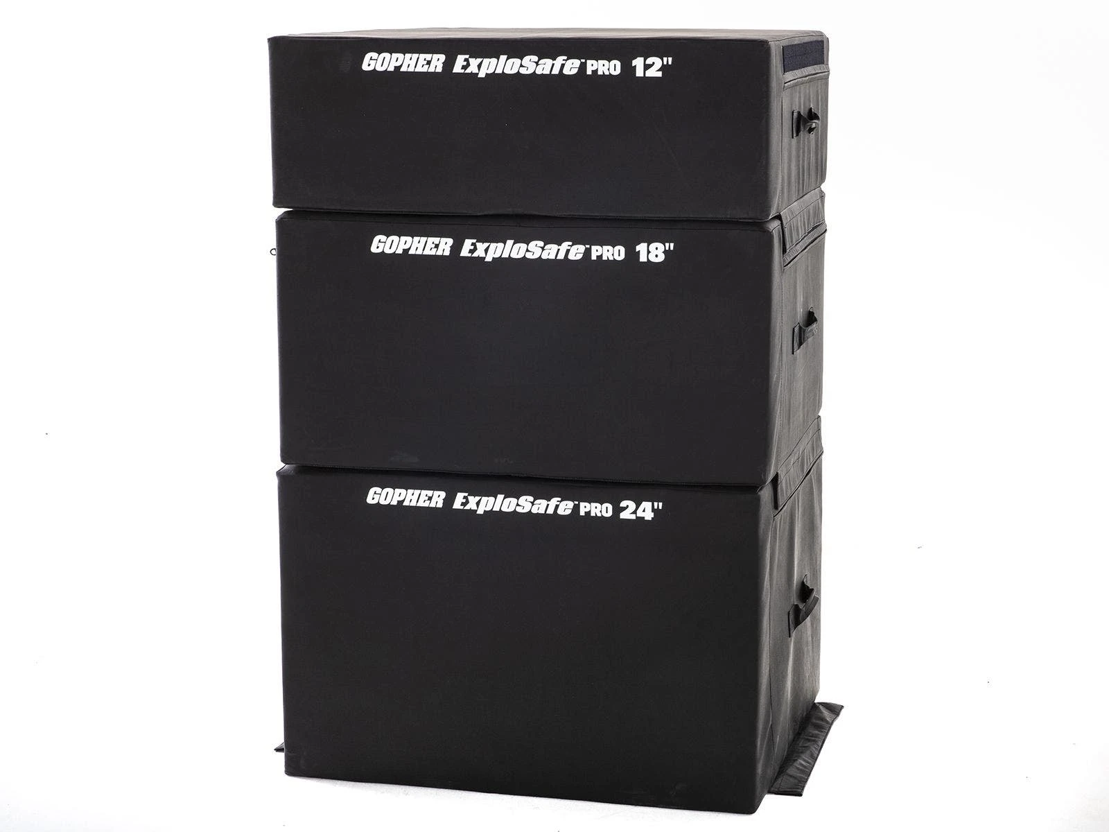 Inside, high-density foam marries soft construction with sturdy structure. That means these boxes keep their shape under impact, while minimizing chances of injury on all-out high jumps. Non-slip bottoms ensure a solid foundation for safe landings. Use hook-and-loop fasteners to secure boxes together for adjustable height. Transportation is also a breeze due to built-in handles. 30”L x 36”W.
