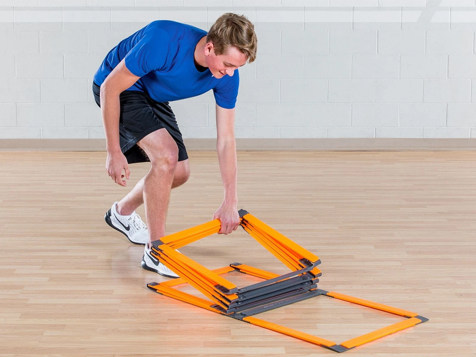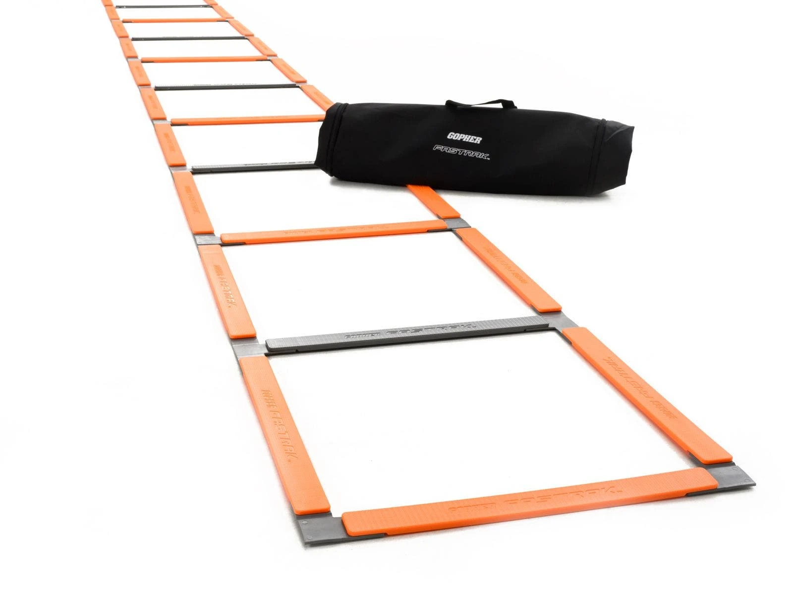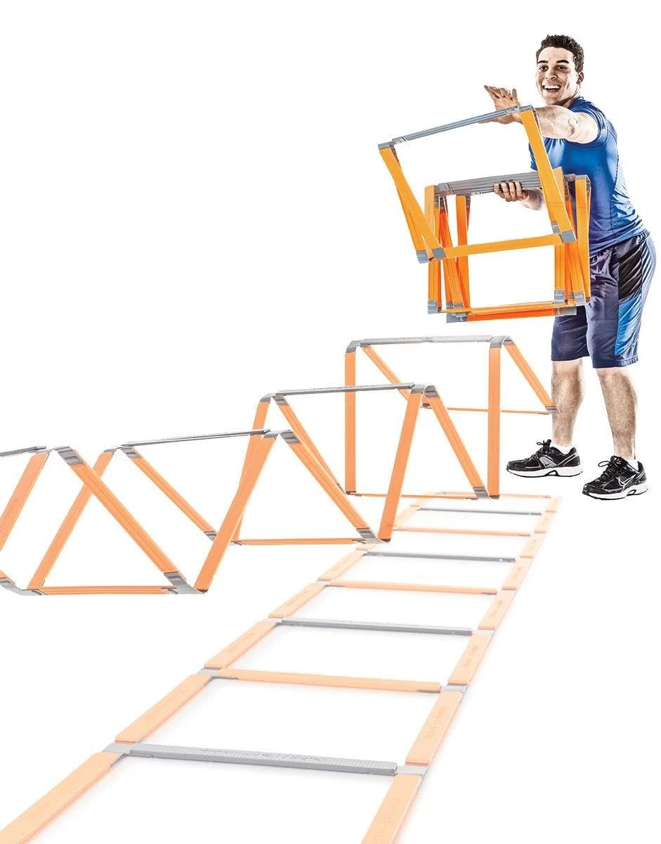 This flat plastic ladder features special hinges that make setup and pickup a snap! Rigid orange rungs keep the ladder flat while the gray rungs indicate which to pick up when your training session is complete. Included nylon storage bag makes storage and transport easy!