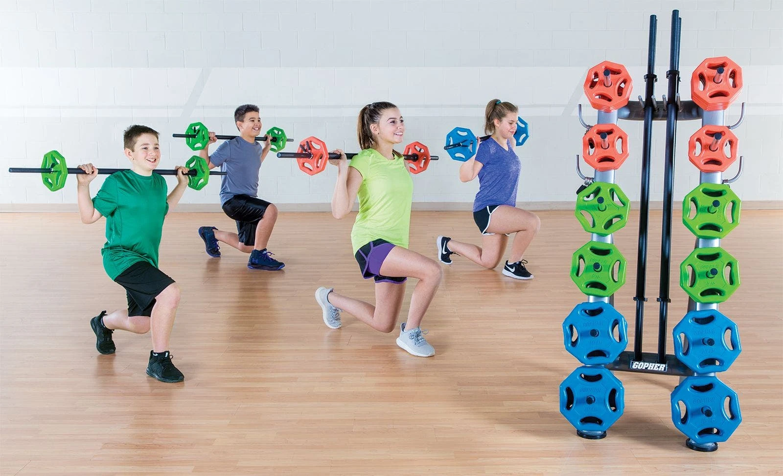 A wide range of weights allow these sets to be used with a wide range of lifters, from beginners to experienced lifters. 10-User Pack includes 20 ea 2.5, 5, 10 lb plates, 10 bars (5 lb ea), 10 spring clips, and 1 storage rack (34″L x 24″W x 53″H; 58 lb) to keep equipment organized when not in use. 20-User Pack doubles the contents. Individual plates, bar, clips, and storage rack sold separately.