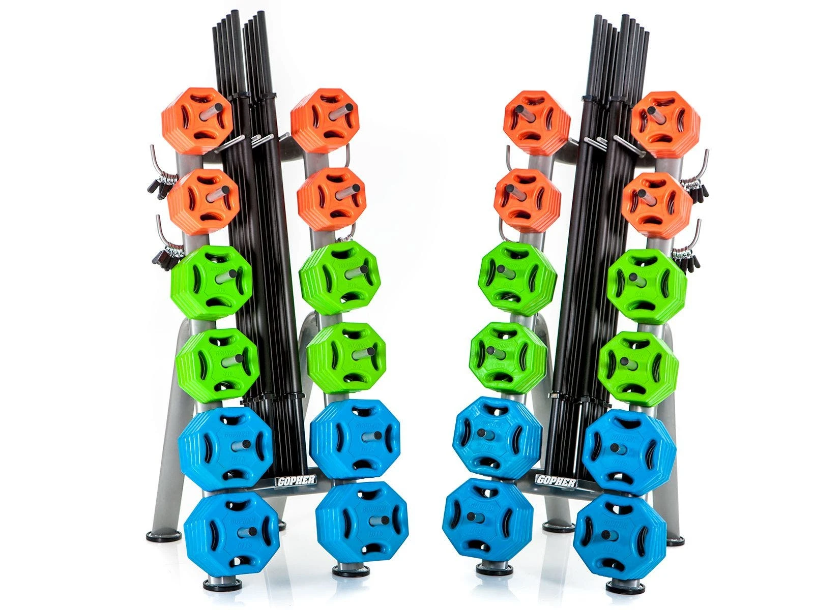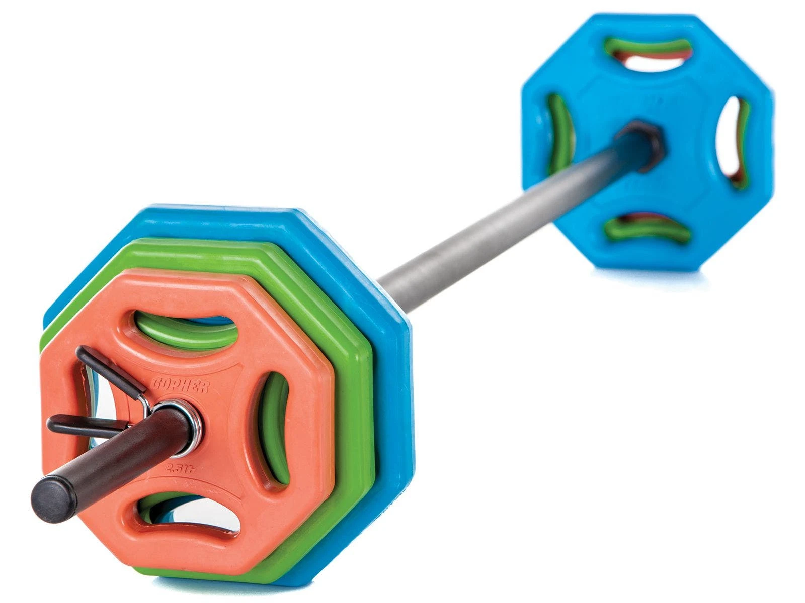 Complete sets with a bar, plates, and collars optimize workout time by decreasing prep time. Quickly select the right plate(s) by the bright rubber coating (each weight is its own color). The coating also protects floors, and the plates themselves, from damage when dropped or set down. A no-roll design keep plates in place when not in use. Each plate also features ergonomic cutouts, allowing them to be used independently for lateral and front raises, bicep curls, lunges, or tricep kickbacks.
