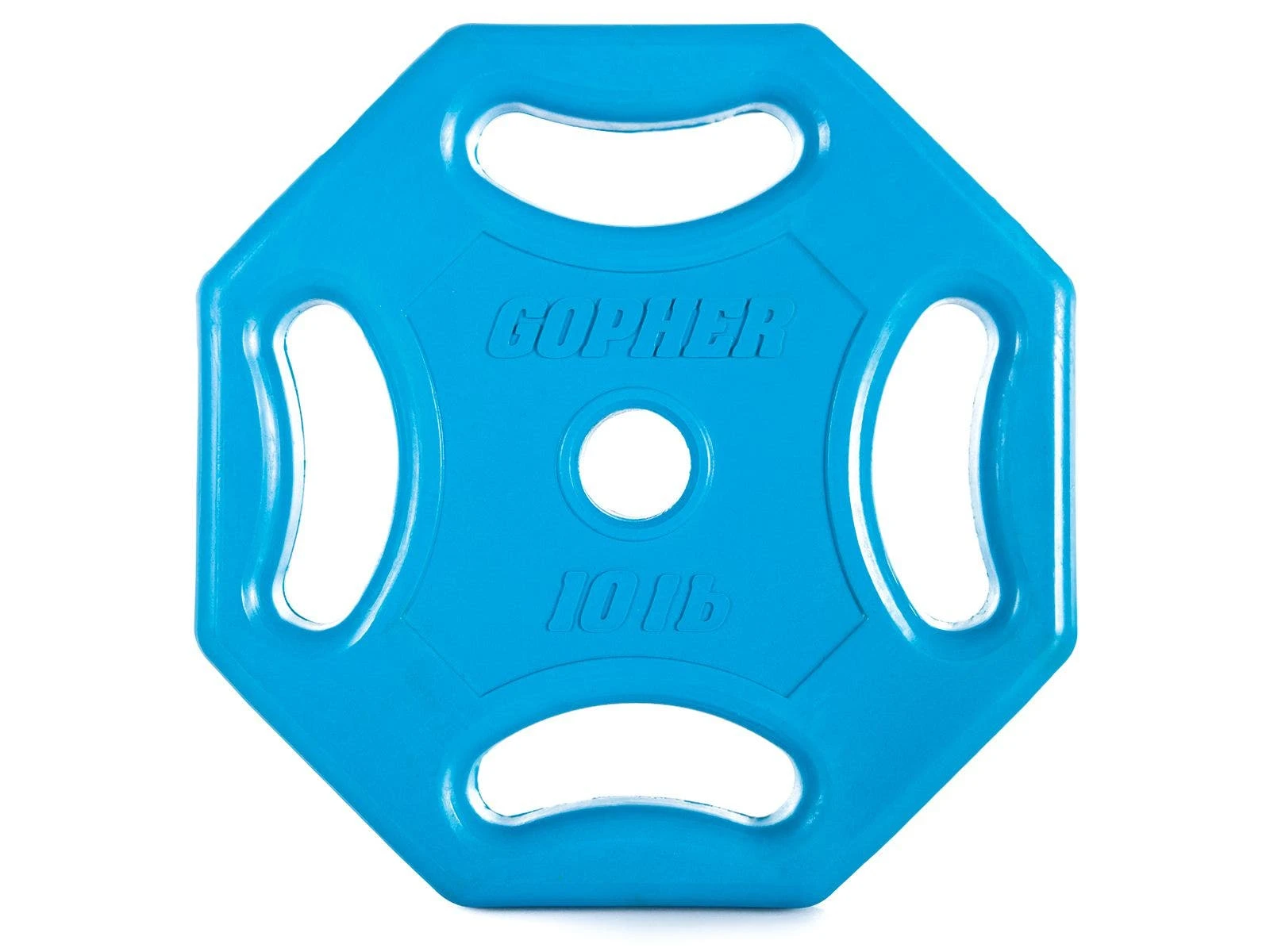 These friendly weight plates are perfect for getting beginners and young students interested in fitness. Ergonomic Cutouts make plates easy to load and unload and allows for use as free weights. Designed to fit barbells with a 1″ sleeve. A bright rubber coating protects plates and floors from damage and makes weight identification easy. A no-roll design keeps plates in place when not in use. Compatible with components of Gopher Group Barbell Sets. Available individually in 2.5 lb, 5 lb, and 10 lb.