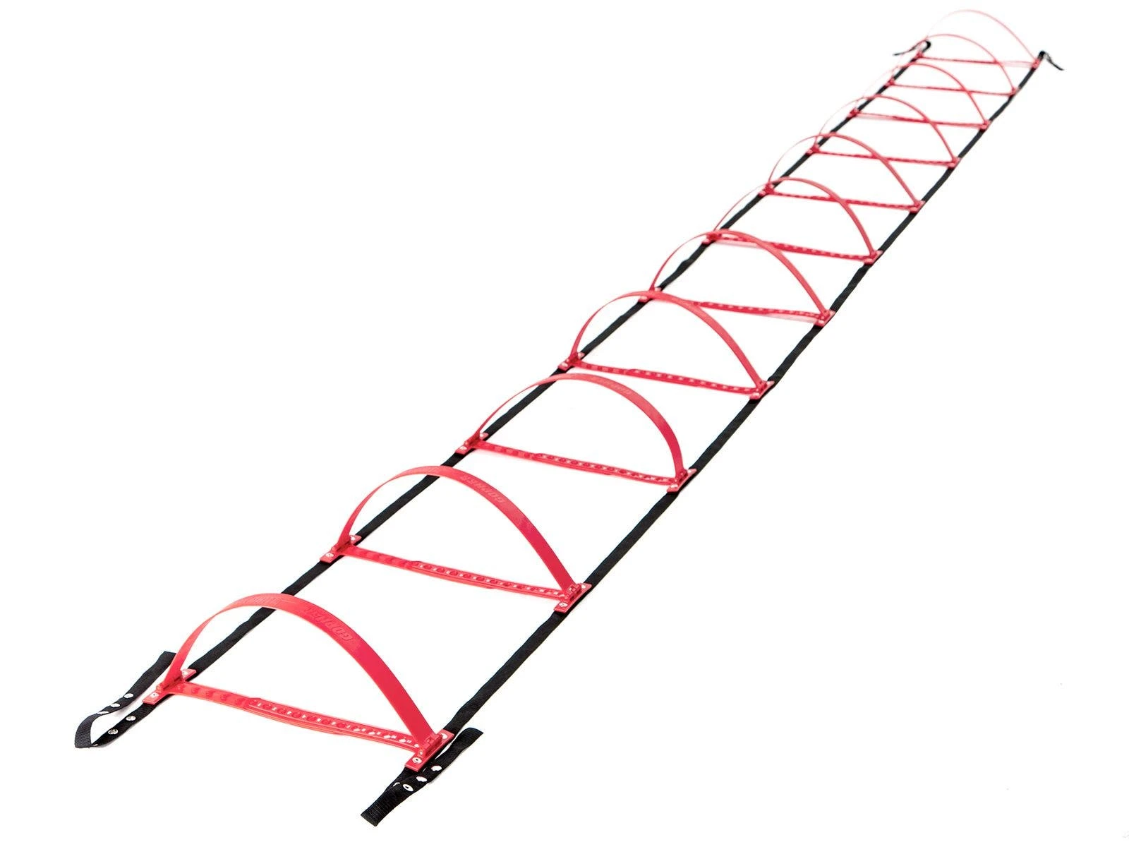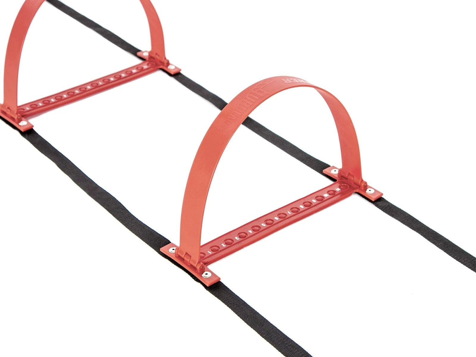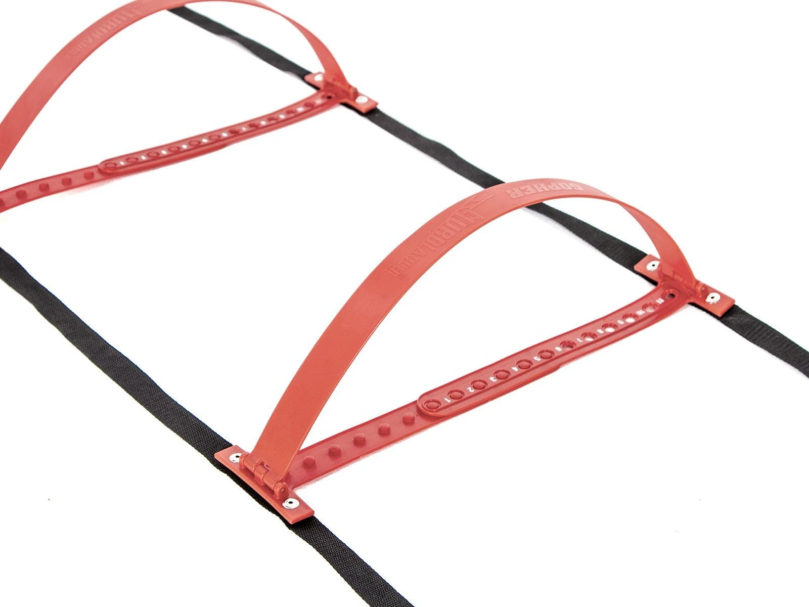 Use this ladder with rungs flat for fast footwork drills, then raise each rung to quickly switch to hurdle training! Independent snap adjustment on each rung varies the height in 1″ increments up to 9″H. Printed numbers make it simple to adjust all rungs to the same height or in set increments—there’s no need to count or guess! Pliable composite rungs bounce back when stepped on, keeping drills on time. The ladder’s durable nylon webbing is lightweight and easy to transport. Clips on each end of the ladder allow users to easily attach multiple ladders for longer drills. Ladder is 18’L x 24″W.