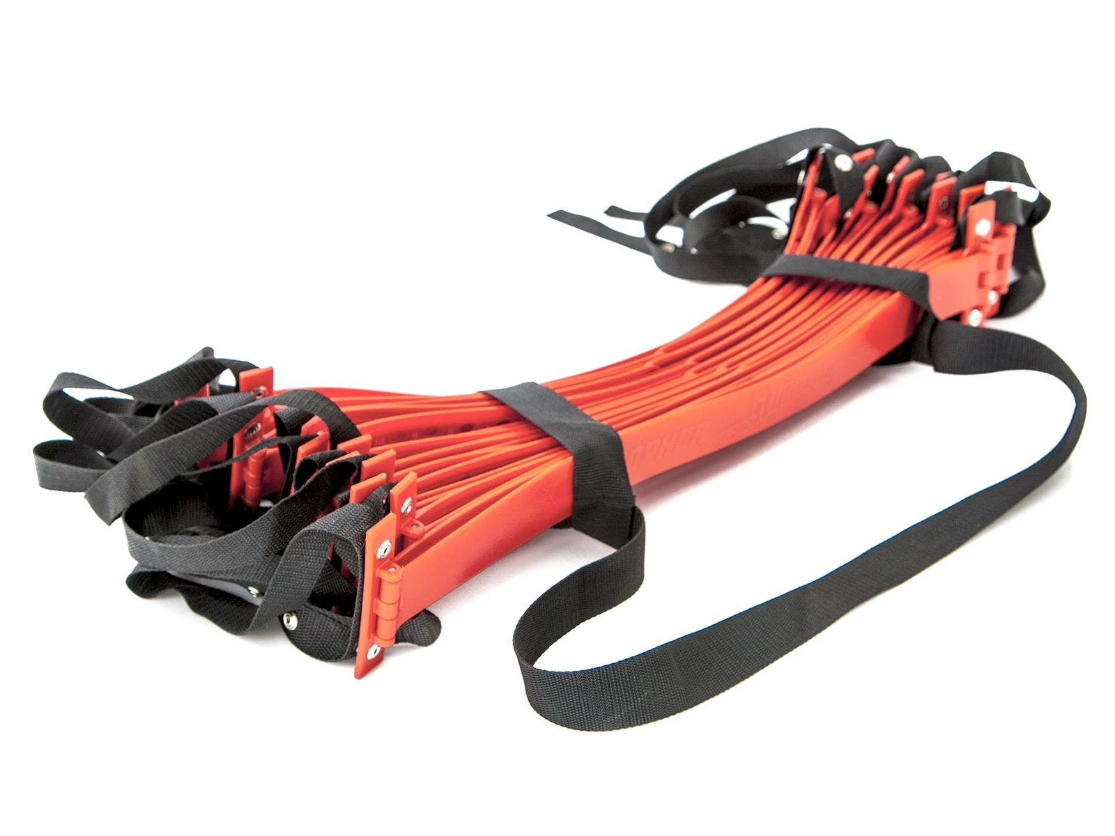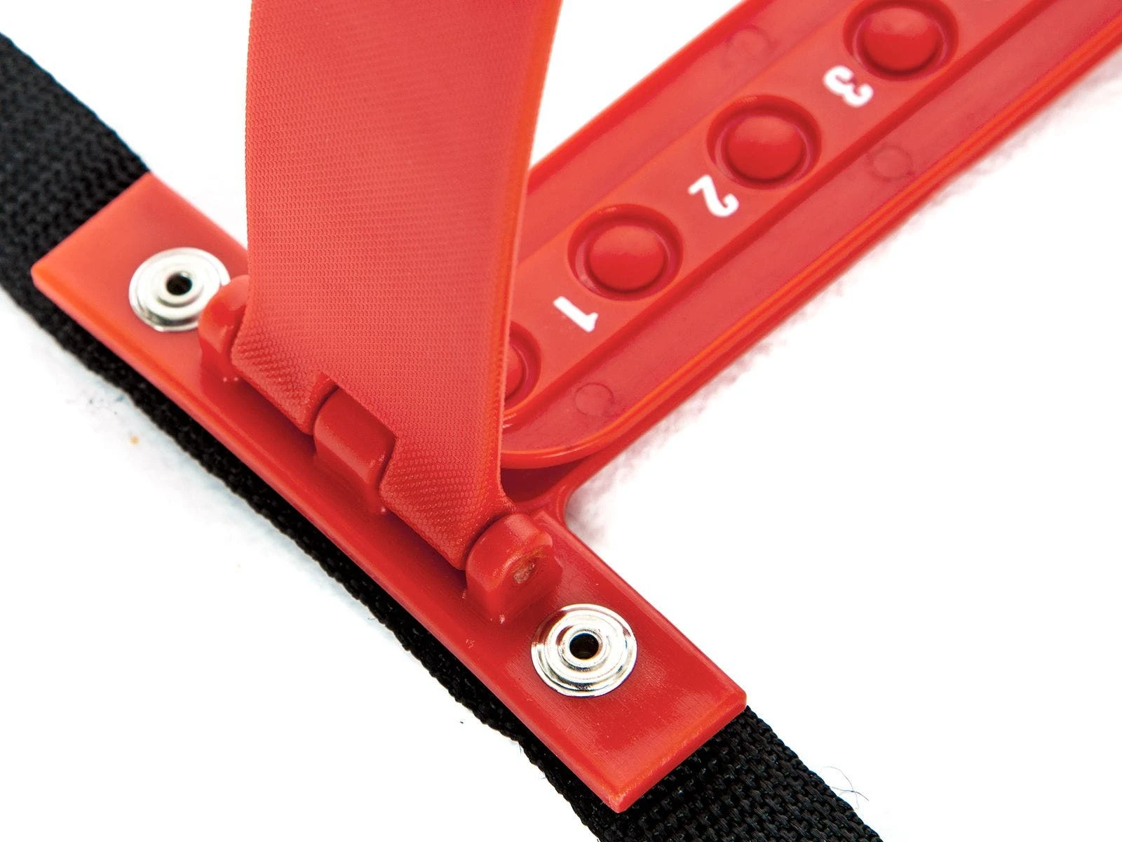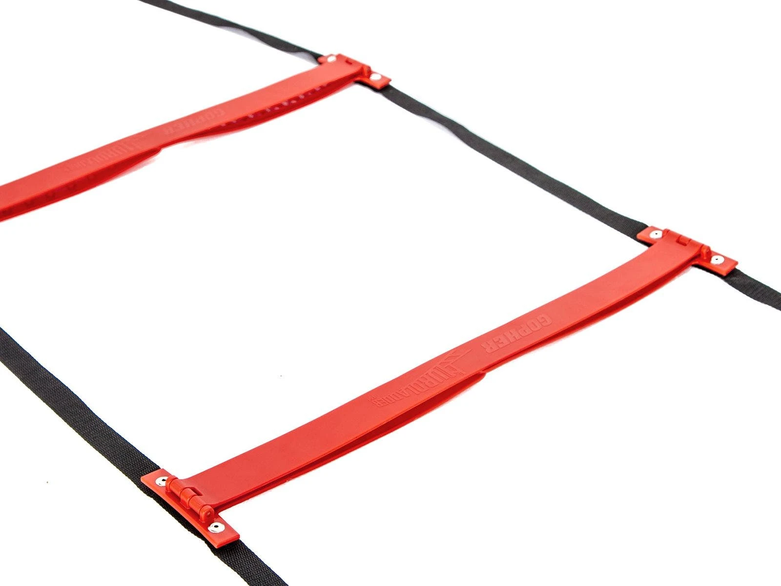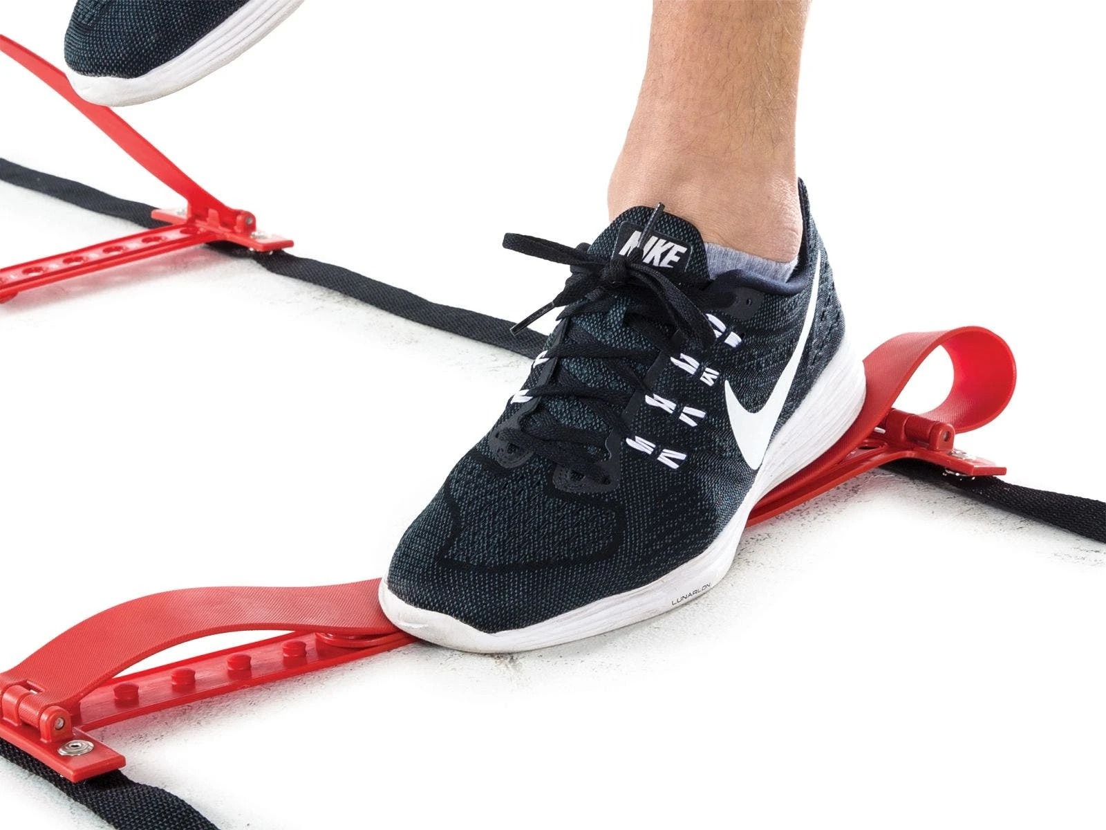 Use this ladder with rungs flat for fast footwork drills, then raise each rung to quickly switch to hurdle training! Independent snap adjustment on each rung varies the height in 1″ increments up to 9″H. Printed numbers make it simple to adjust all rungs to the same height or in set increments—there’s no need to count or guess! Pliable composite rungs bounce back when stepped on, keeping drills on time. The ladder’s durable nylon webbing is lightweight and easy to transport. Clips on each end of the ladder allow users to easily attach multiple ladders for longer drills. Ladder is 18’L x 24″W.