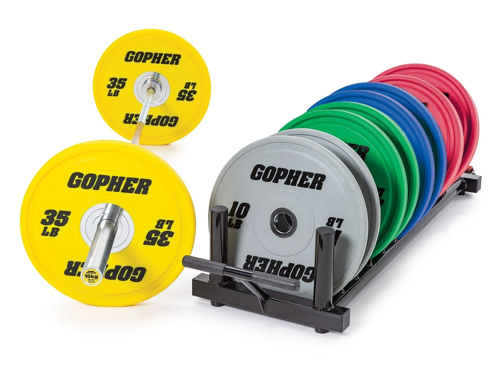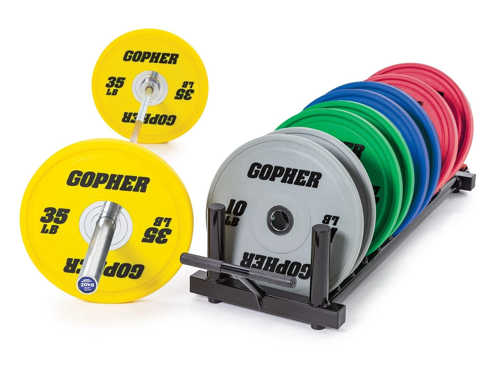 Our most professional bumper plates now come in a convenient pack with a Men’s or Women’s bar, plus plate storage. Plates are made with premium urethane that stands up to rugged institutional use. Color-coding by weight makes for quick selection. Store plates when not in use on a horizontal plate rack, 56-1/2″Lx 17″W x 11″H, 31 lb.