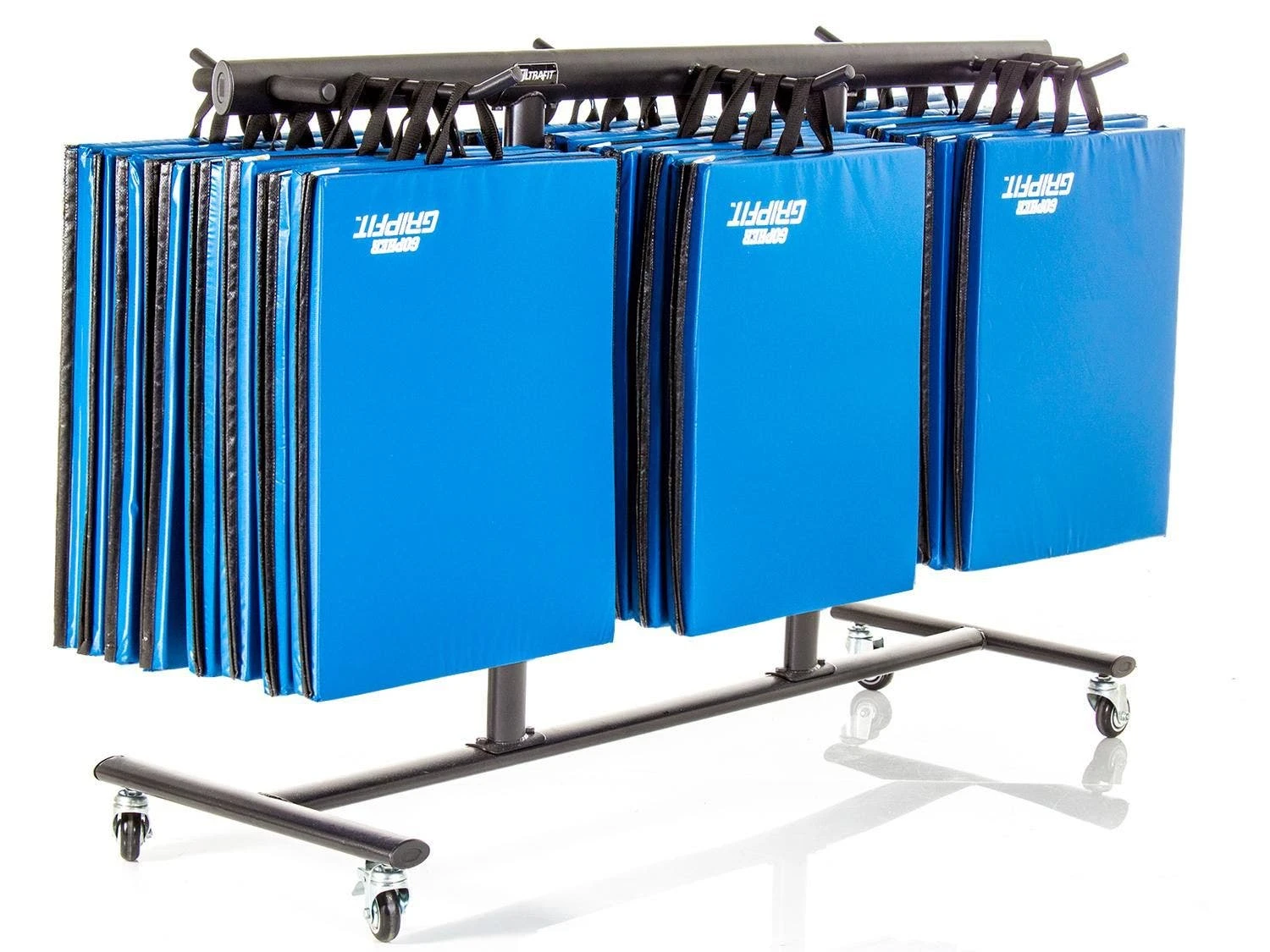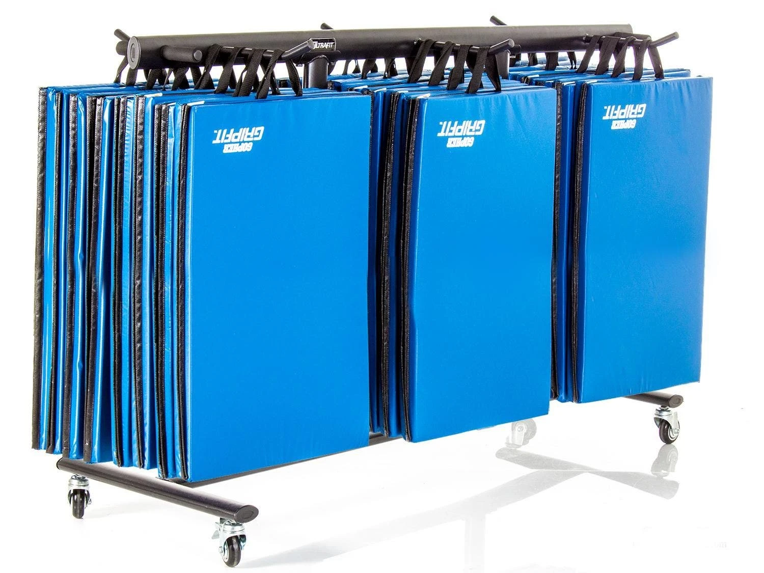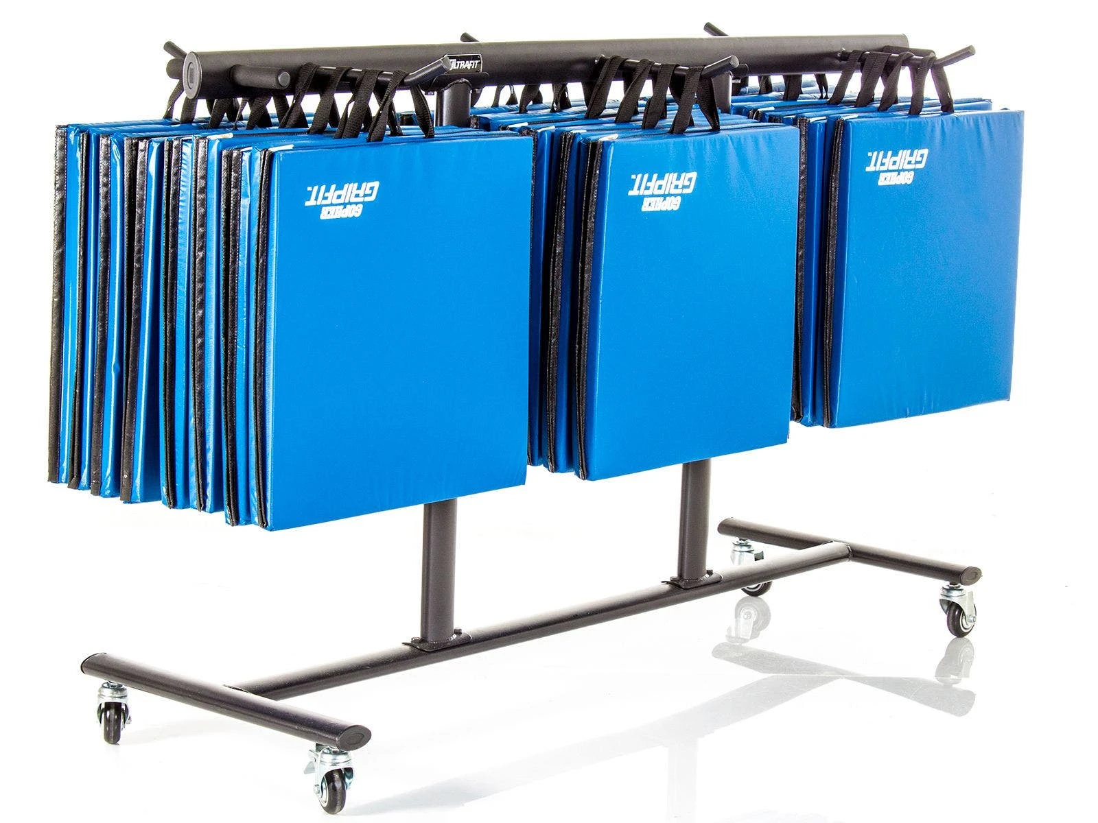 GripFit Mats are 2’W x 1″ thick. ClassPlus Packs include 24 mats and an UltraFit Steel MatMover Cart (58”L x 27”W x 41-1/2”H).