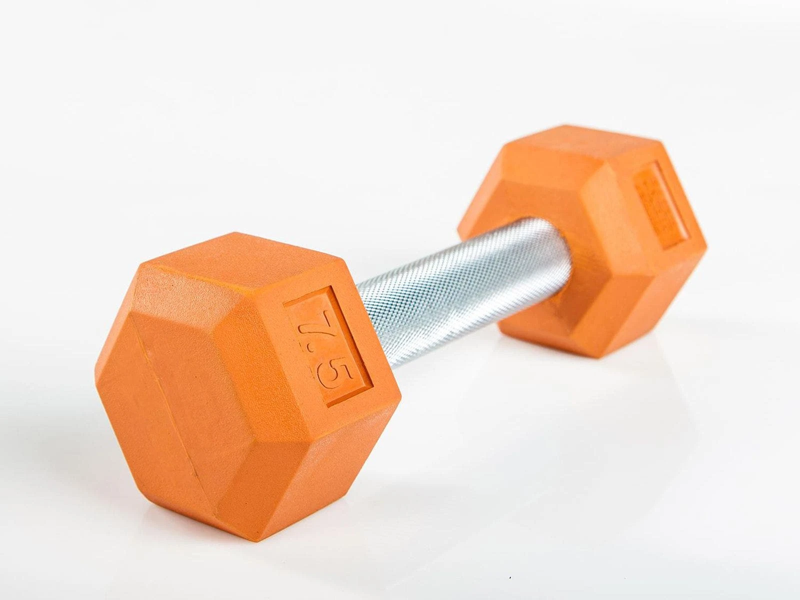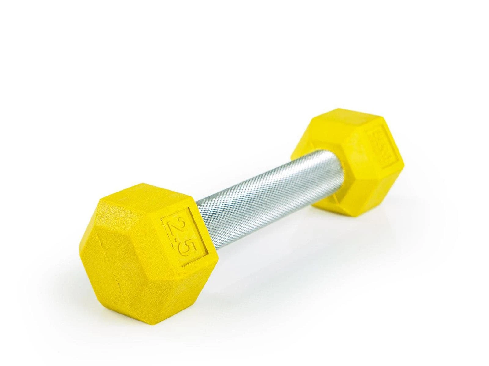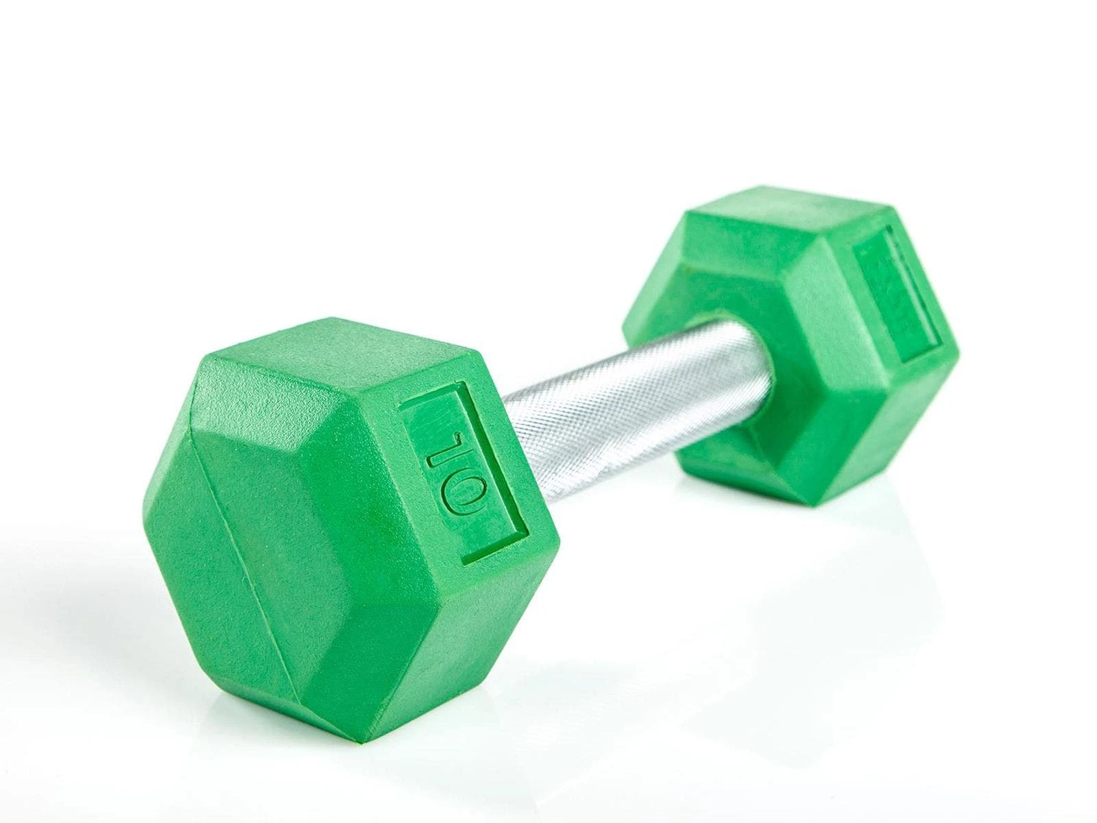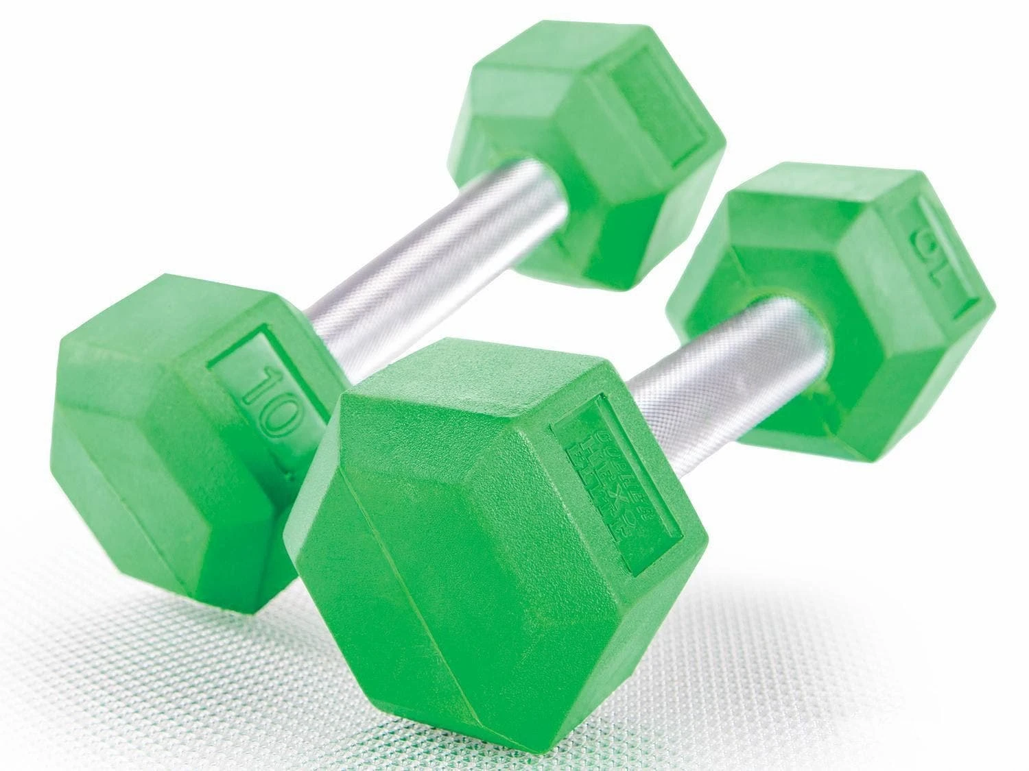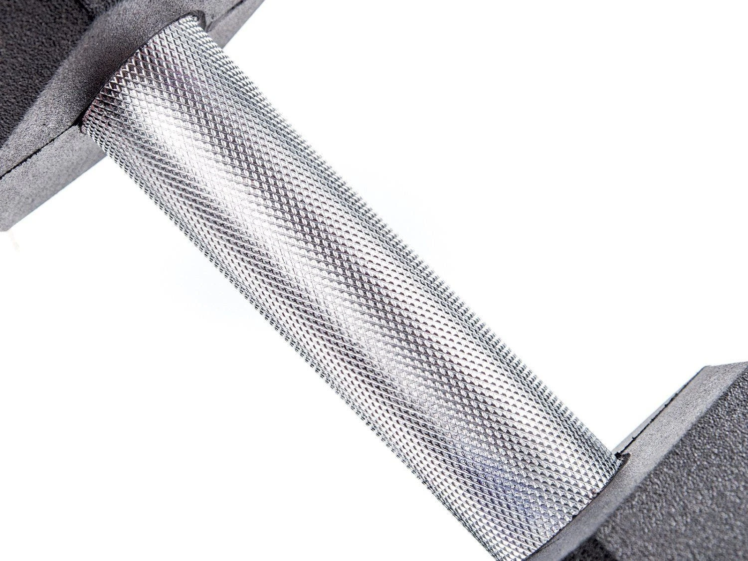 Satin hard chrome handles offer full knurling for the most secure grip, even when hands are sweaty. Textured grip extends all the way into dumbbell ends for increased handling and control during a wider variety of exercises. Bright colors identify each weight so users quickly select the appropriate dumbbell.