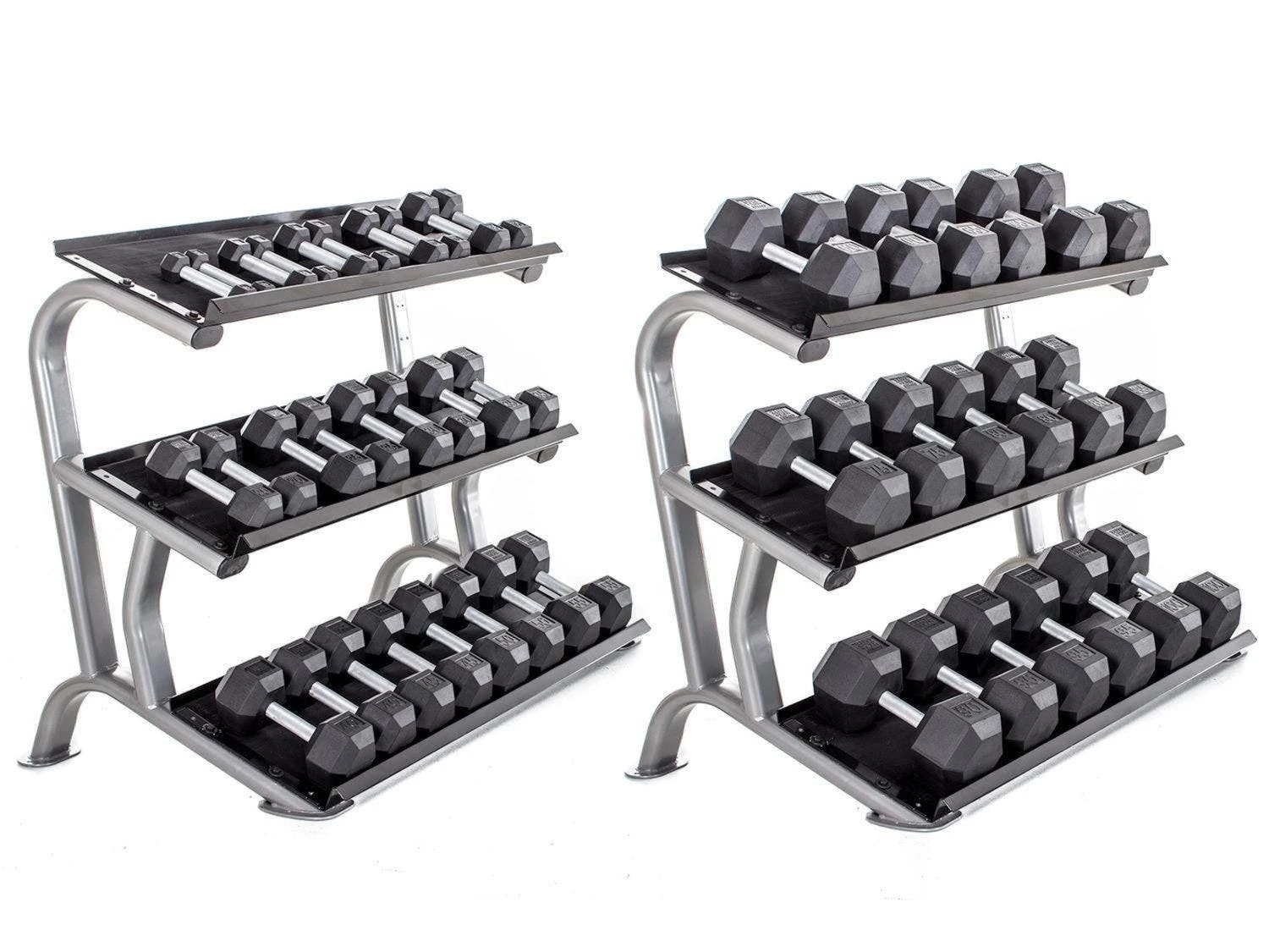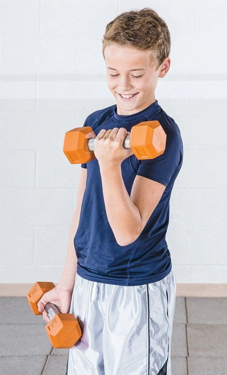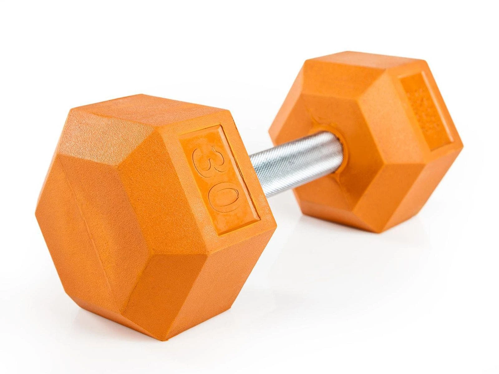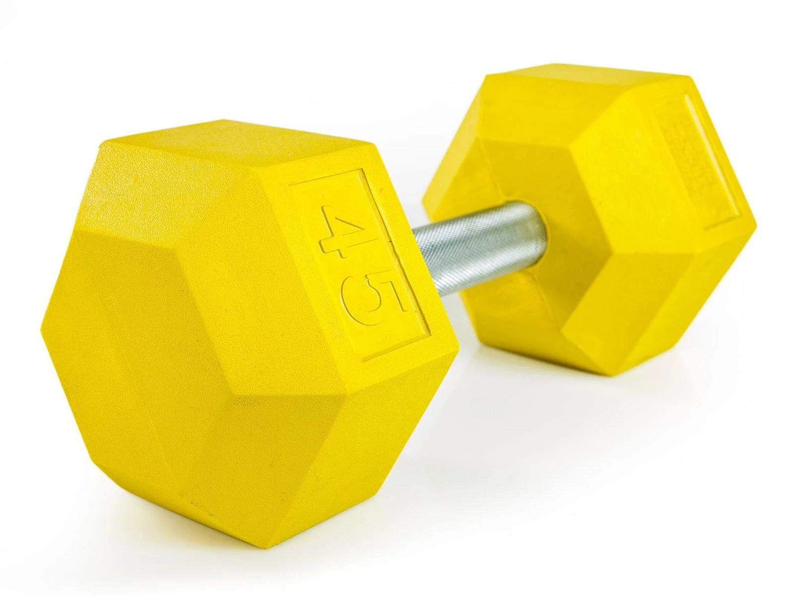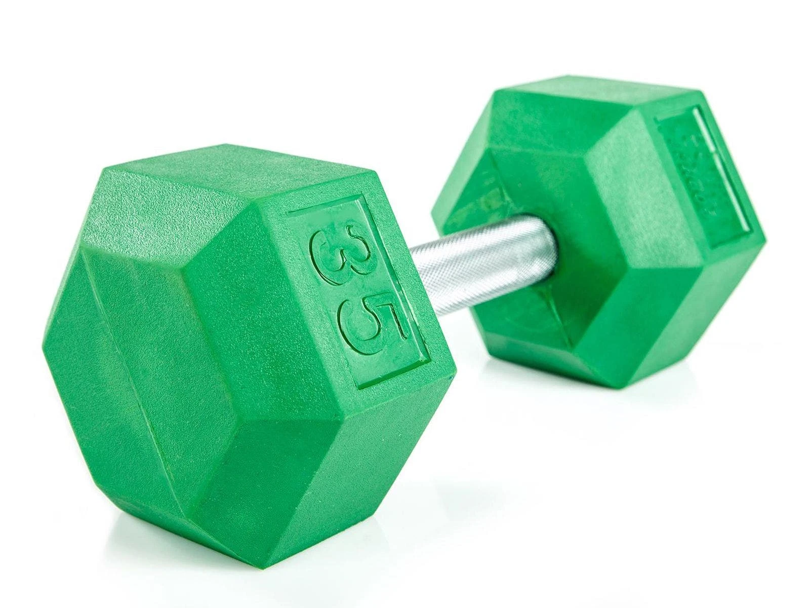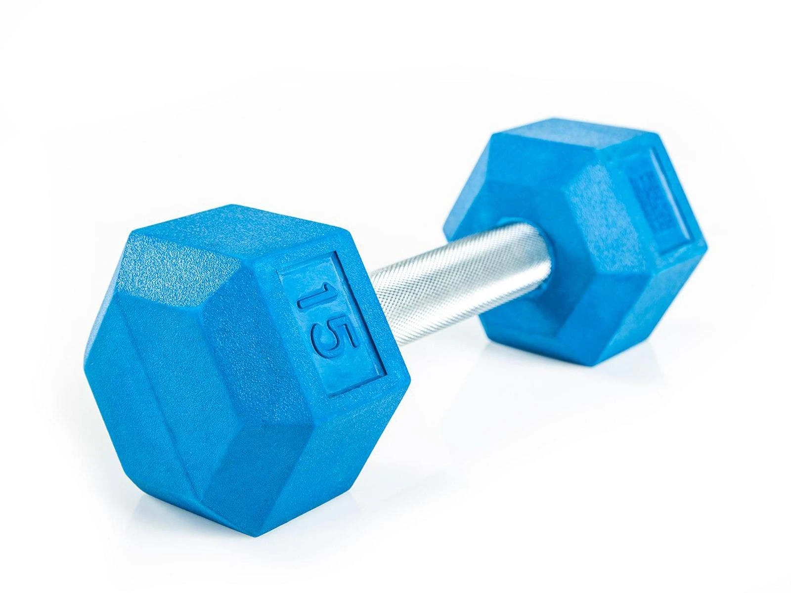 Satin hard chrome handles offer full knurling for the most secure grip, even when hands are sweaty. Textured grip extends all the way into dumbbell ends for increased handling and control during a wider variety of exercises. Bright colors identify each weight so users quickly select the appropriate dumbbell.