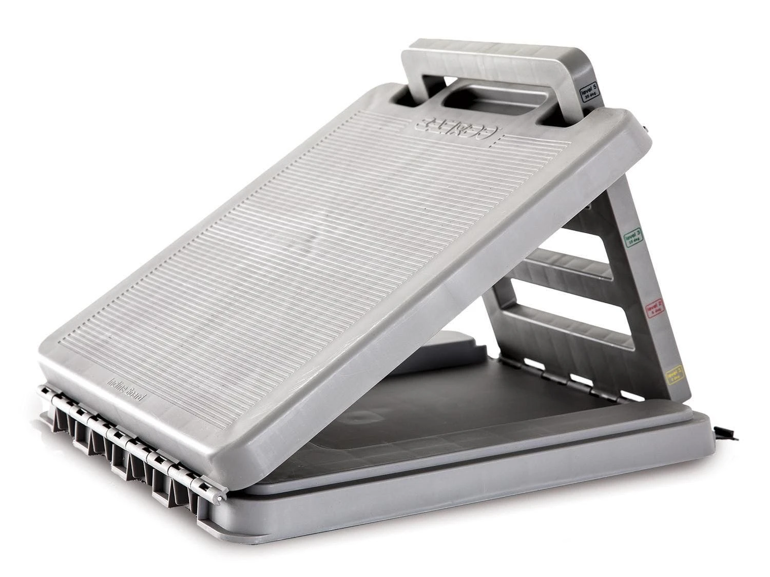 - Plastic Board features 4 levels of adjustment, from 5 to 35 degrees. It supports 500. 15″L x 15″W x 2″H, 8 lb.