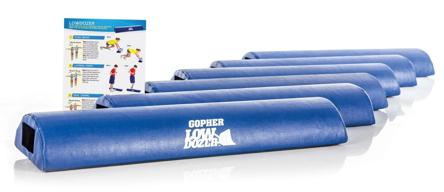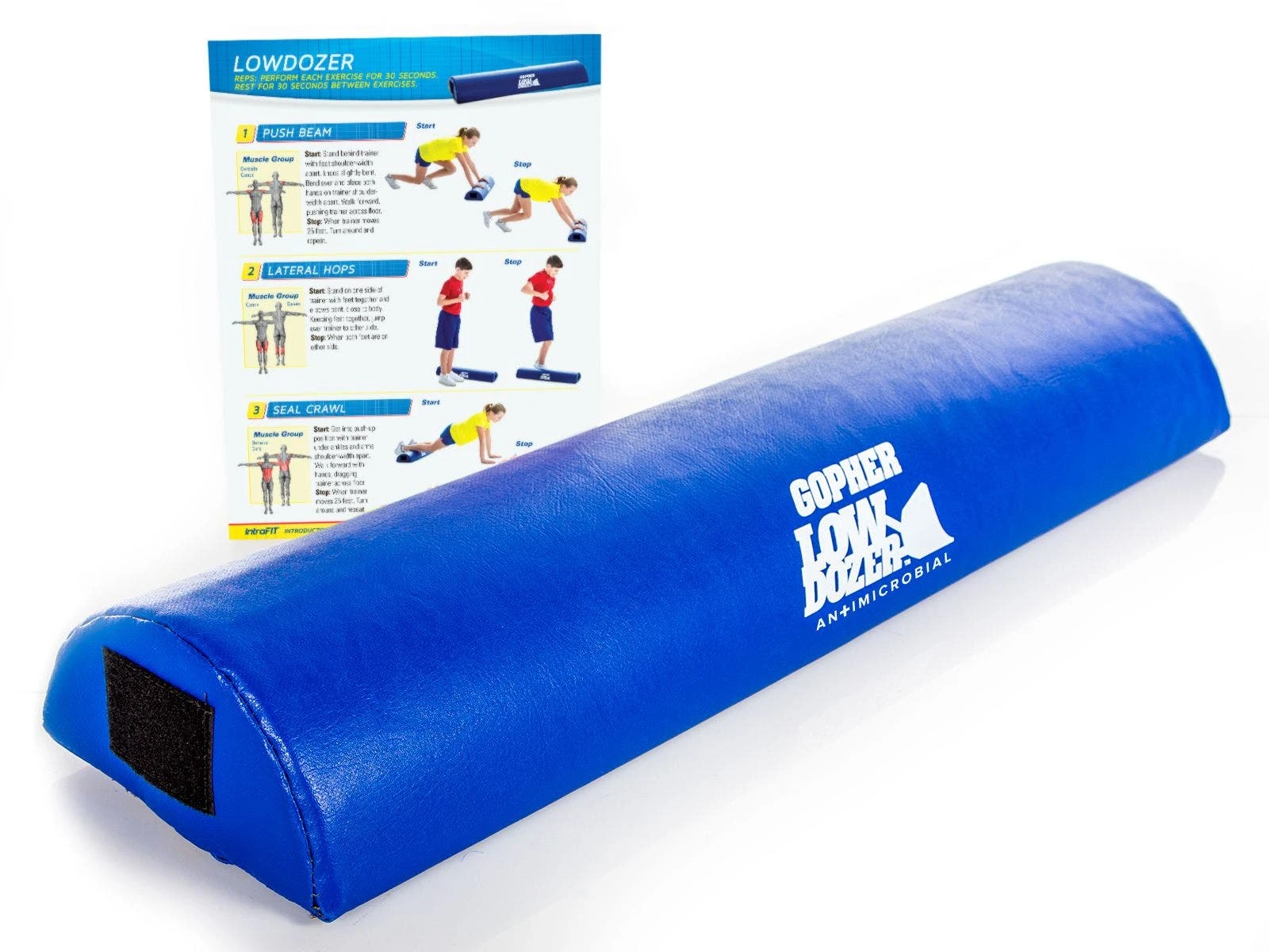 Push for great results with the IntroFit LowDozer. A weighted foam beam mimics movements performed with a speed sled in a safe and non-intimidating manner. Use it individually for pushes and drags or partner up for friendly competition. Hearty vinyl covering protects floors, prevents injury, and includes antimicrobial product protection. Connect multiple trainers via the hook-and-loop fastener ends to get classmates collaborating on fitness goals! Trainer is 30″L x 8″W x 4″H, 5 lb. Set includes 6 trainers and a laminated exercise guide.