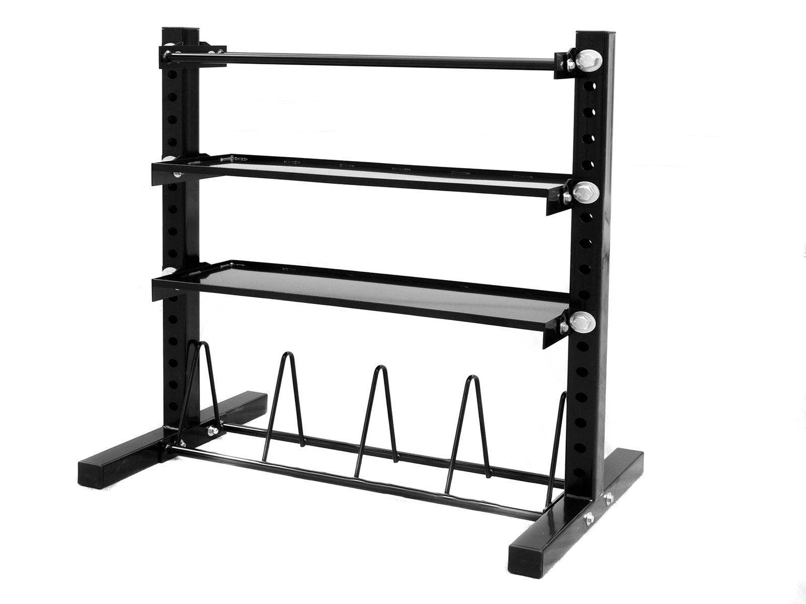 Athletes can grab a variety of common training implements from this dynamic storage unit in seconds. Compact design is perfect for small, functional training spaces and allows for quick transitions between movements, especially when placed next to racks or platforms and loaded with training accessories. Equipment is clearly visible and easy as athletes move through programming. Tough 3″ x 3″ 11-gauge tubing is protected by glossy black powder-coating. Features 1 medicine ball shelf (60″L x 3″H x 12″D), 2 kettlebell/dumbbell shelves (60″L x 3″H x 14-1/2″D), and 1 weight plate storage area (60″L x 13-3/4″H x 12″D) with 14-1/4″ between dividers. The unit itself is 66″L x 57-1/4″H x 30-1/2″D.