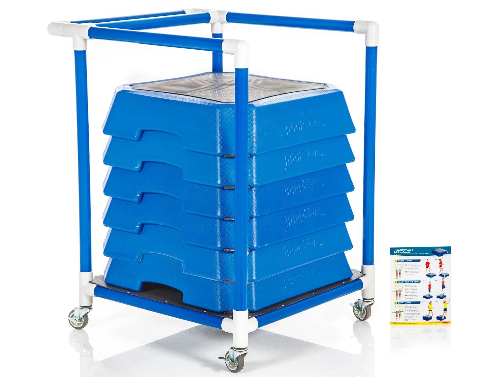 Complete set includes storage cart and activity instructions to get a group training quickly. Cart provides quick and easy transport from location to location. Instruction guide shows 6 movements for beginners, focused specifically on explosive strength.