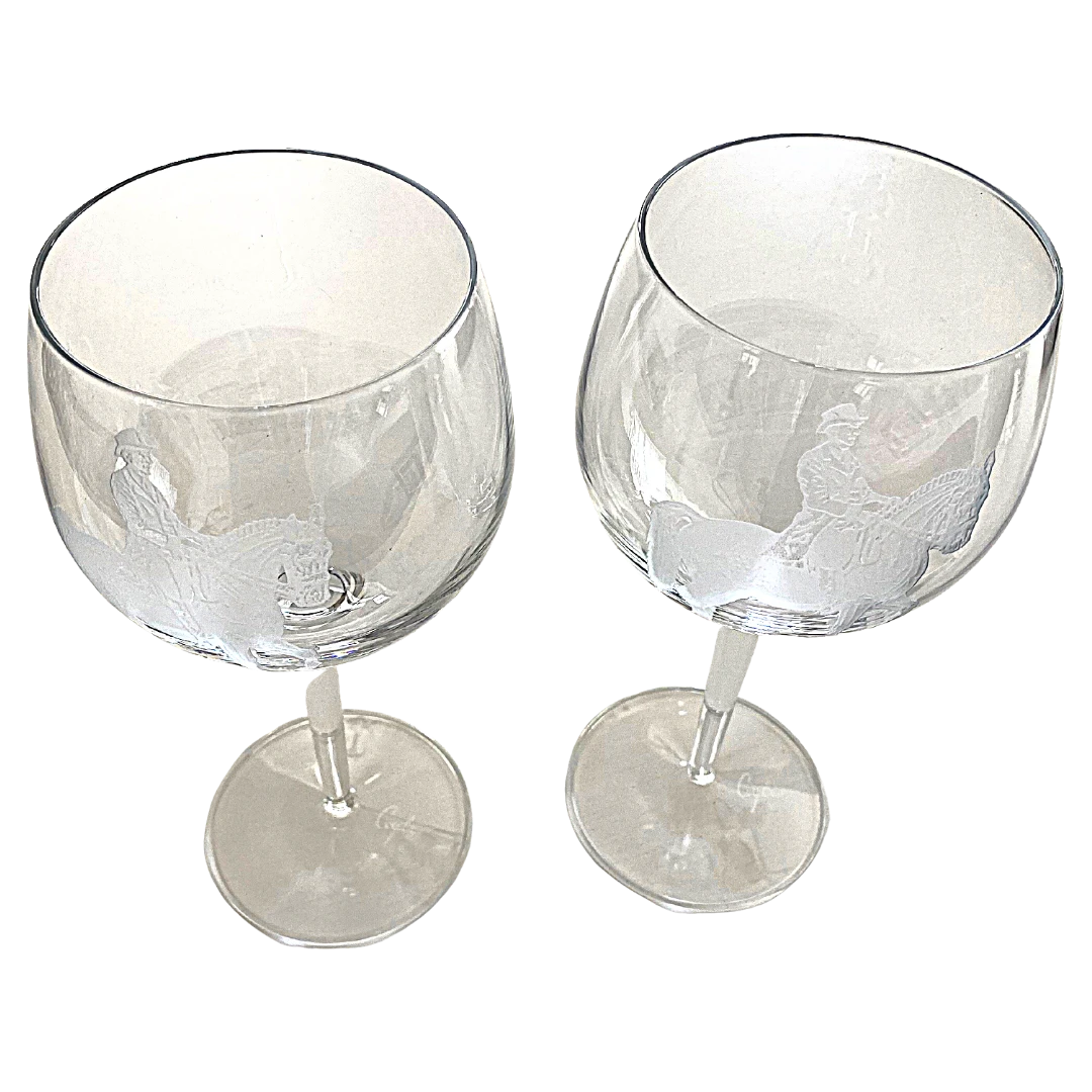 Lorraine Coyle Signed Etched Sand Carved Rider on Horseback Crystal Goblet Set of 2