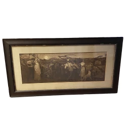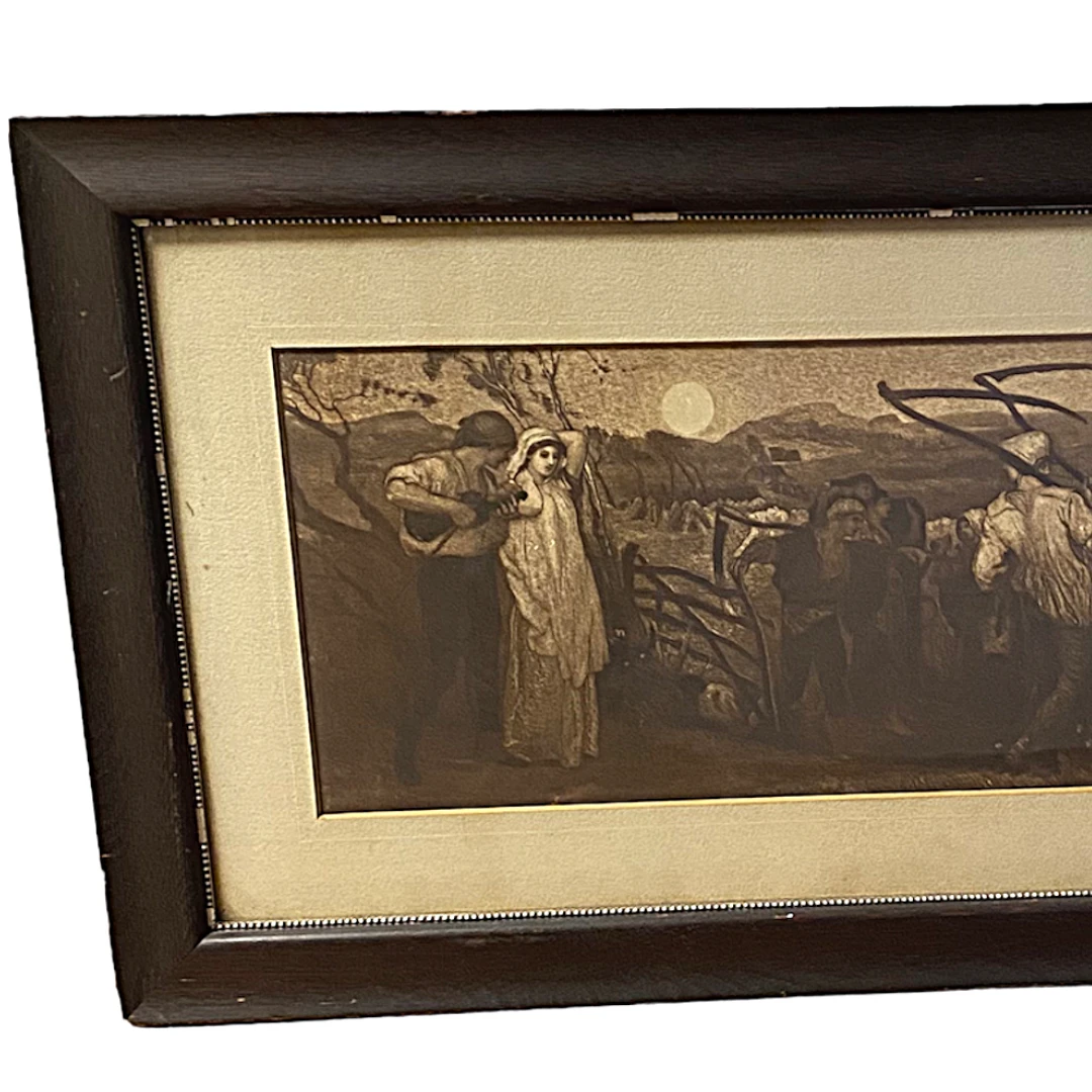 Mezzotint Continental Origin Harvest Courtship Scene Original Matting & Wood Slat Back Late 1800s Artwork