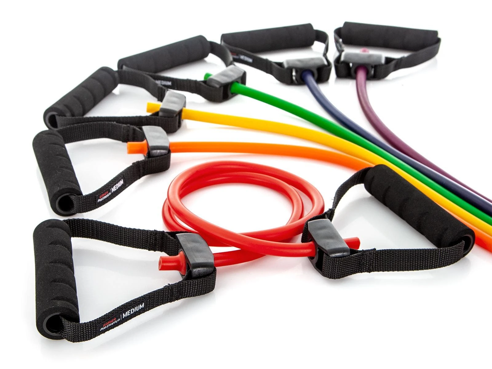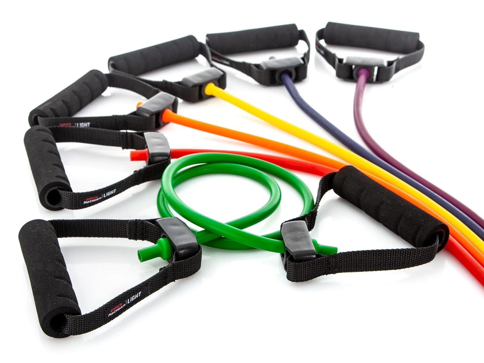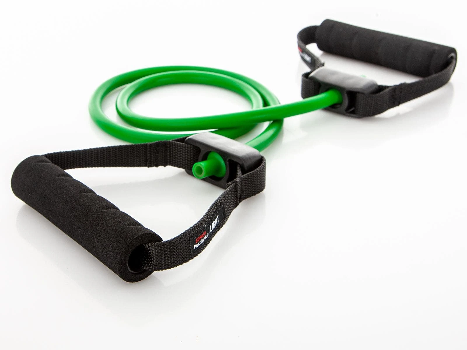 Handles are covered in a contoured soft foam that’s easy on hands and comfortable to grip throughout the entire workout. Progressive-layered latex tubing allows for supremely consistent resistance throughout movements. Tubes connect to handles via nylon straps and a durable plastic piece that cradles the tubing end, enhancing the security and longevity of the tube. Available individually or in Rainbow Sets of 6 tubes (light or medium resistance).