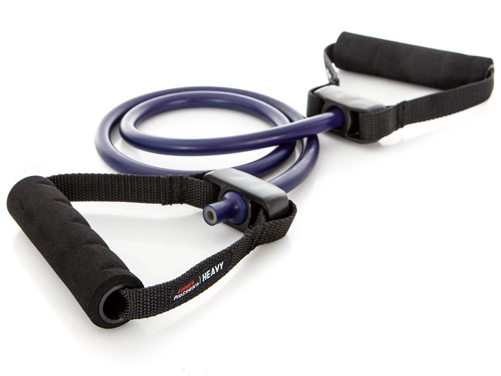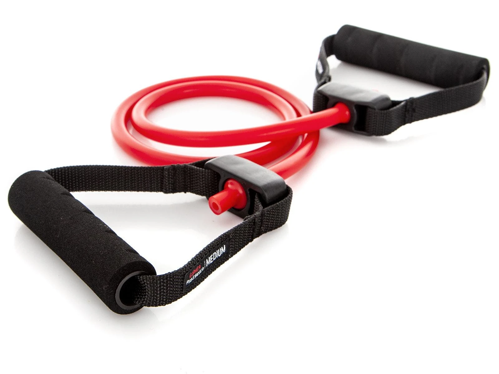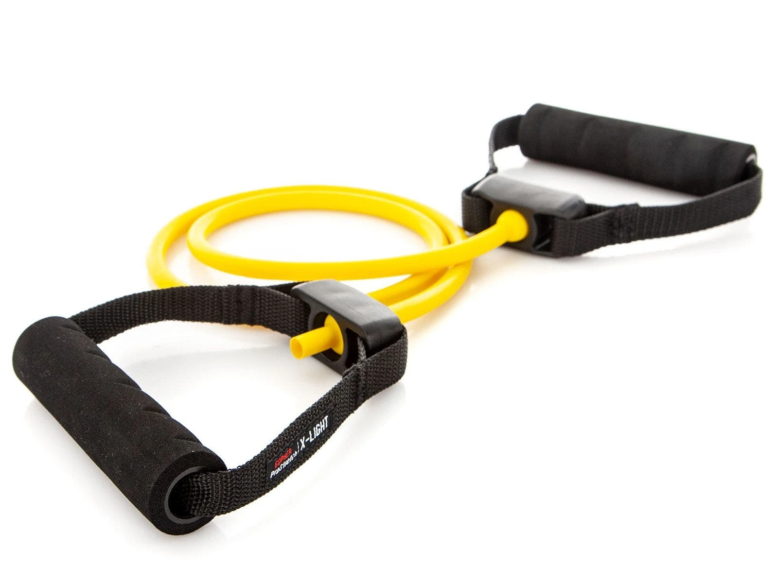 Handles are covered in a contoured soft foam that’s easy on hands and comfortable to grip throughout the entire workout. Progressive-layered latex tubing allows for supremely consistent resistance throughout movements. Tubes connect to handles via nylon straps and a durable plastic piece that cradles the tubing end, enhancing the security and longevity of the tube. Available individually or in Rainbow Sets of 6 tubes (light or medium resistance).