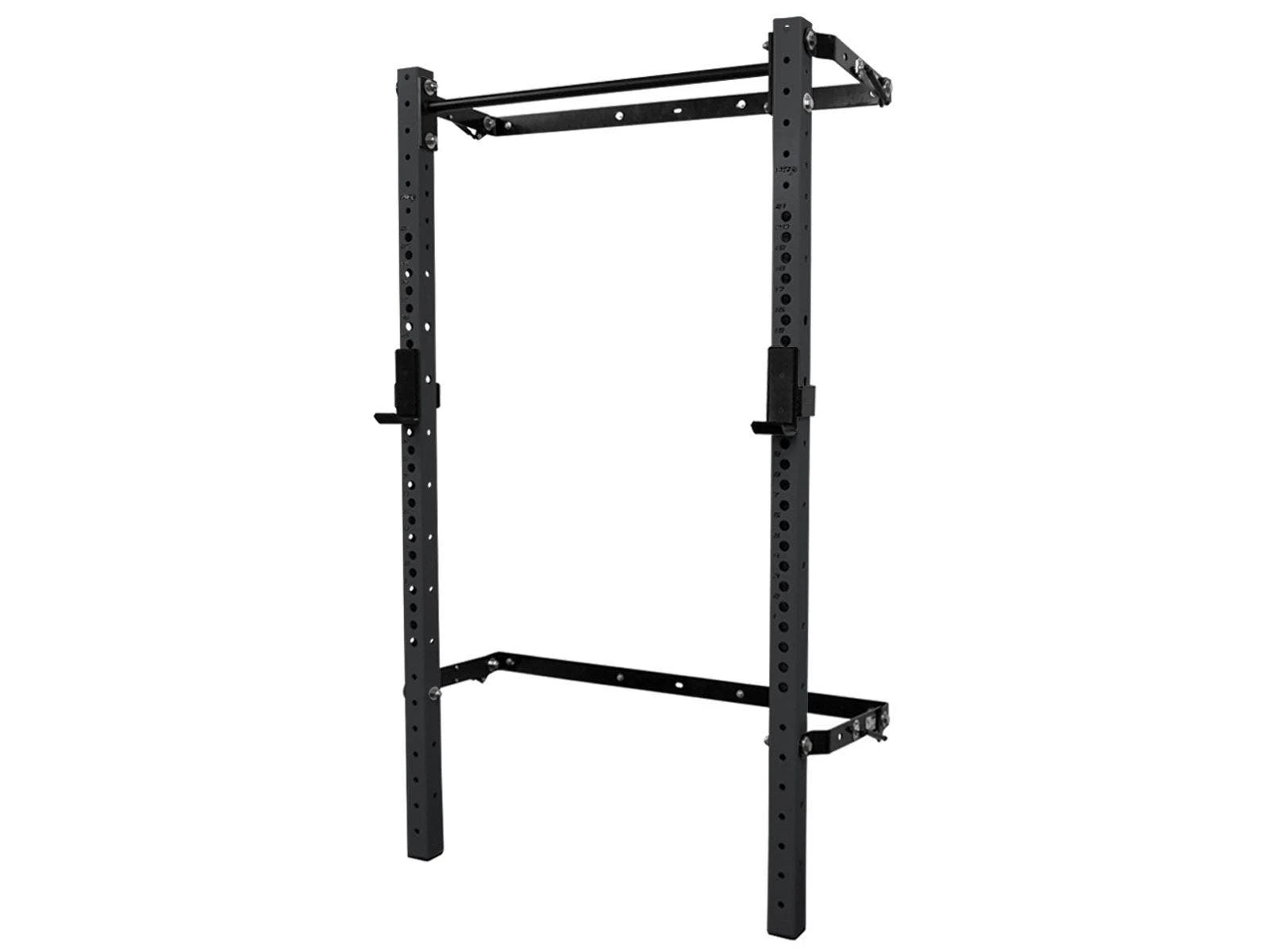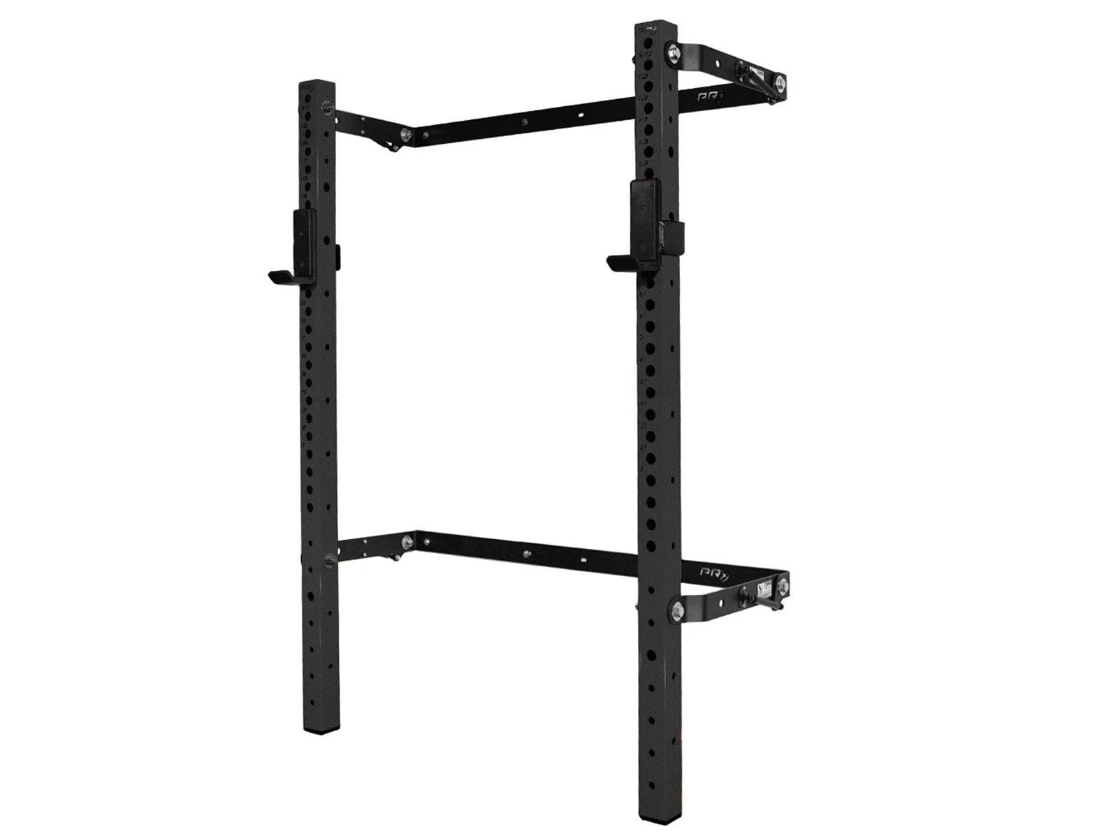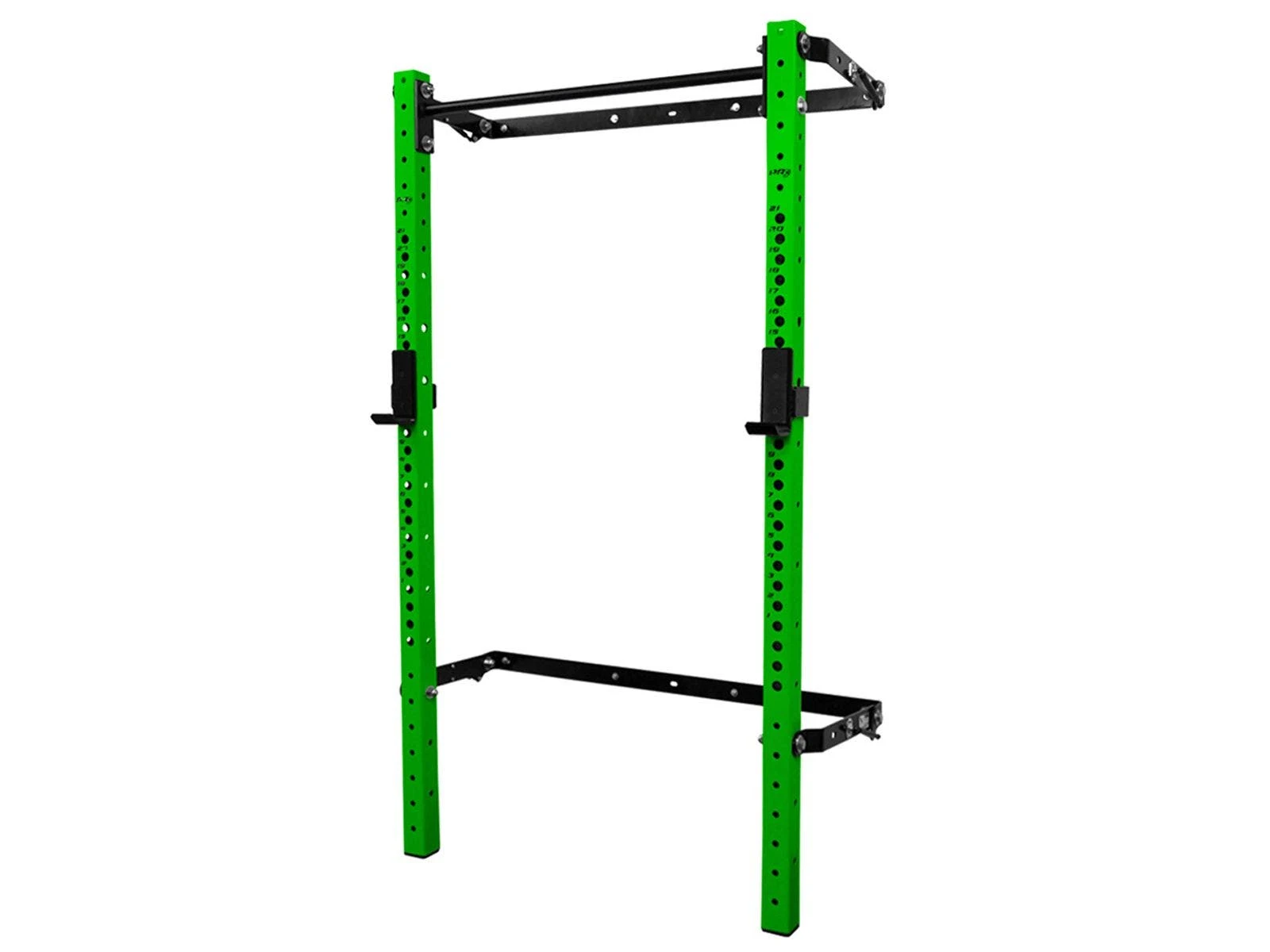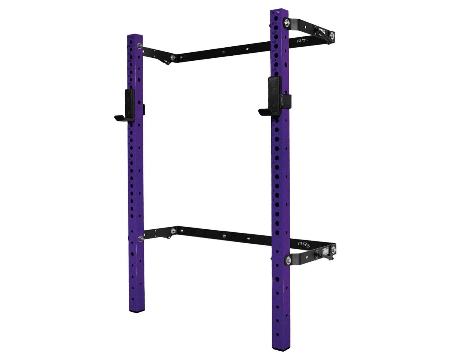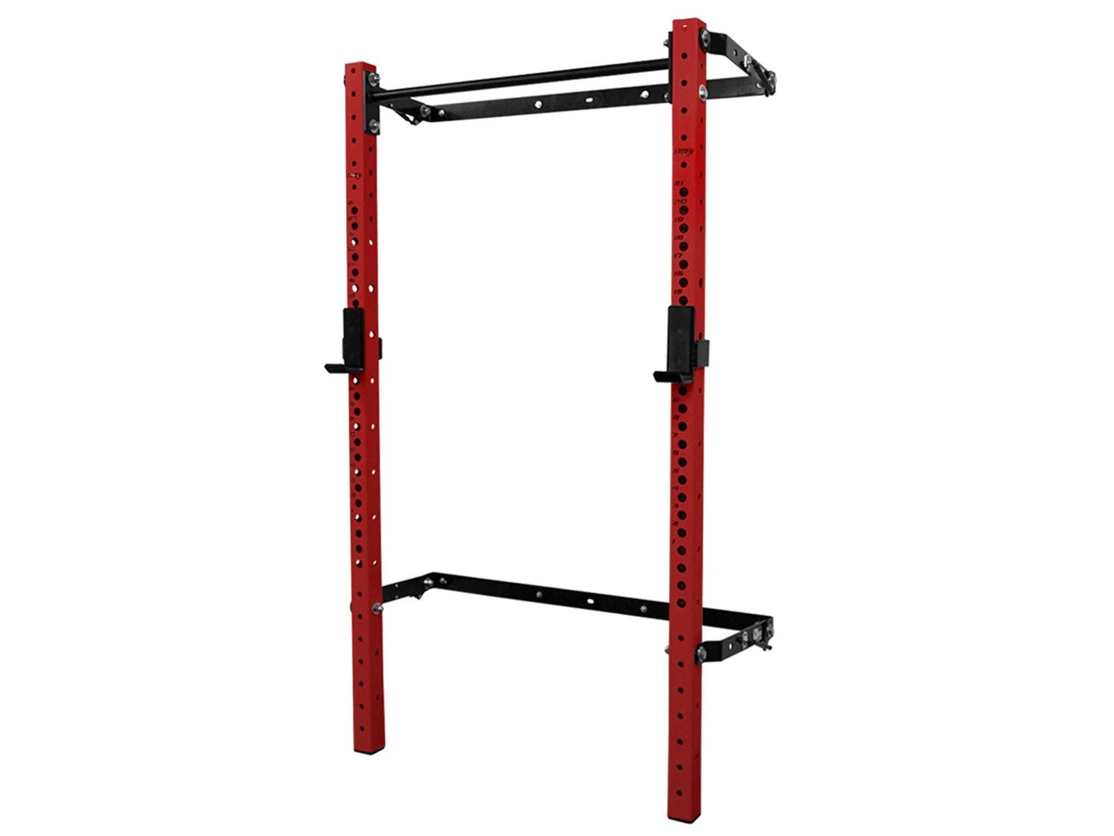 Efficiently use limited space in weight rooms or small commercial facilities with wall-mounted squat racks that collapse to nearly flush with the wall when not in use. The rack hinges to fold up against the wall, sacrificing just 4” of floor space when not in use.