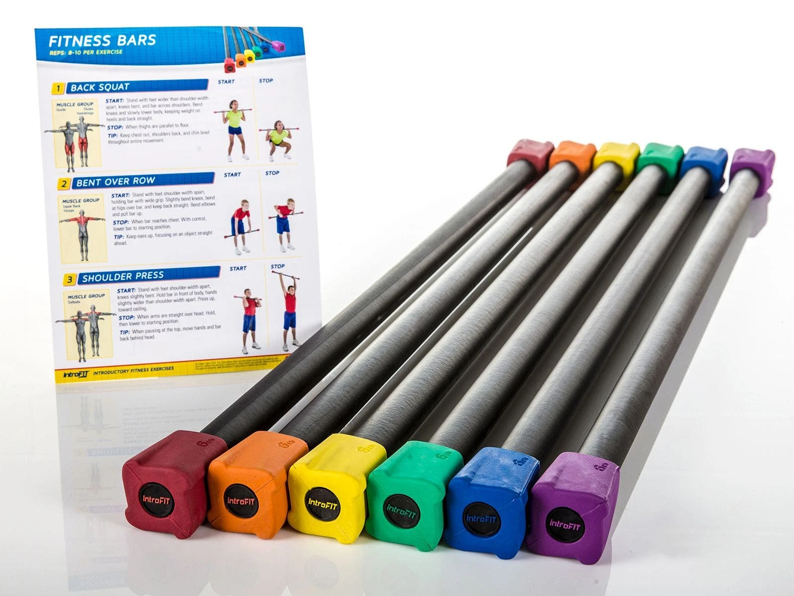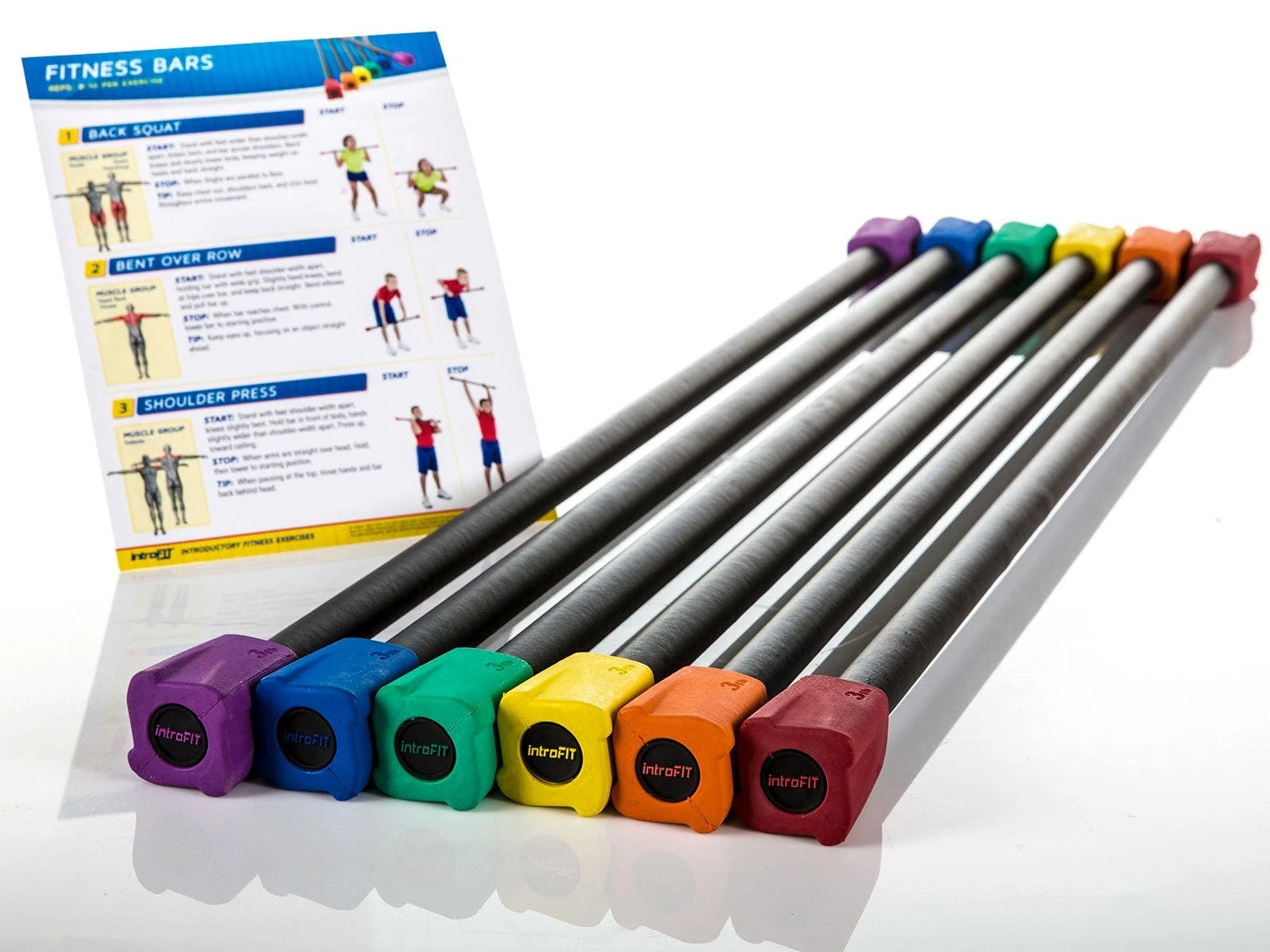 IntroFit Fitness Bars are available in Sets of 6, in 2 weights, with a laminated exercise guide.