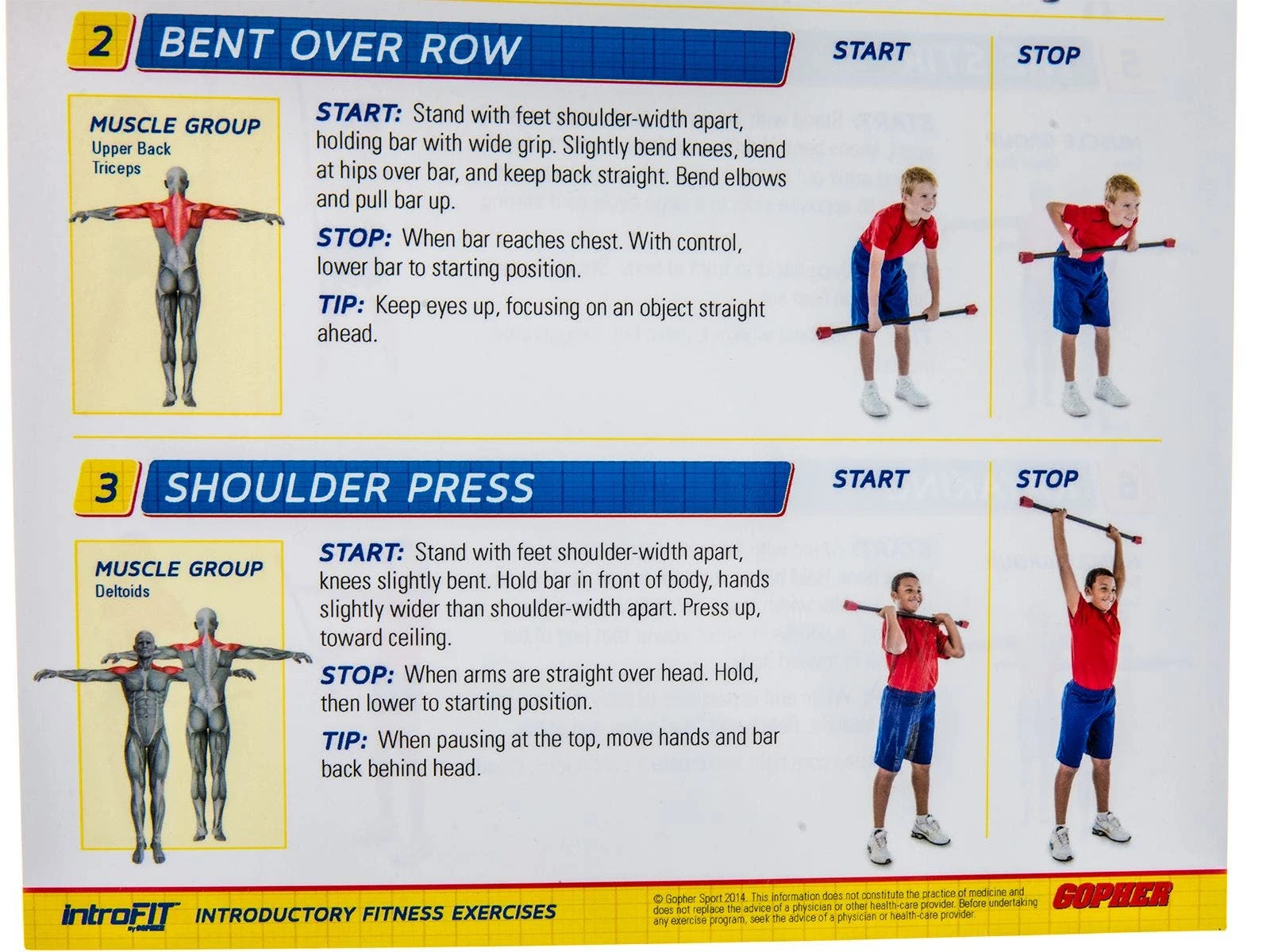 - Laminated activity guide shows 6 fitness bar exercises to use with beginner students. No research is required to provide thorough instruction to your students! Exercises focus on strength and body awareness, as well as coordination.