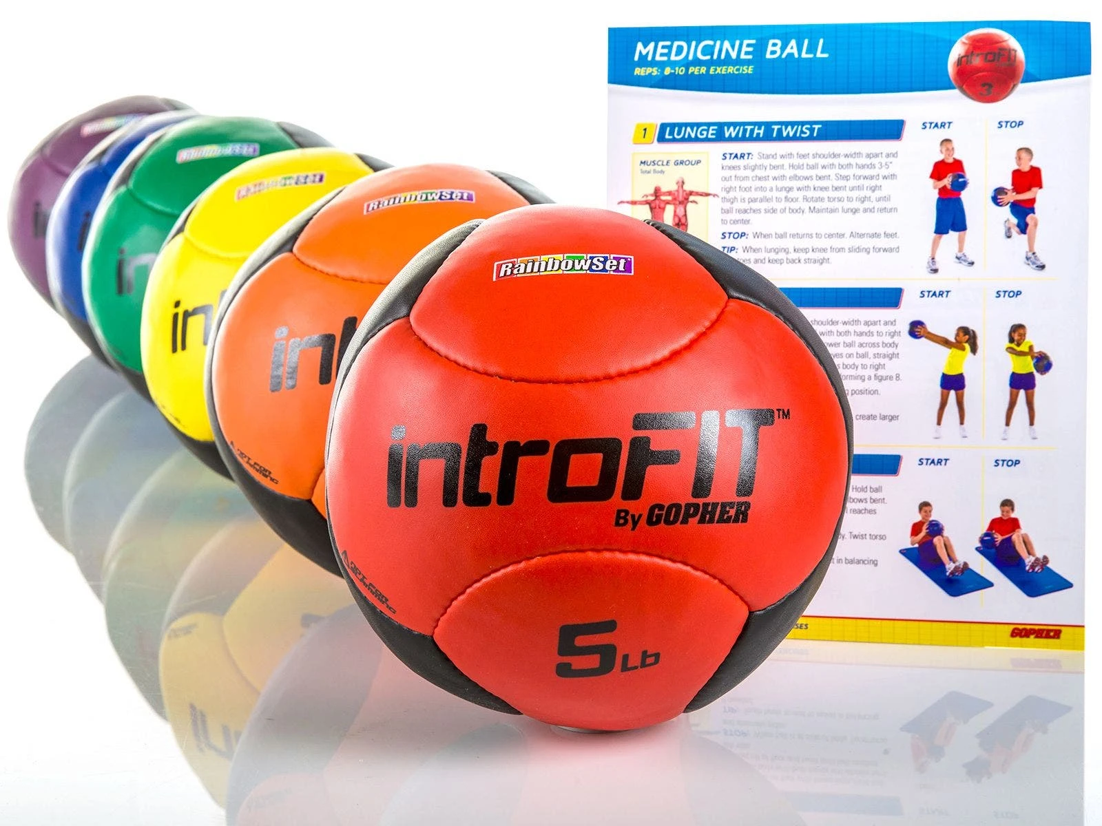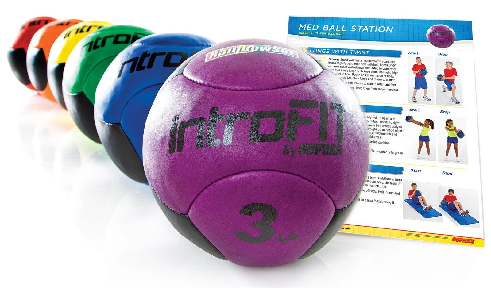 - Rainbow Sets. Include 6 medicine balls and a laminated exercise guide.