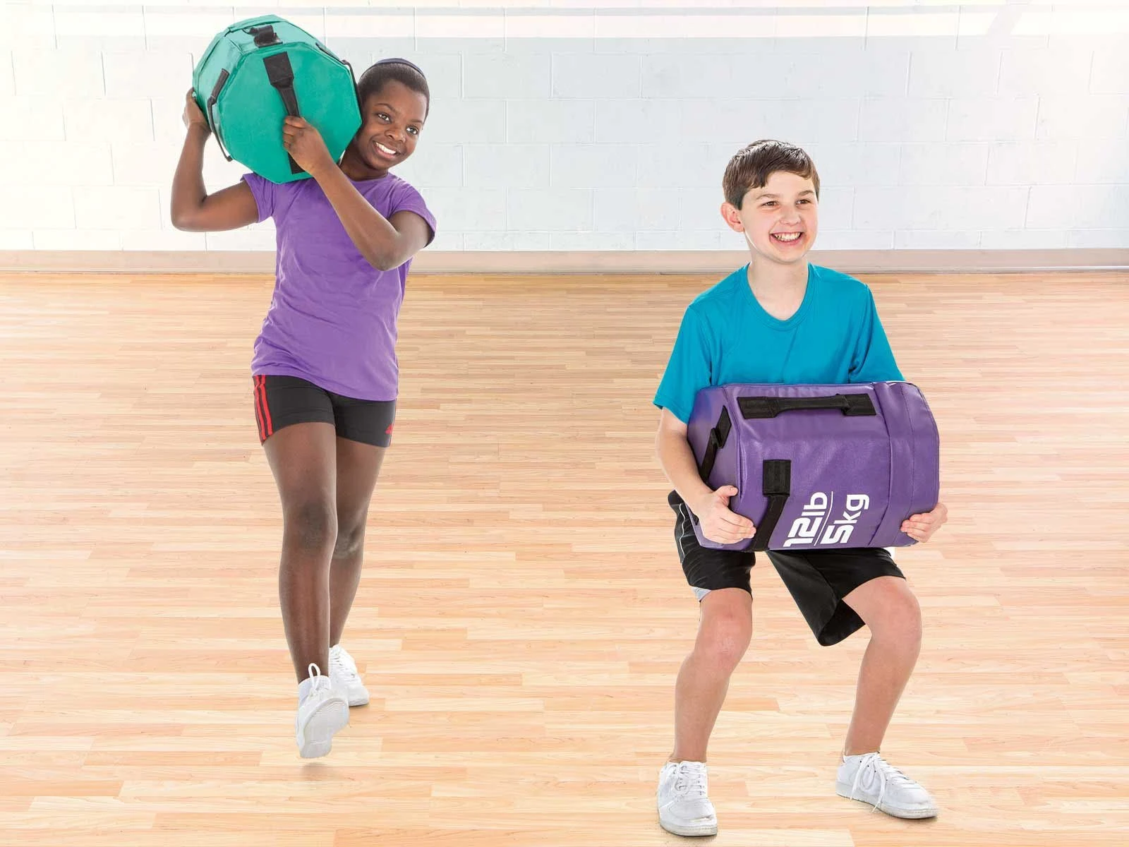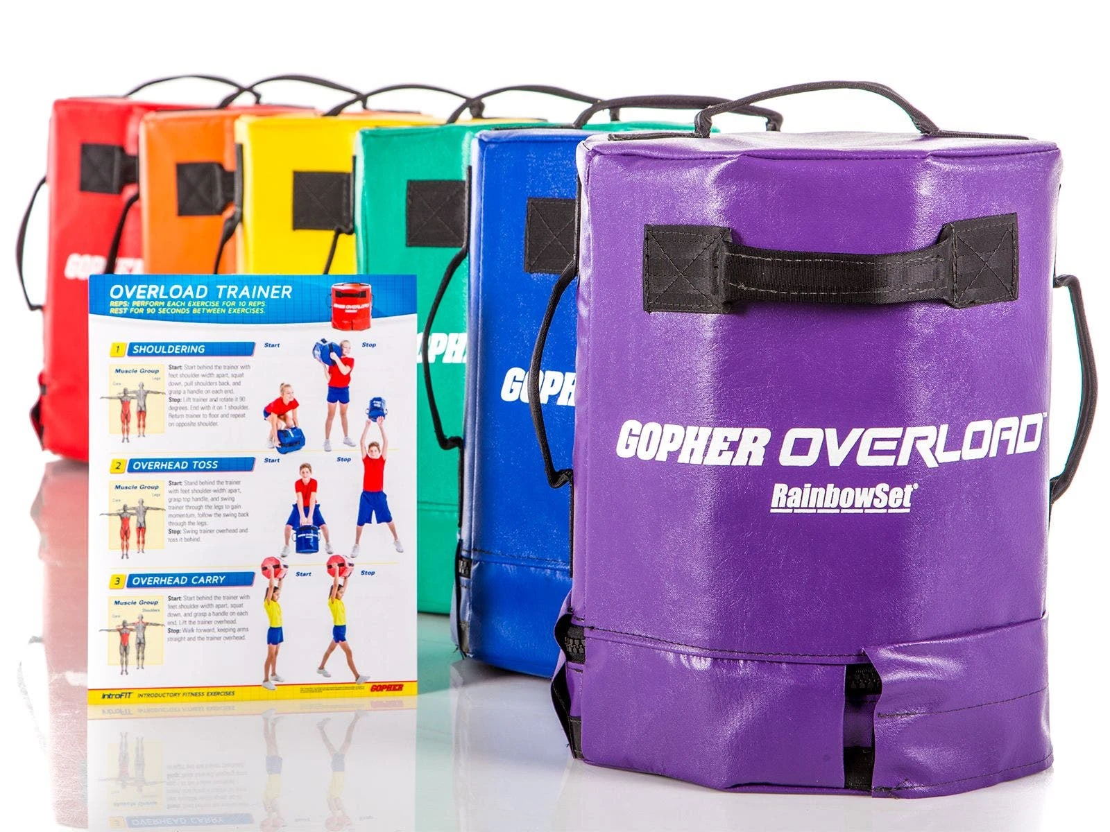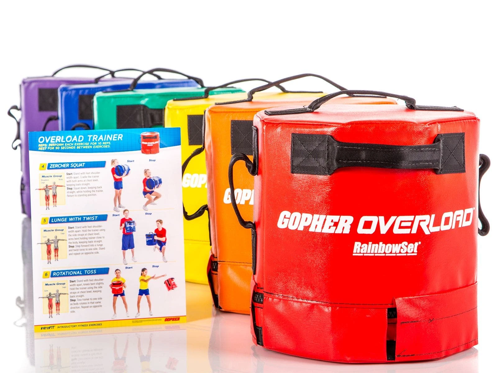 We took our OverLoad trainer and scaled it back to introduce beginner athletes to strongman routines. These trainers feature a smaller octogonal shape and lightweight design to help beginners develop core muscles and focus on proper form. Six seatbelt-grade nylon handles allow students to perform shoulder carries, overhead tosses, lunges, and more without the trainer falling or slipping. Dense inner foam and 16 oz antimicrobial vinyl cover are safe for students and floors. Green, 6 lb, 12″H x 11″W. Blue, 12 lb, 14-1/2″H x 11″W. Set includes 6 trainers and a laminated exercise guide.