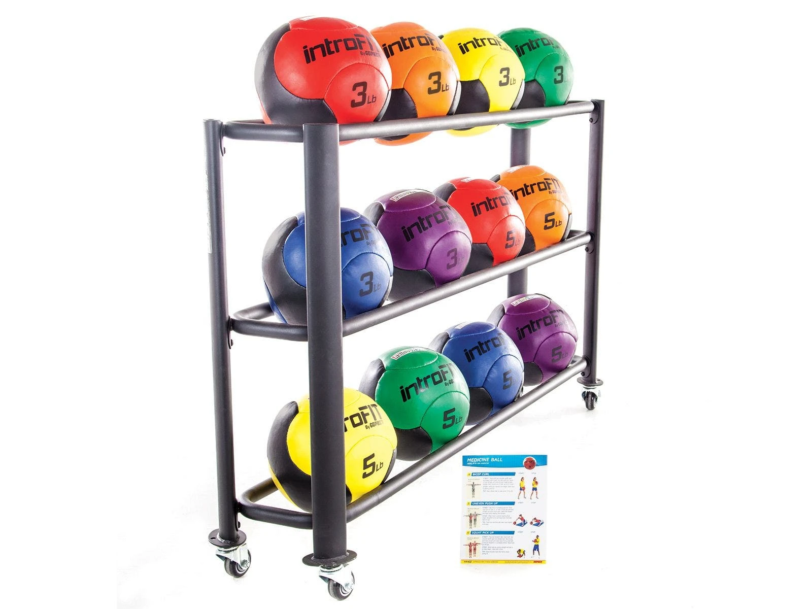 - Rainbow Pack. Includes 12 medicine balls (6 ea 3 lb, 5 lb), a laminated exercise guide, and an UltraFit Steel Oversized Medicine Ball Rack