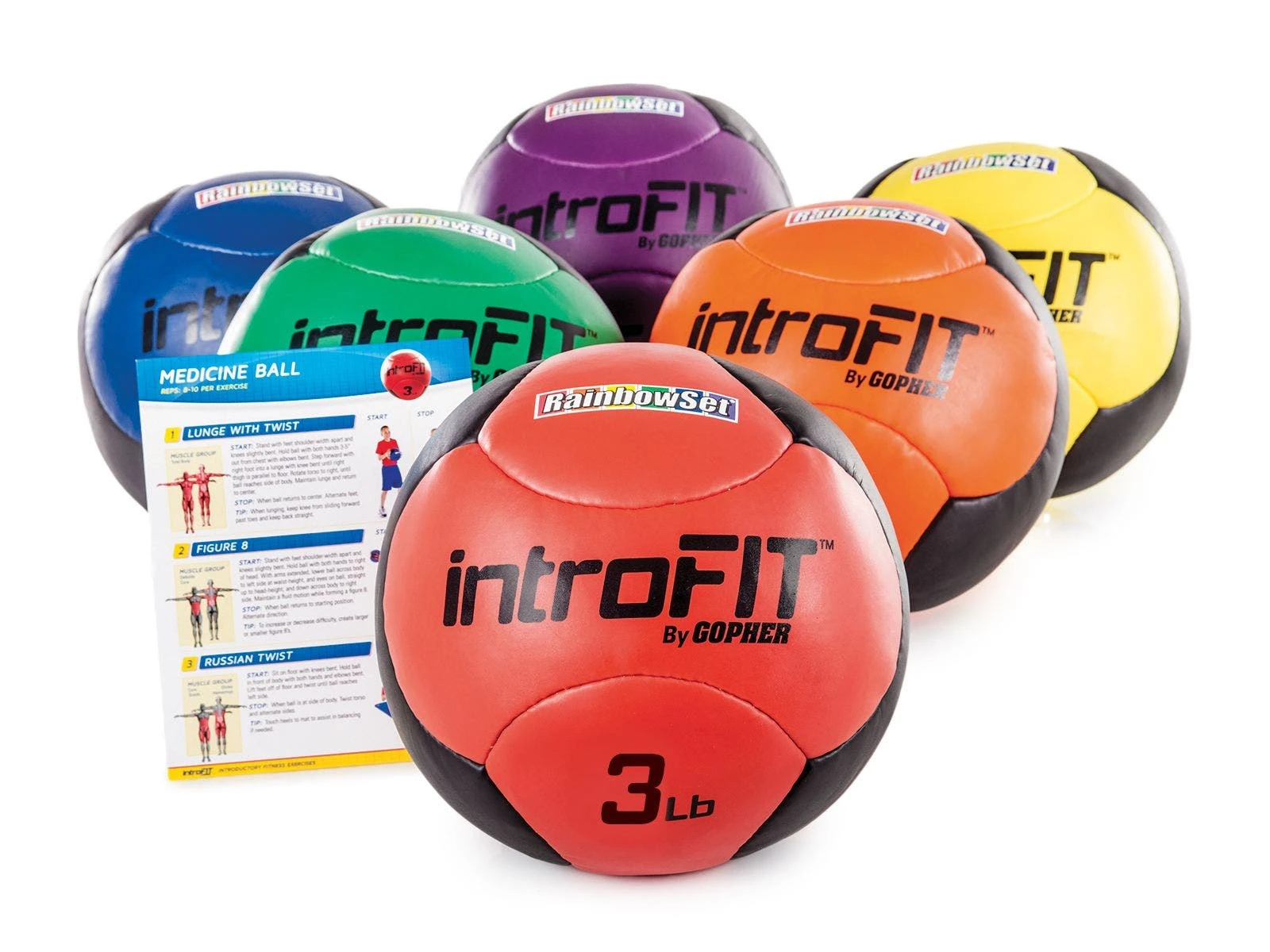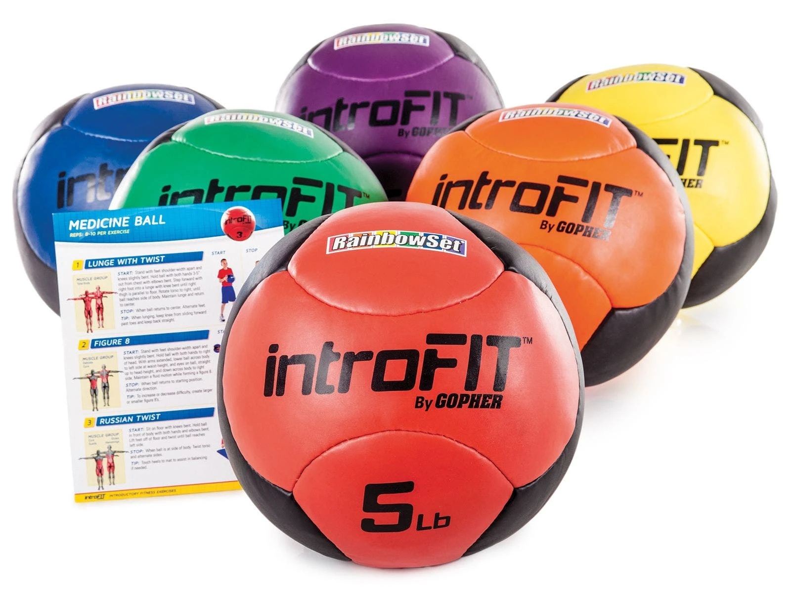 - Rainbow Sets. Include 6 medicine balls and a laminated exercise guide.