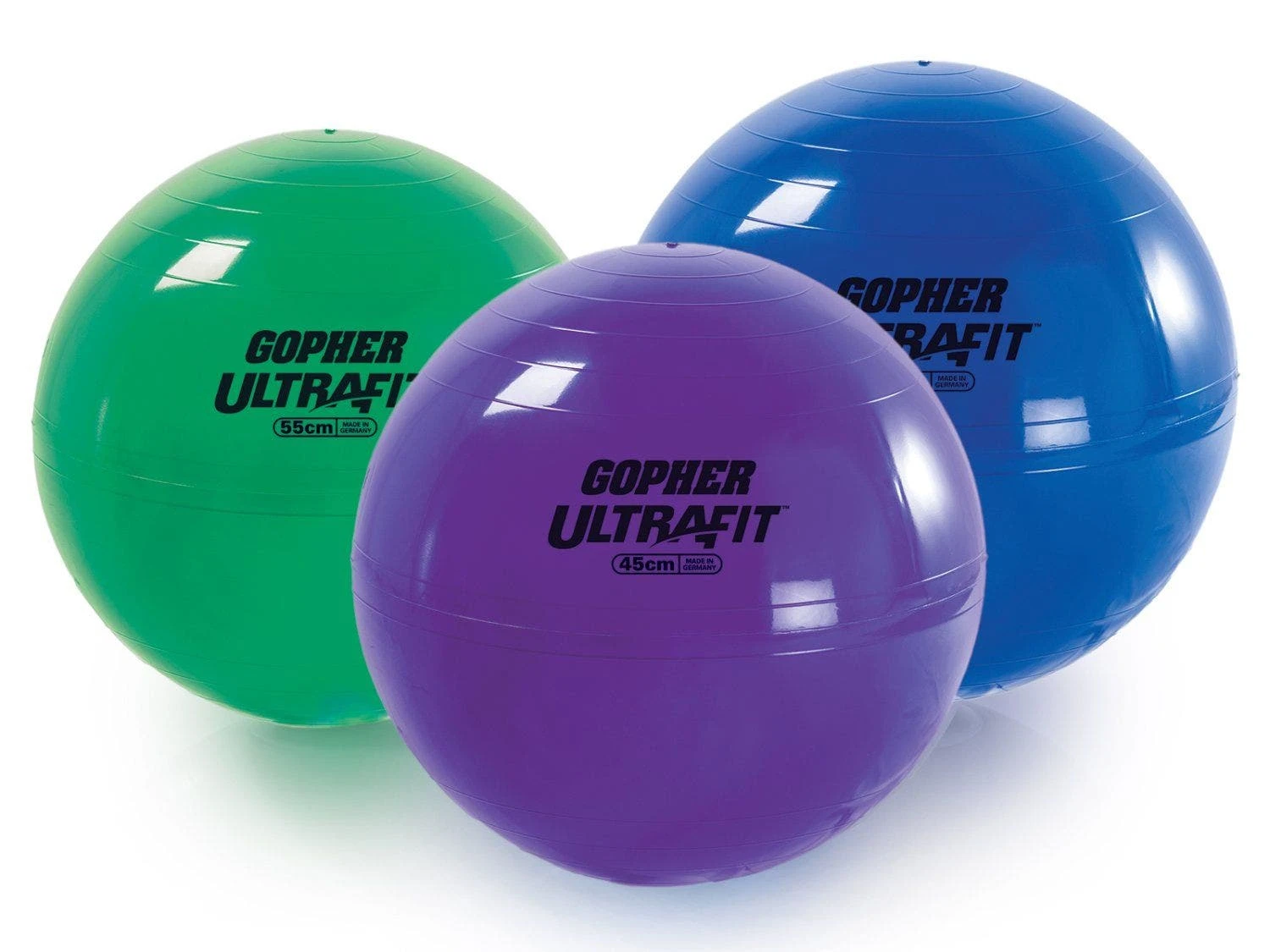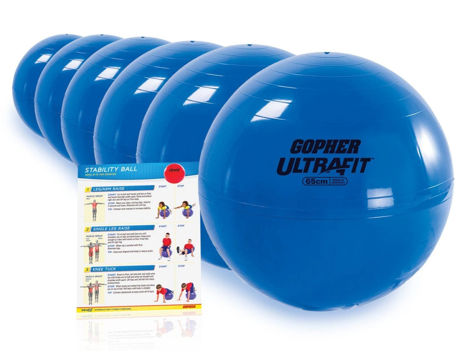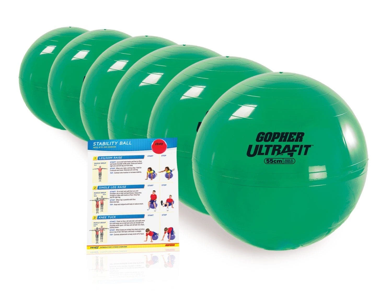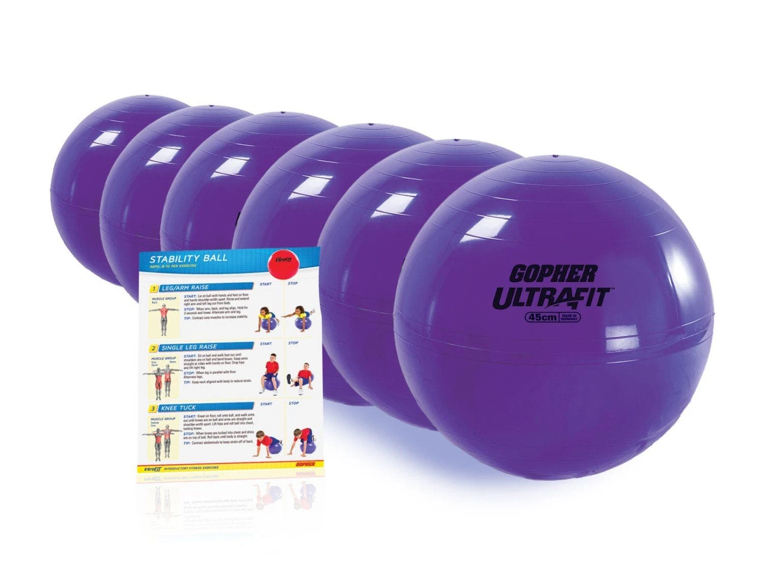 Supports up to 330 lb. Complete Set includes 6 stability balls and a laminated exercise guide.