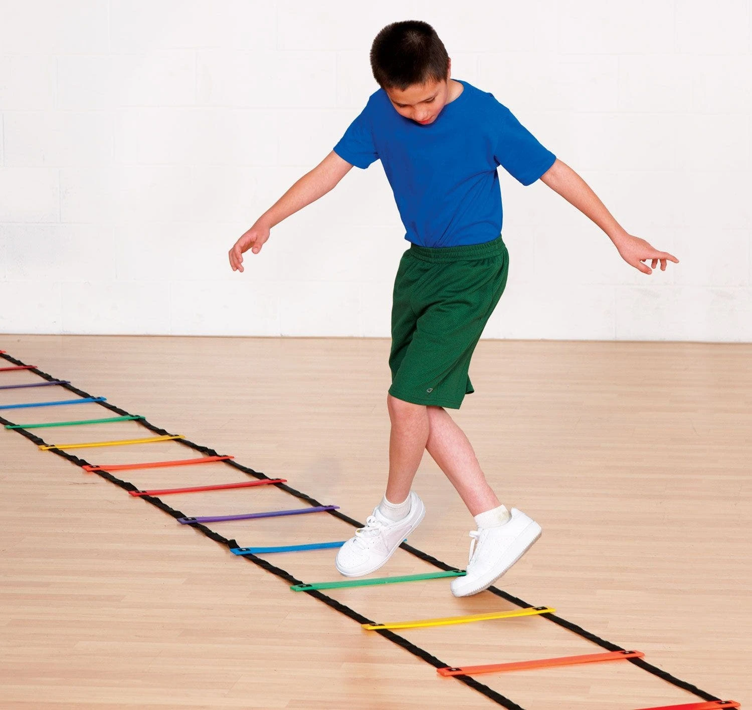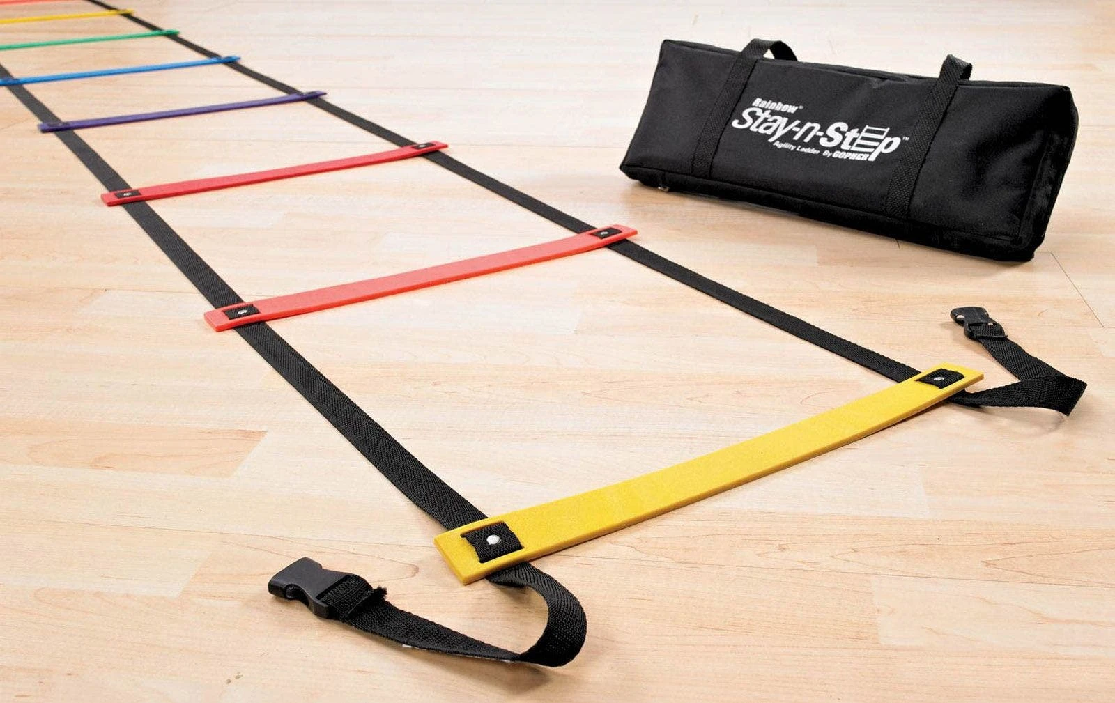 Tacky-bottom flat rungs don’t skid or slide, even on a clean gymnasium floor, delivering safety and performance for your class. Constructed with tough, polyethylene webbing for long-lasting strength, these ladders hold up to constant drills and exercises.