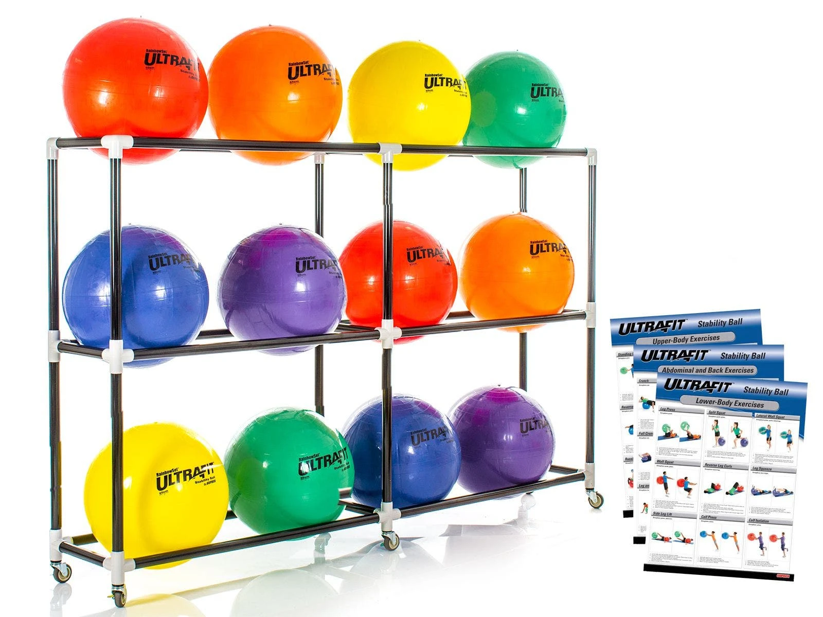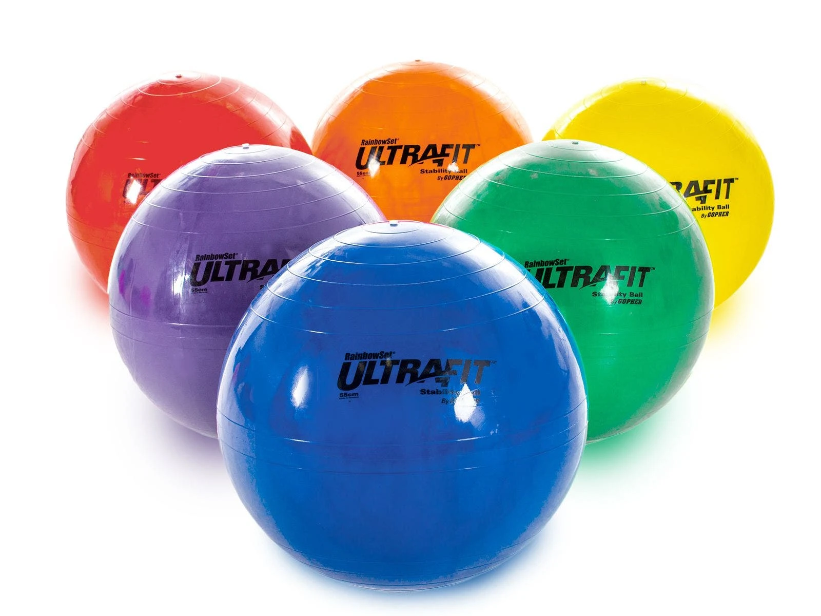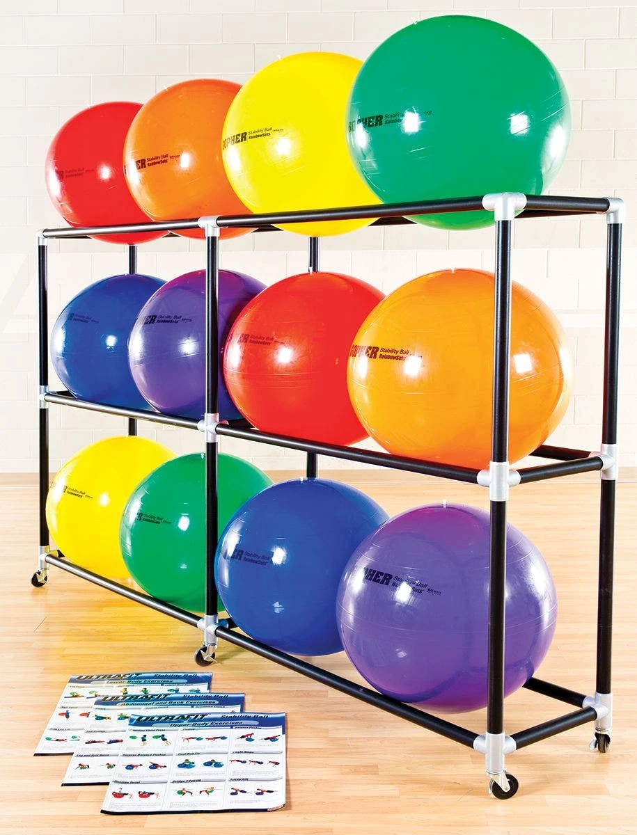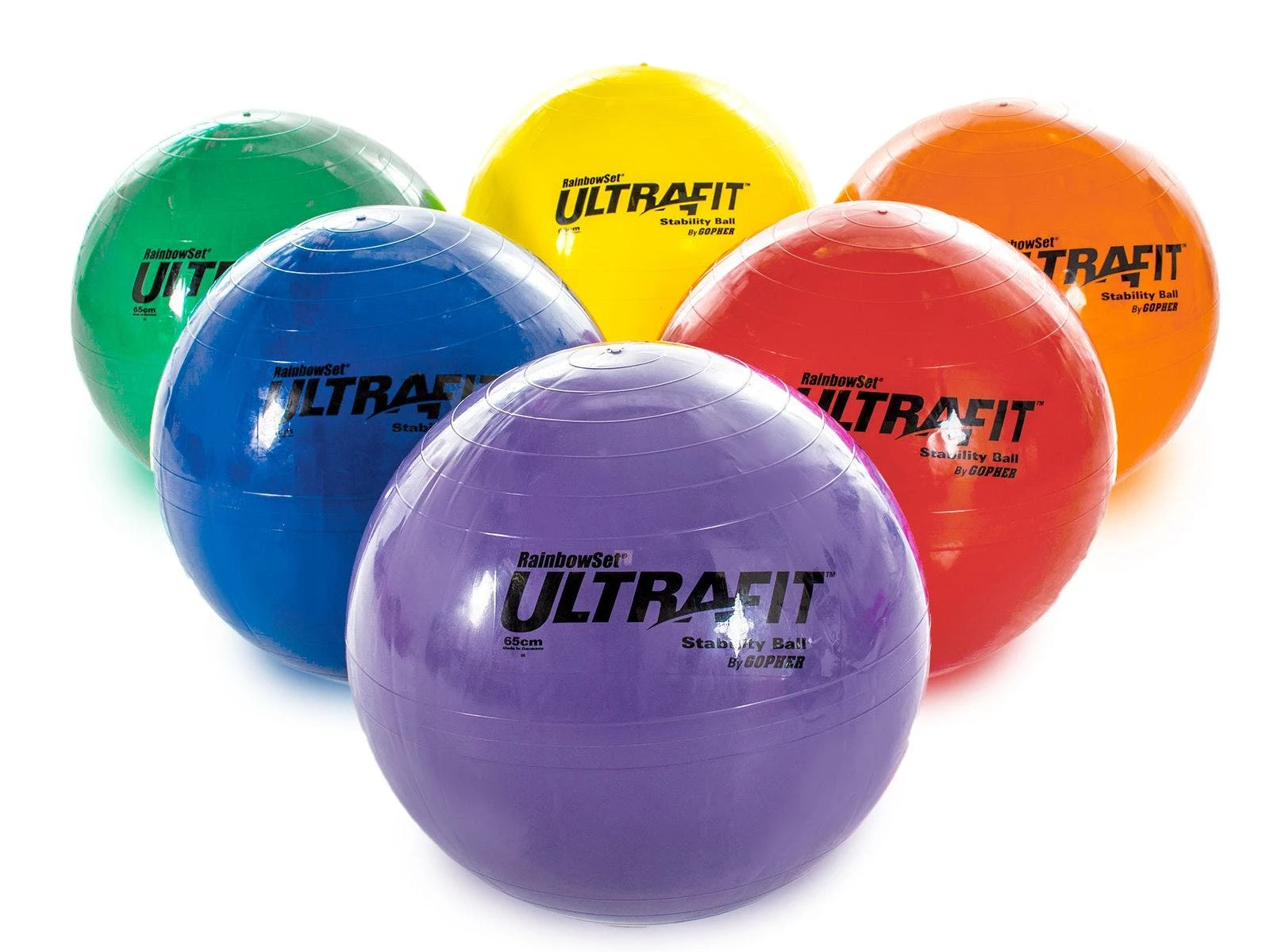 Rainbow colors make class organization simple, with packs and colors to support entire classes as you get the most out of exercises and ball activities. A European construction and extremely durable design support up to 220 lb! Build core, lower-body, and upper-body muscle strength using a range of stability ball exercises, while also increasing balance and coordination. Exercises allow users to focus on abs, back, hips, and more, with low-impact.