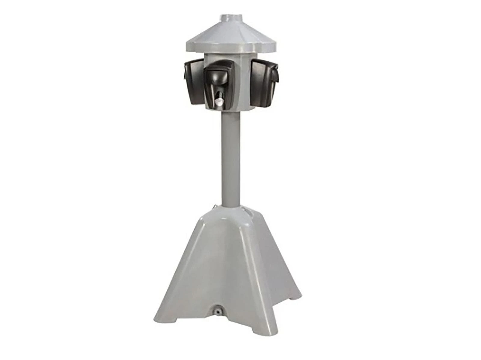 Durable stand is built to hold 4 dispensers, making it a great option for high-traffic areas. Weighing only 30 lb when empty, add up to 23 gallons of water or sand to the base for enhanced stability. Each 30 oz dispenser has a large viewing window to quickly monitor sanitizer levels. Lock the stand canopy and dispensers for security.