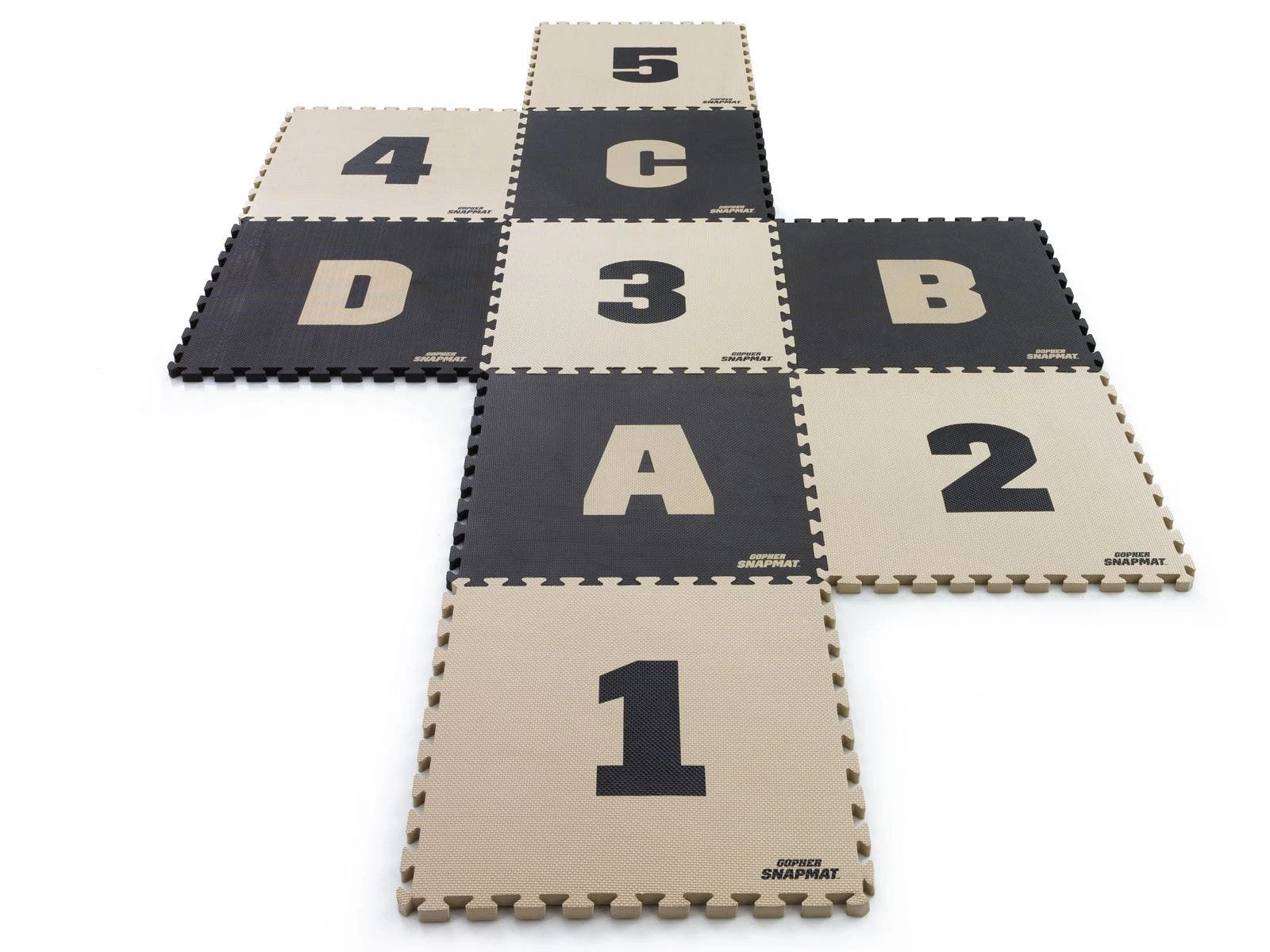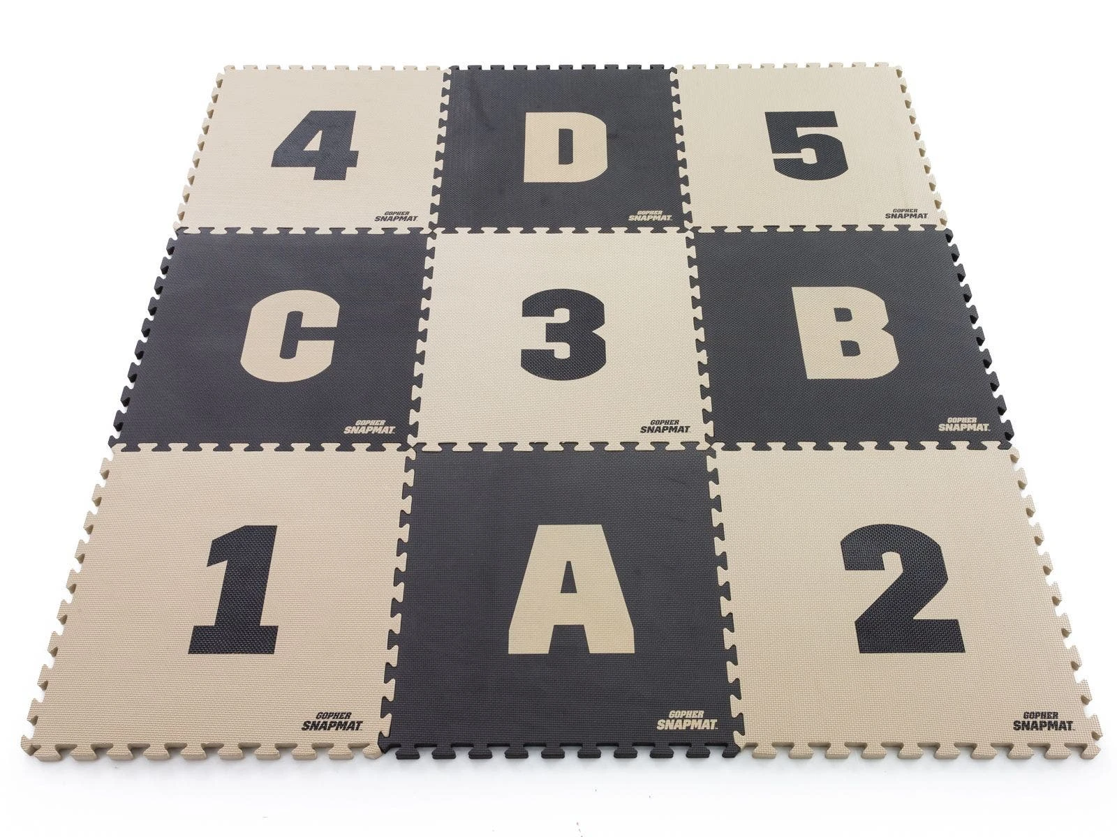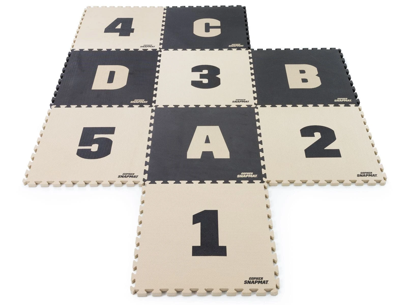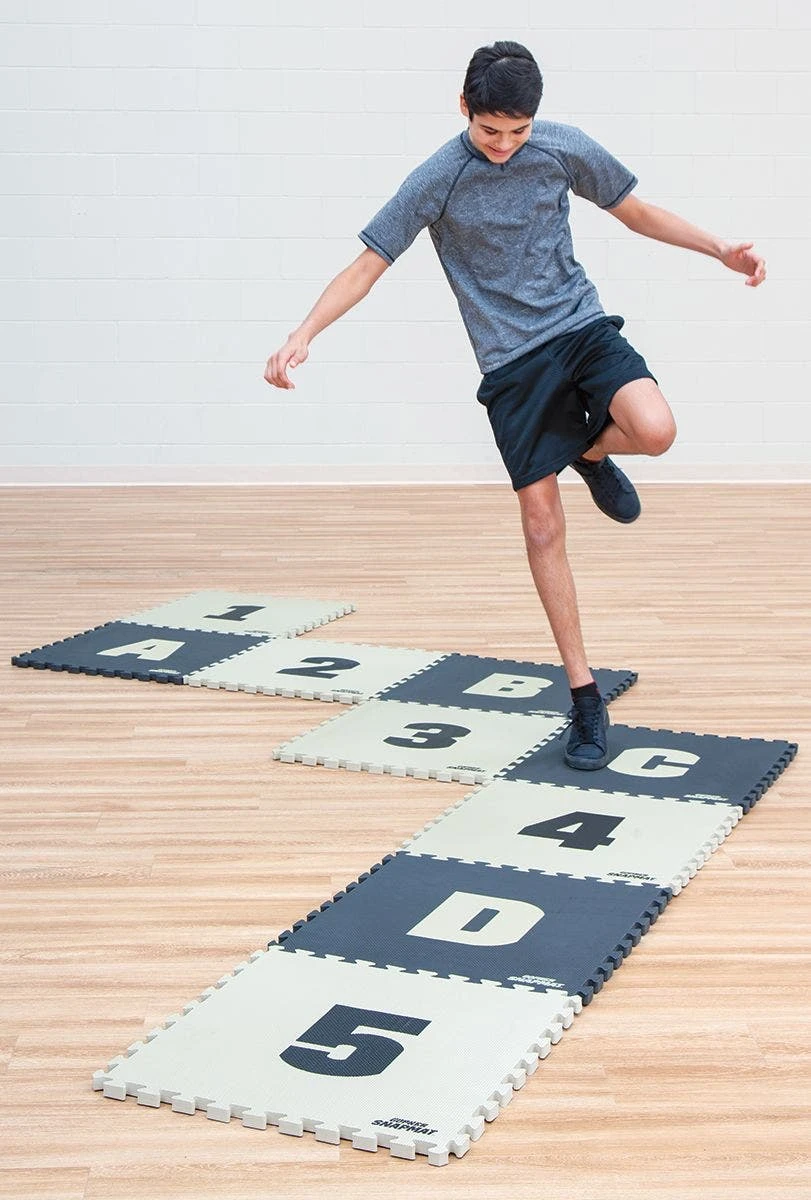 Foam mat segments featuring letters and numbers quickly snap together to form courses for versatile agility games and drills! Puzzle-piece edges easily interlace for a fast connection and reconfigure in seconds to keep athletes moving in all directions. Durable EVA foam rubber is lightweight for easy transport yet durable enough to withstand repeated footfalls in institutional settings. The combination of letters and numbers allows instructors to add depth to numerous games and drills. Includes 4 black tiles with tan letters (A-D) and 5 tan tiles with black numbers (1-5). Each tile is 23″ sq x 1″ thick. Set is 11½ lb.