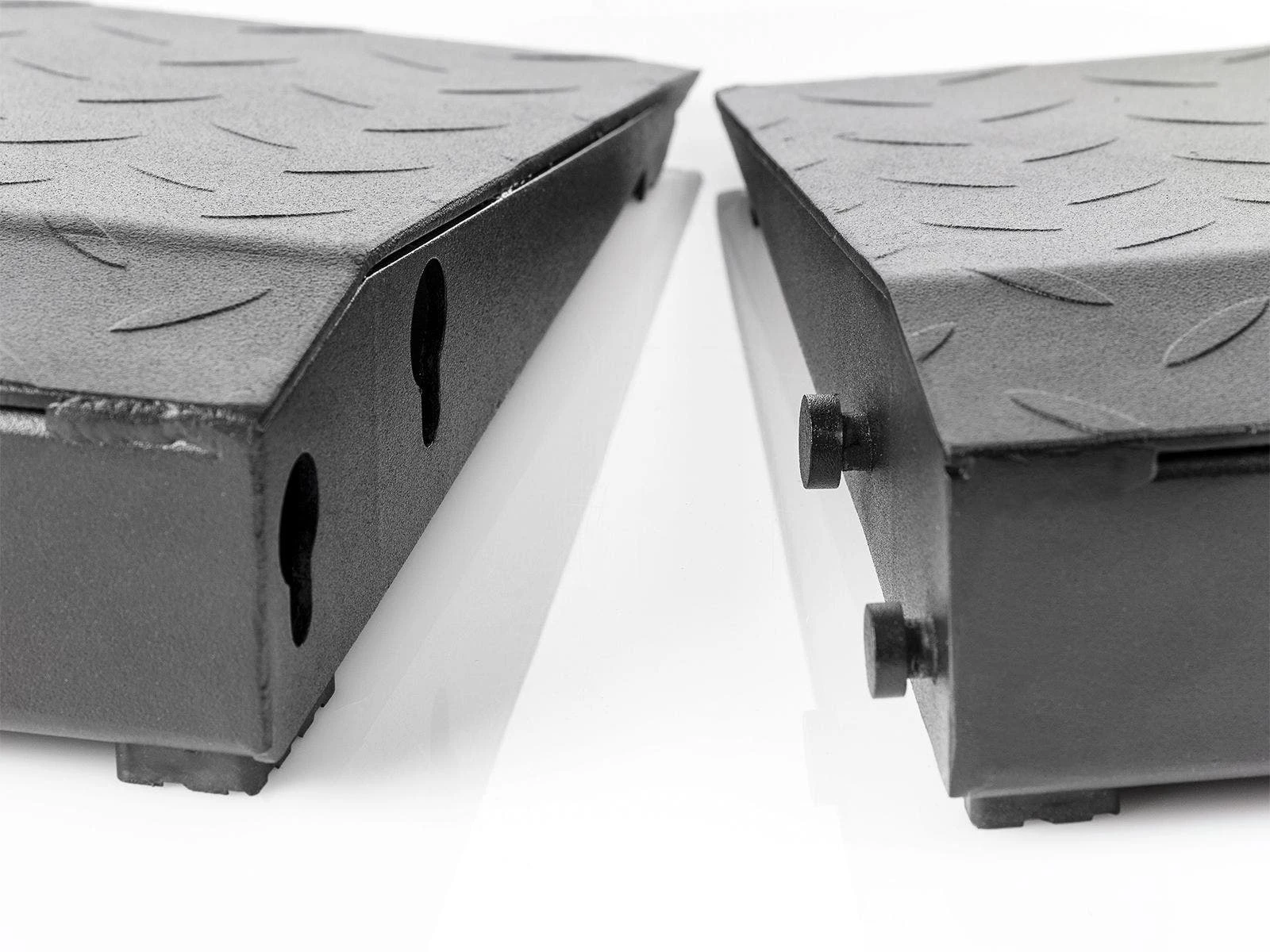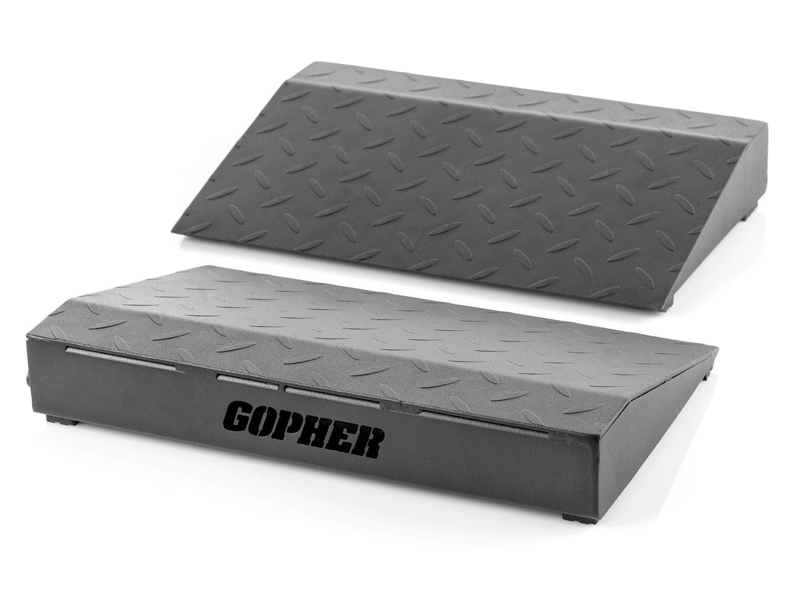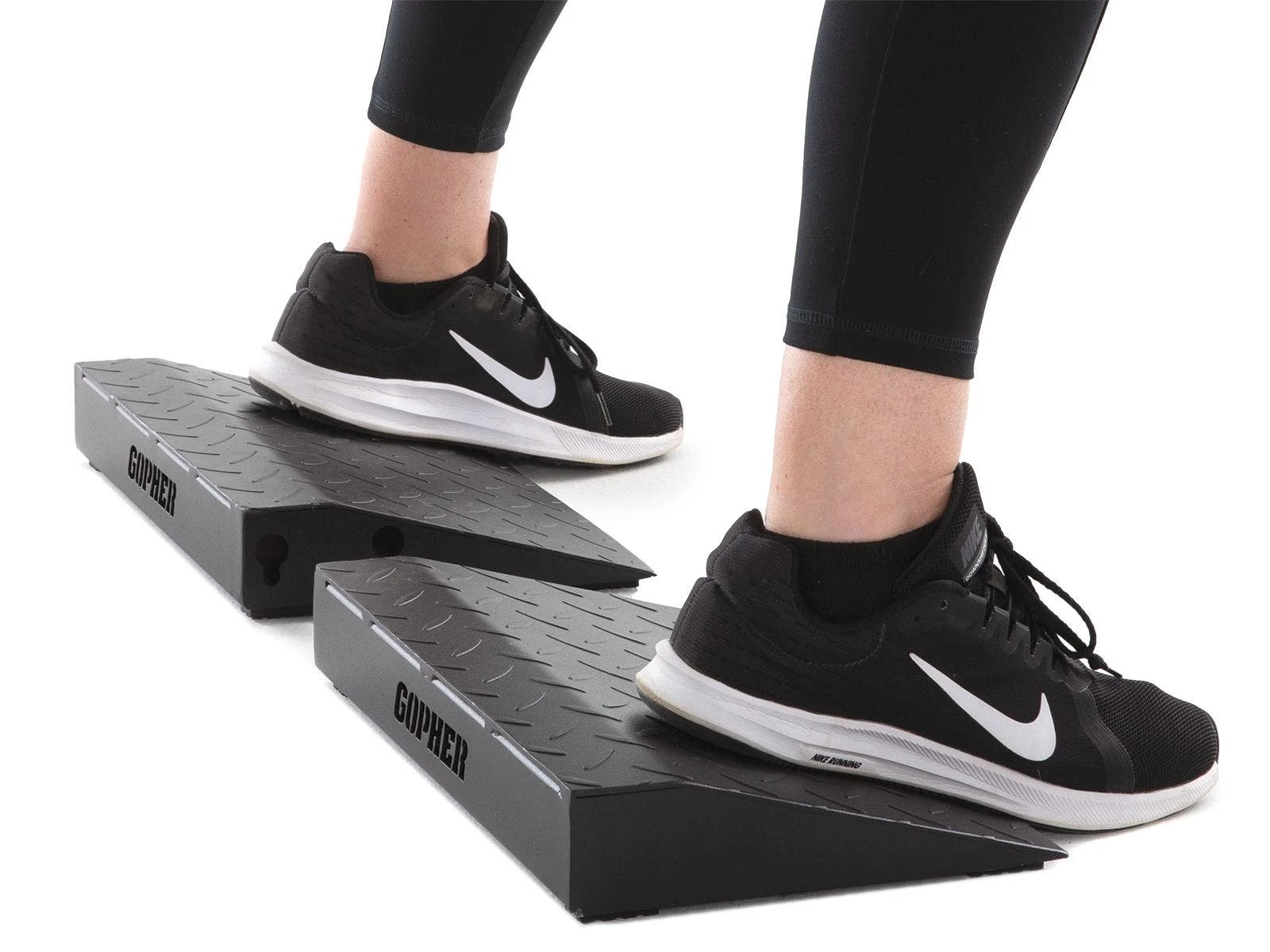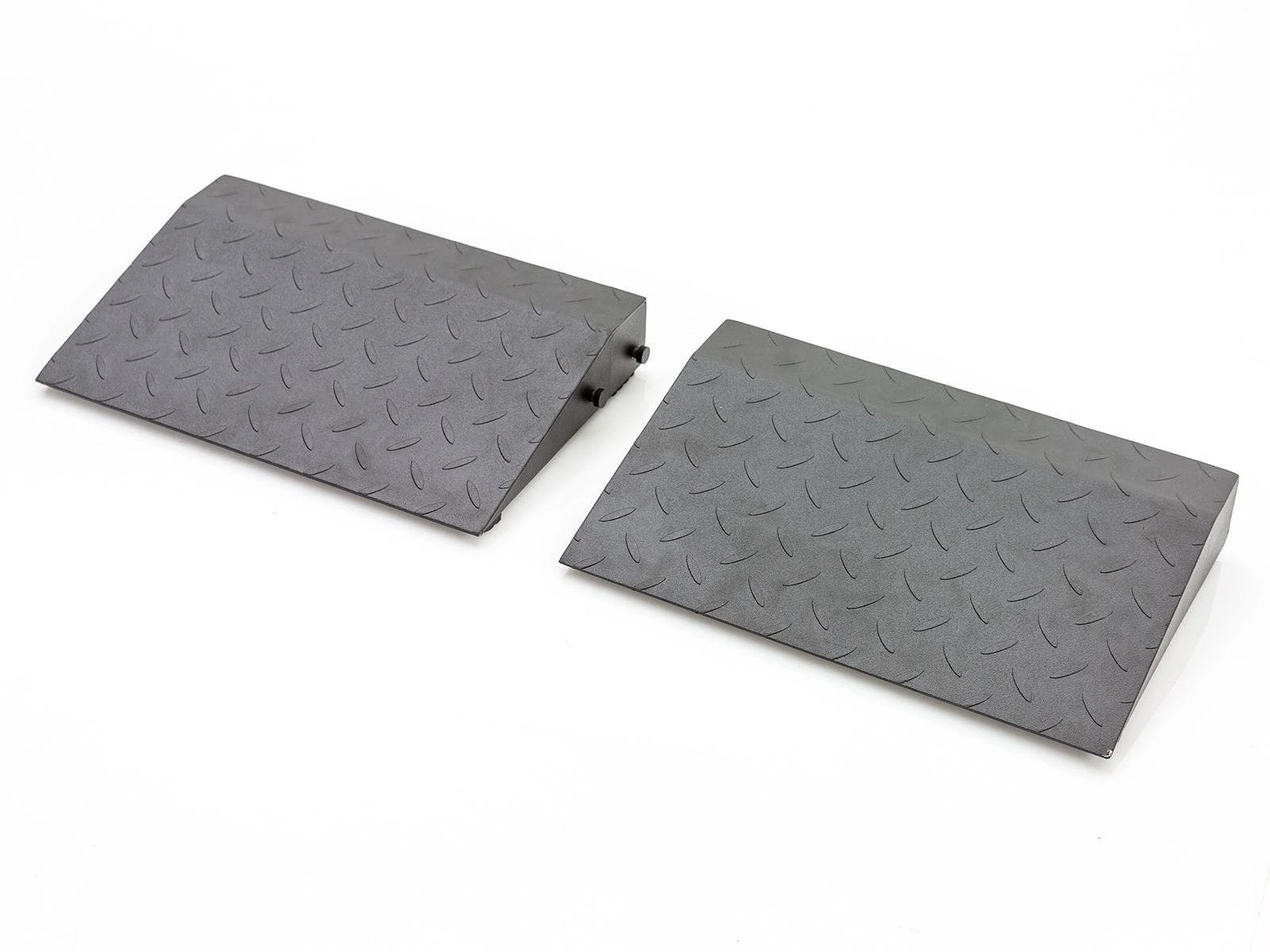Elevate your heels with this heavy-duty steel wedge to improve squat form and hit better positions. The ramp separates into two pieces for optimal foot placement for any user and any stance—wide or narrow. This unique adjustability allows users to find a squat stance that works best for them individually. The treaded surface keeps feet securely planted, while rubber underneath protects flooring during use. Supports up to 2,200 lb. 28”L x 9”W x 2”H when connected; 16-1/2 lb.