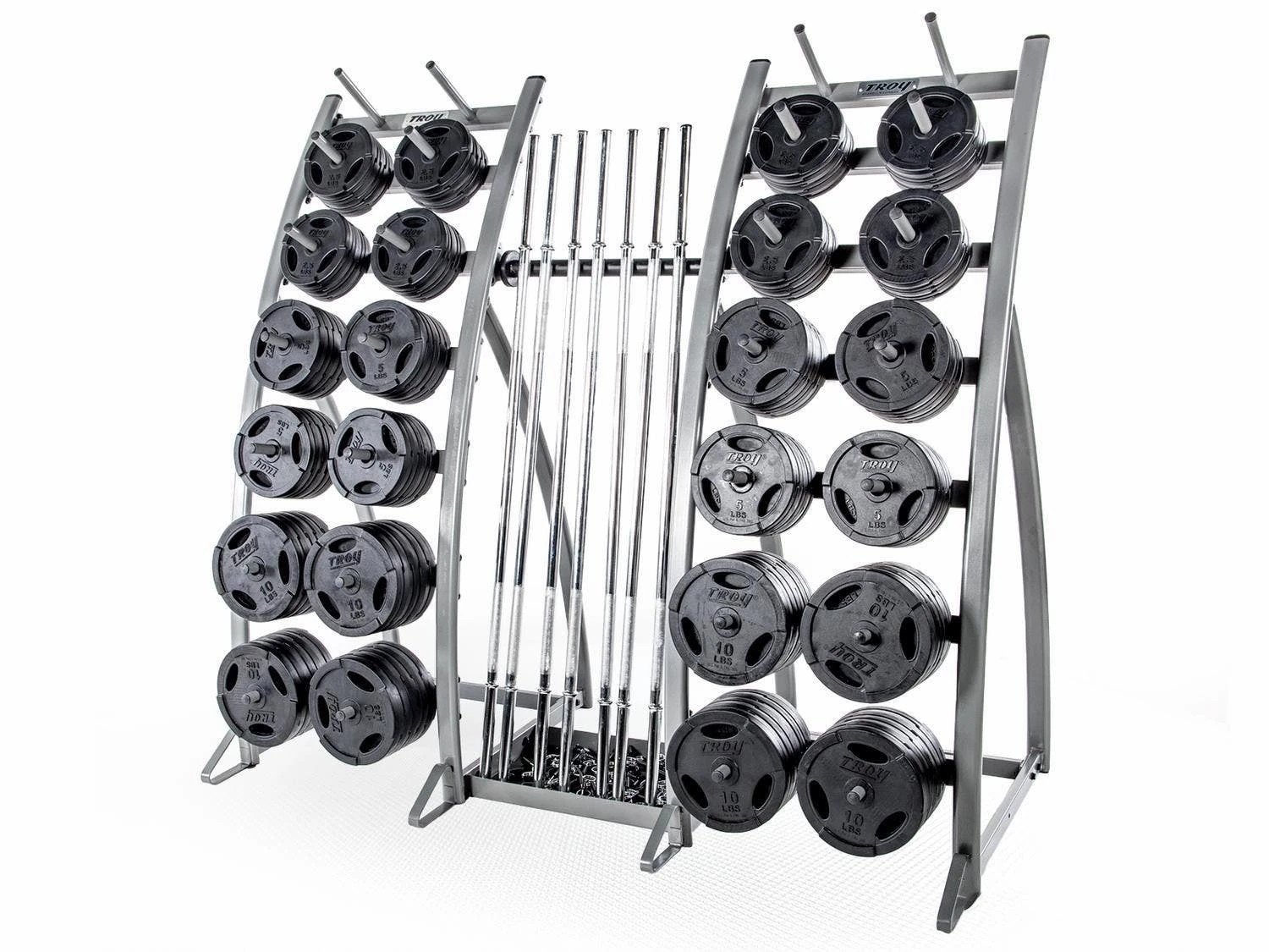 Steel weight plates are quieter and easier on floors. Special cut-outs in the plates make for easy on/off. Spacious rack design is easier for users to access equipment or put it away. Pack includes 20 lightweight 4’6″L bars, 20 pair of bar collars, 120 weight plates (40 ea of 10, 5 and 2.5 lb) and powder-coated stationary steel rack. 925 lb total. Rack is 65″L x 29″W x 58″H.